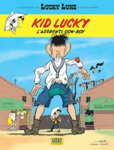 Chemise jaune, foulard rouge, mèche rebelle et brin d’herbe à la bouche : le Kid porte déjà la panoplie complète de Lucky Luke, en format réduit. Armé d’un lance-pierre et d’un lasso, il affronte des apprentis gangsters et fait tourner en bourrique ses camarades de classe — notamment Martha, Hurricane Lisette et Joanie Molson. La série (5 tomes publiés entre 2011 et 2019) est clairement destinée aux jeunes lecteur·ices et ne prétend pas rivaliser avec les albums classiques. Elle offre cependant un bon point de départ pour les plus petit·es qui voudraient découvrir l’univers du Far West avant de passer aux albums de la série principale.
