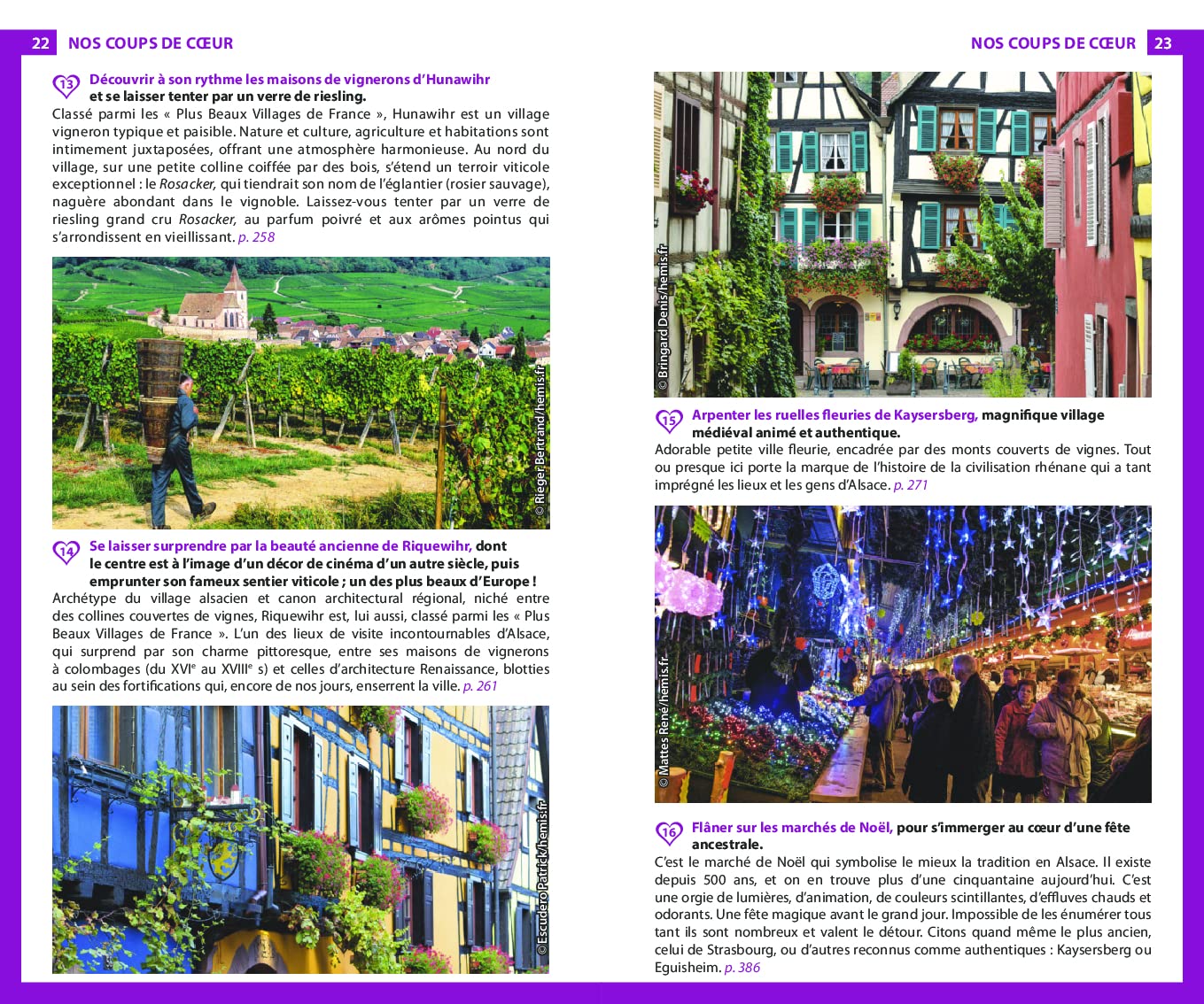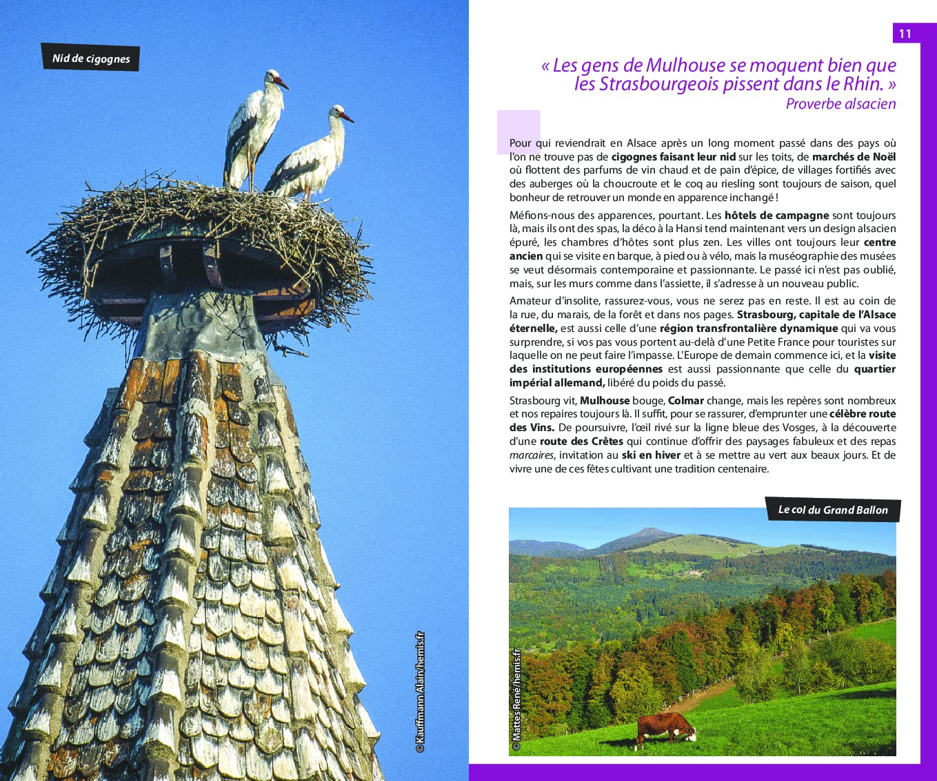- Les Vosges, la plaine d’Alsace, la route des vins, les grandes villes culturelles comme Strasbourg ou Colmar… tous les incontournables des deux départements alsaciens (Haut-Rhin et Bas-Rhin) traités en profondeur.
