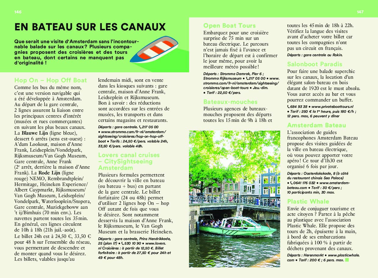 Pour une expérience authentique, les auteurs recommandent de dormir sur une péniche et proposent des itinéraires de promenades le long des canaux du Siècle d’or ou dans le quartier branché du Noord.