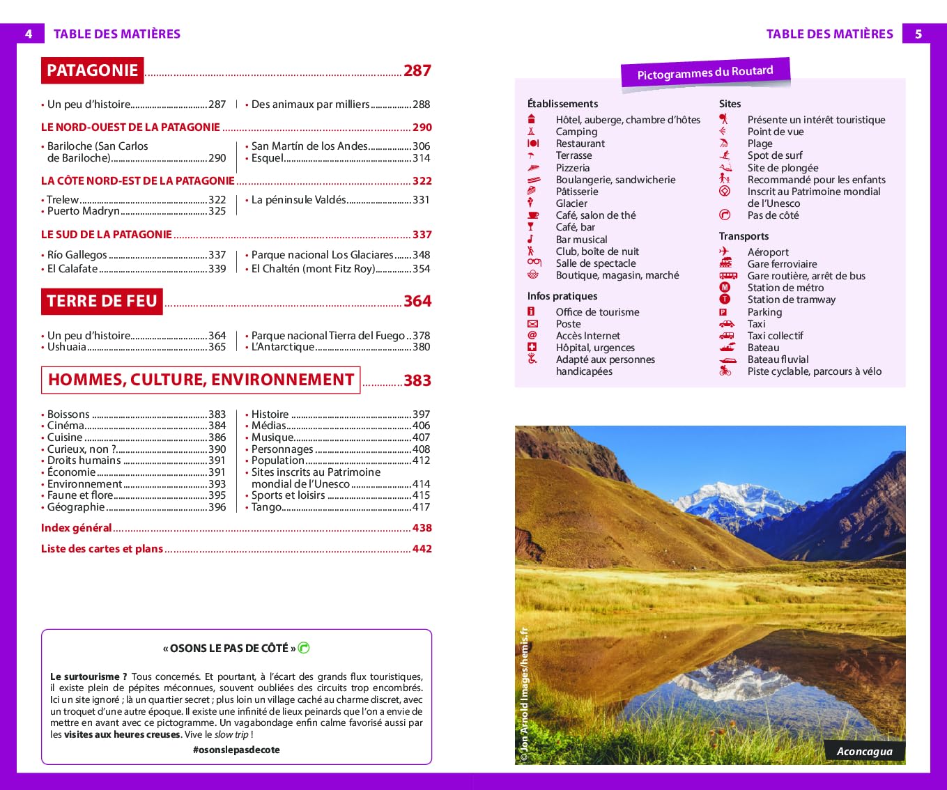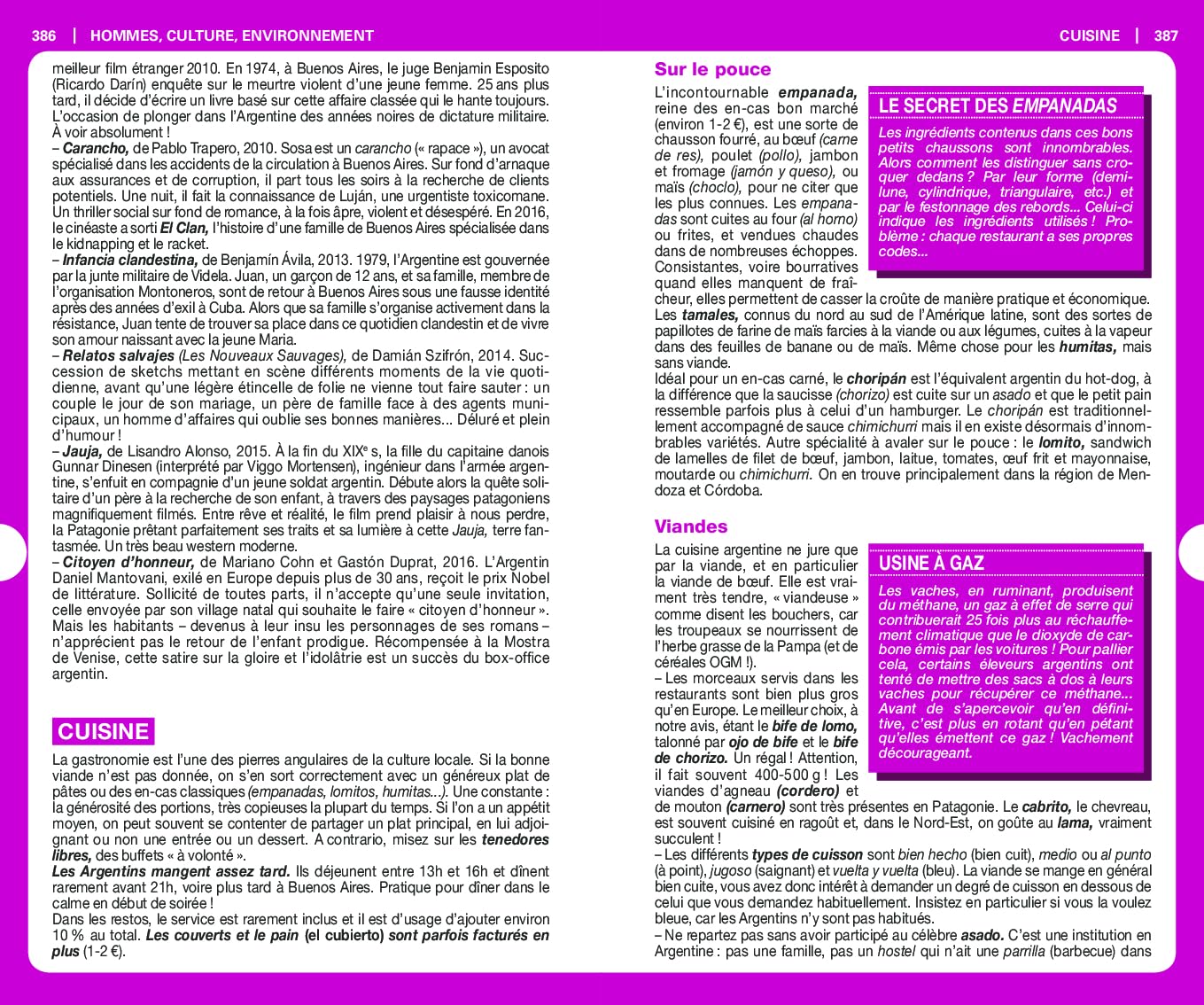 Un chapitre est spécialement dédié aux activités en plein air comme la randonnée, l’alpinisme, le rafting ou encore la pêche. La cuisine argentine, des traditionnels barbecues aux formules végétariennes en passant par le fameux maté, est également mise à l’honneur. Sans oublier des suggestions en matière de logement et de restauration.