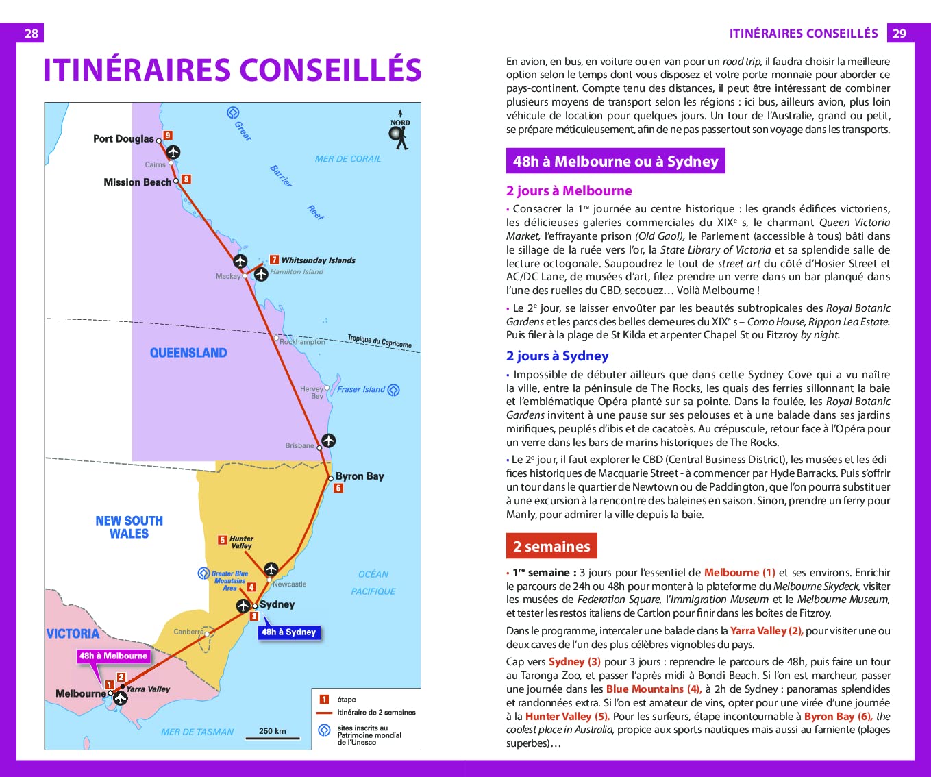Ils suggèrent aussi quatre itinéraires passionnants – géographiques et thématiques – accompagnés d’informations et de conseils pour profiter pleinement de votre séjour. De nombreuses activités pour tous les goûts, telles que surfer à Bondi Beach ou admirer les Twelve Apostles, sont évidemment proposées.