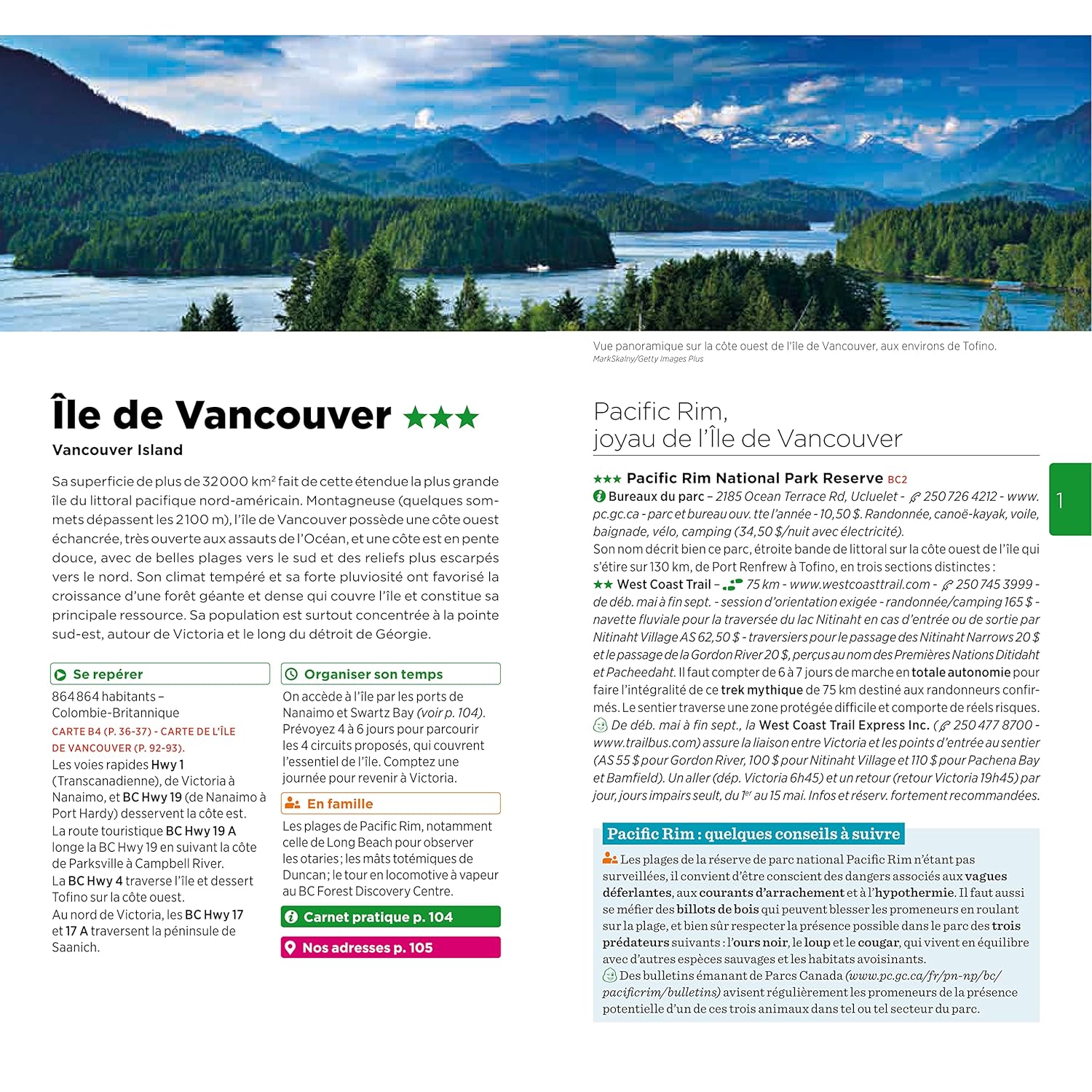 Des adresses abordables pour manger, boire un verre, faire du shopping ou se loger sont également indiquées. Pour faciliter les déplacements, de nombreuses cartes sont incluses, ainsi que plusieurs itinéraires, par exemple de la côte pacifique à la chaîne côtière en 21 jours.