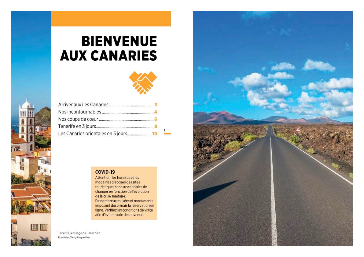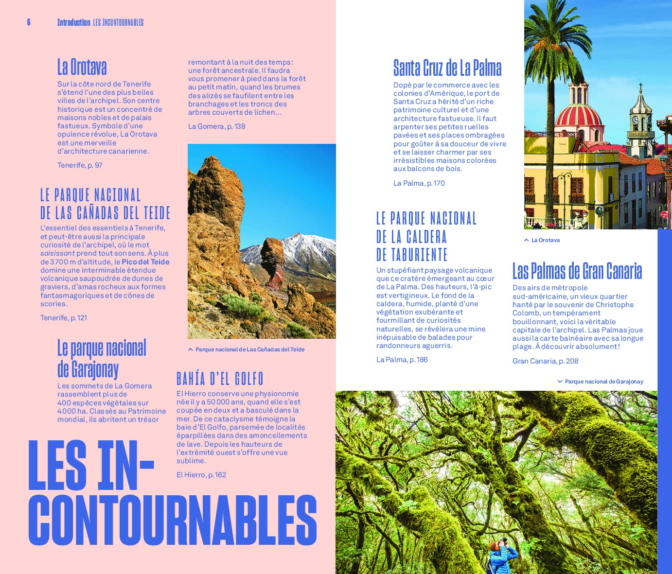- Une première partie en couleurs pour découvrir les îles Canaries à l’aide de photos et de cartes illustrant les coups de cœur de nos auteurs ;