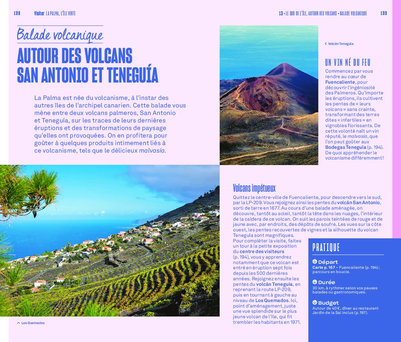 - Un découpage de l’île en six chapitres, avec un traitement approfondi du Nord, moins fréquenté et plus authentique : Santa Cruz de Tenerife la dynamique capitale, La Laguna superbe ville coloniale classée au patrimoine mondial de l’Unesco, Puerto de la Cruz charmante cité balnéaire, La Orotova autre très belle ville coloniale. Mais aussi la côte Sud et ses grandes plages de sable blond : Playa de las Américas et Costa Adeje les hauts lieux balnéaires, Los Cristianos la destination familiale par excellence.