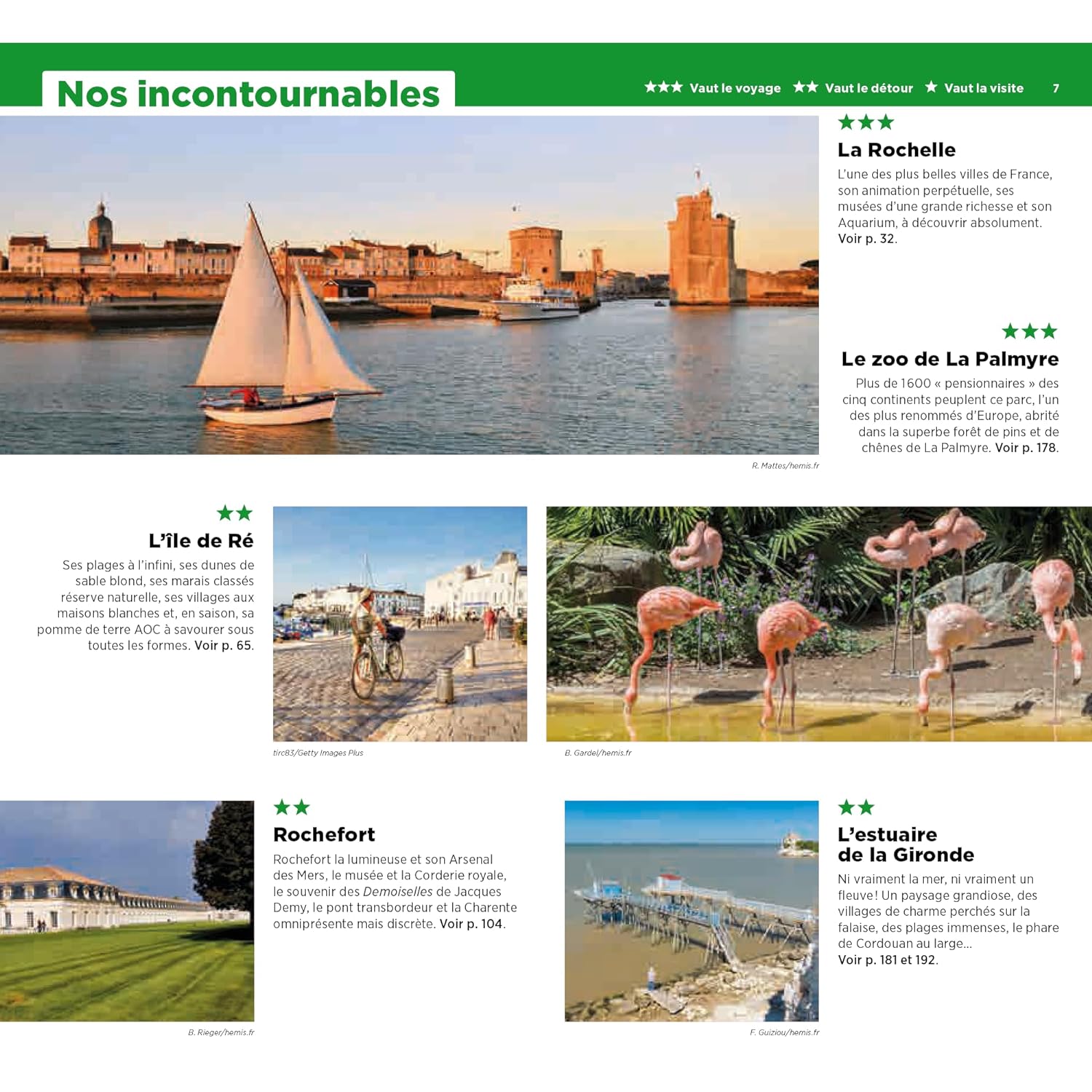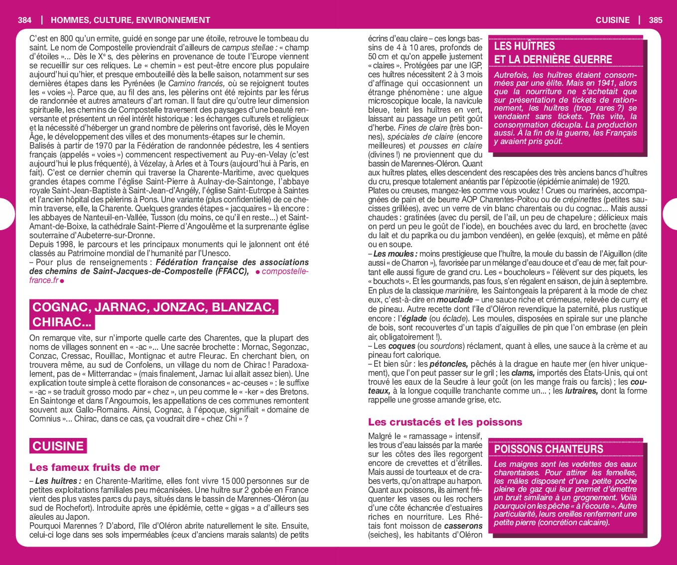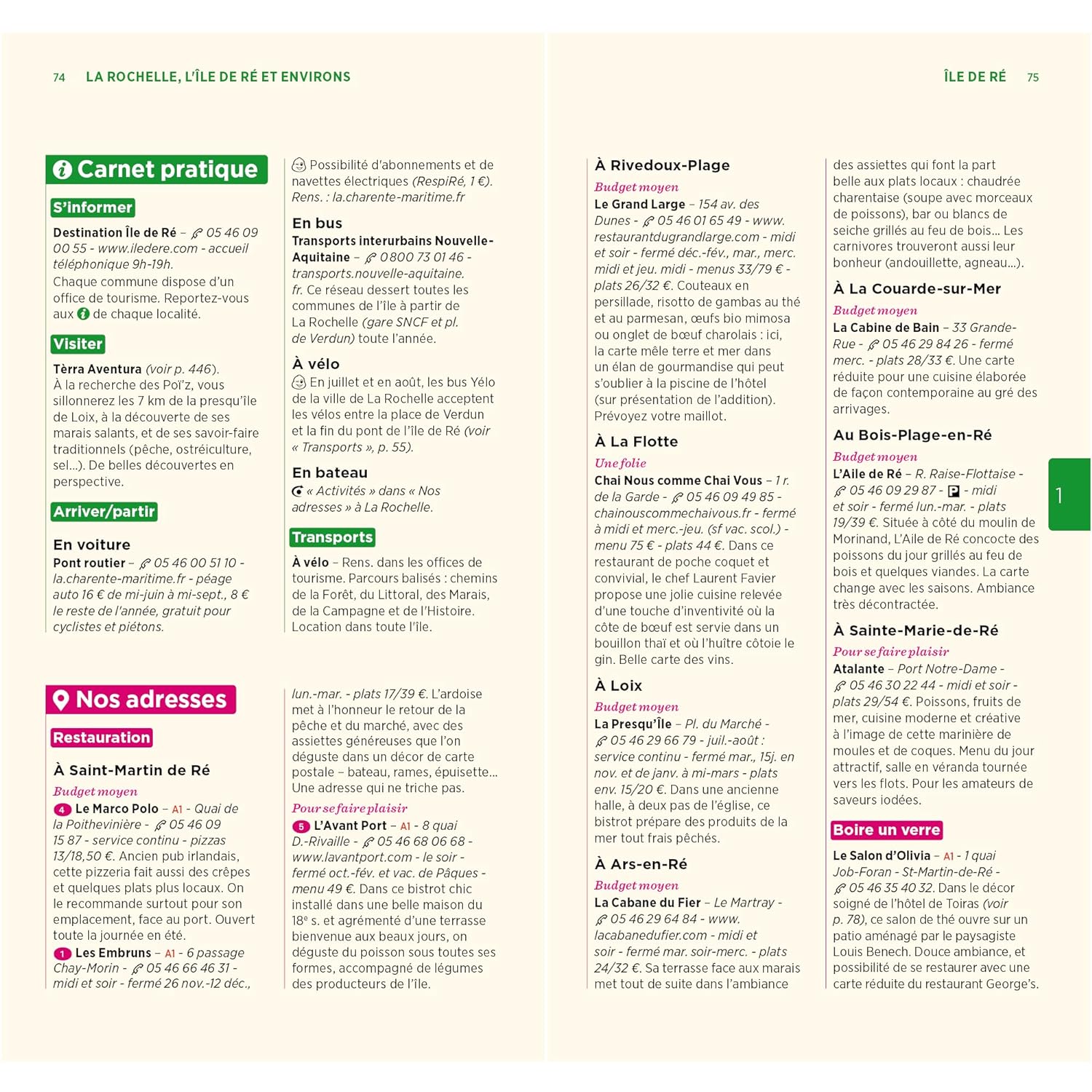 Le guide renferme également de précieux renseignements sur les lieux gourmands, où vous pourrez savourer les délices du terroir tels que les huîtres de Marennes. Les auteurs mettent également en lumière les sites culturels de la région, avec de nombreuses anecdotes sur les églises romanes de la Saintonge ou l’histoire de La Rochelle.