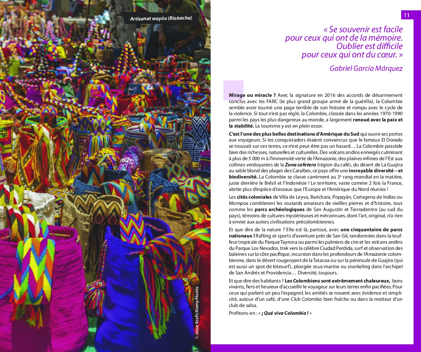 Ils dressent un portrait des principaux attraits touristiques du pays, notamment ses vestiges archéologiques fascinants ou l’architecture de ses villes pittoresques comme Carthagène. Au fil des pages, les auteurs partagent leurs coups de cœur et vous invitent à la rencontre du peuple colombien, généreux et accueillant.