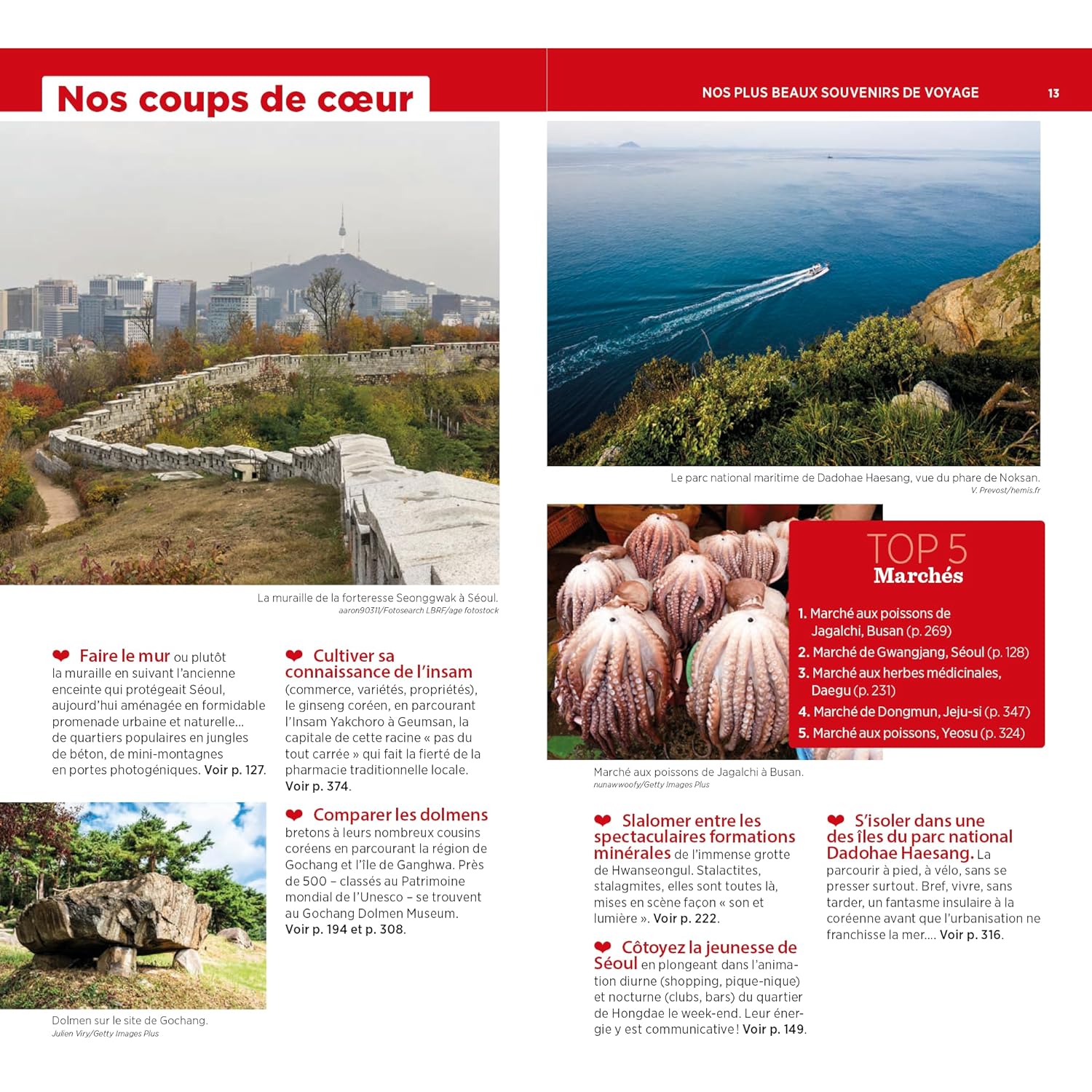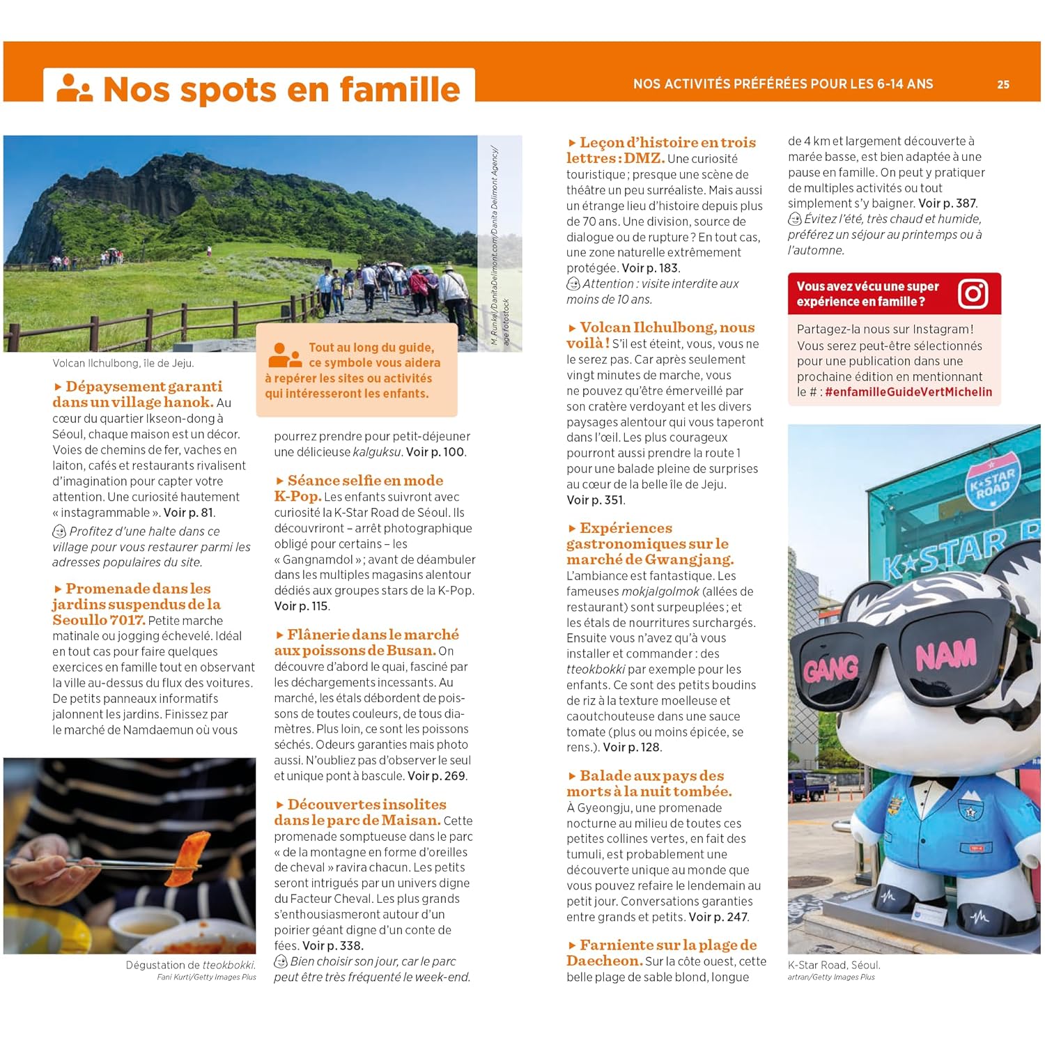 - Les meilleurs spots en famille (activités pour les 6-14 ans) : Dépaysement garanti dans un village hanok ; Expériences gastronomiques sur le marché de Gwangjang ; Découvertes insolites dans le parc de Maisan…