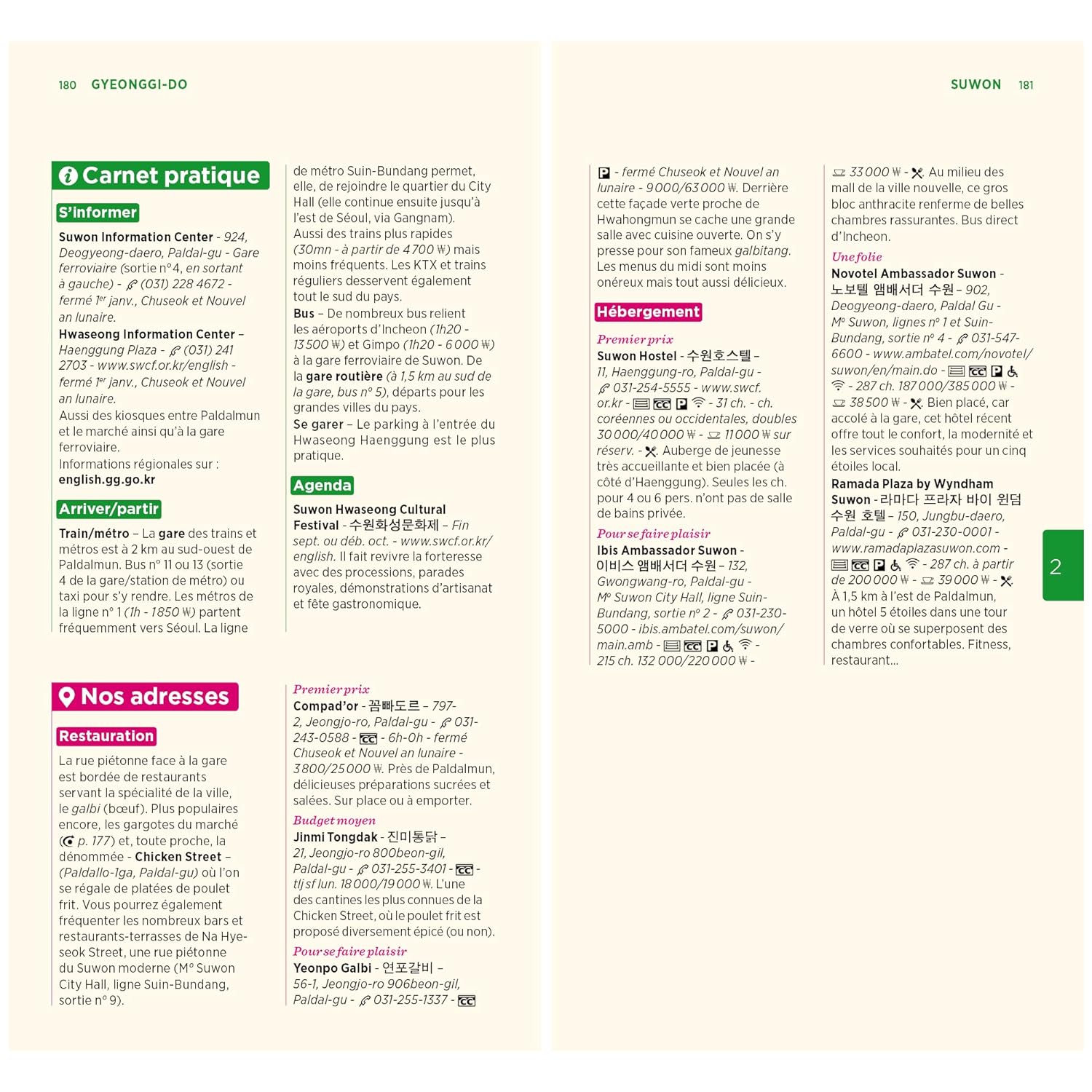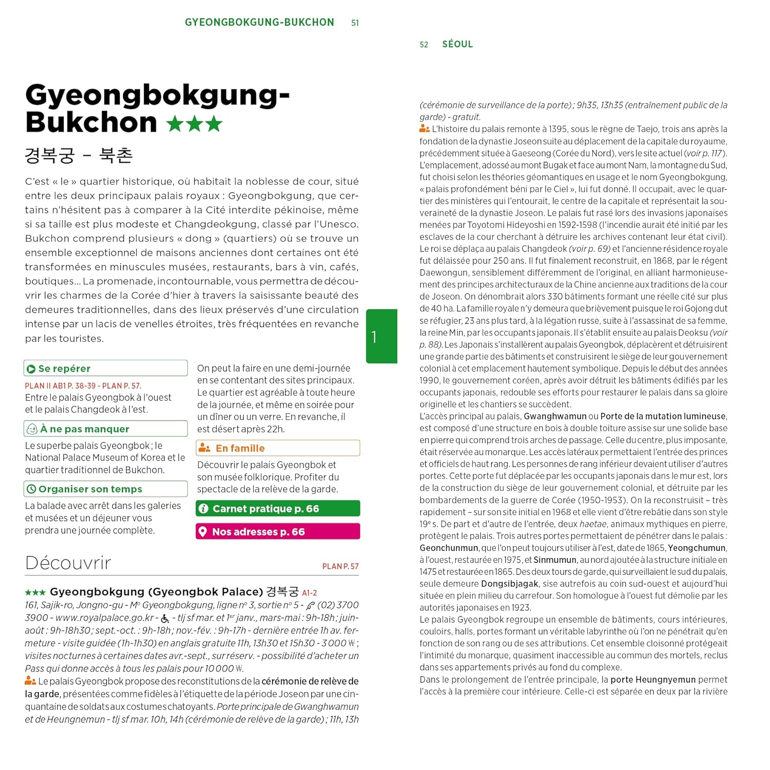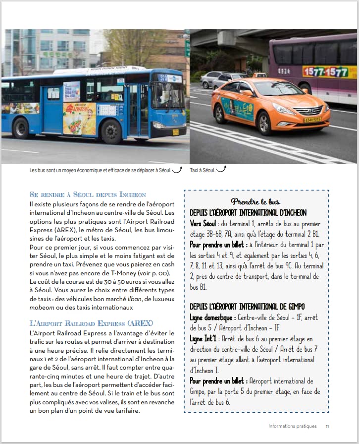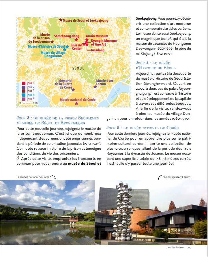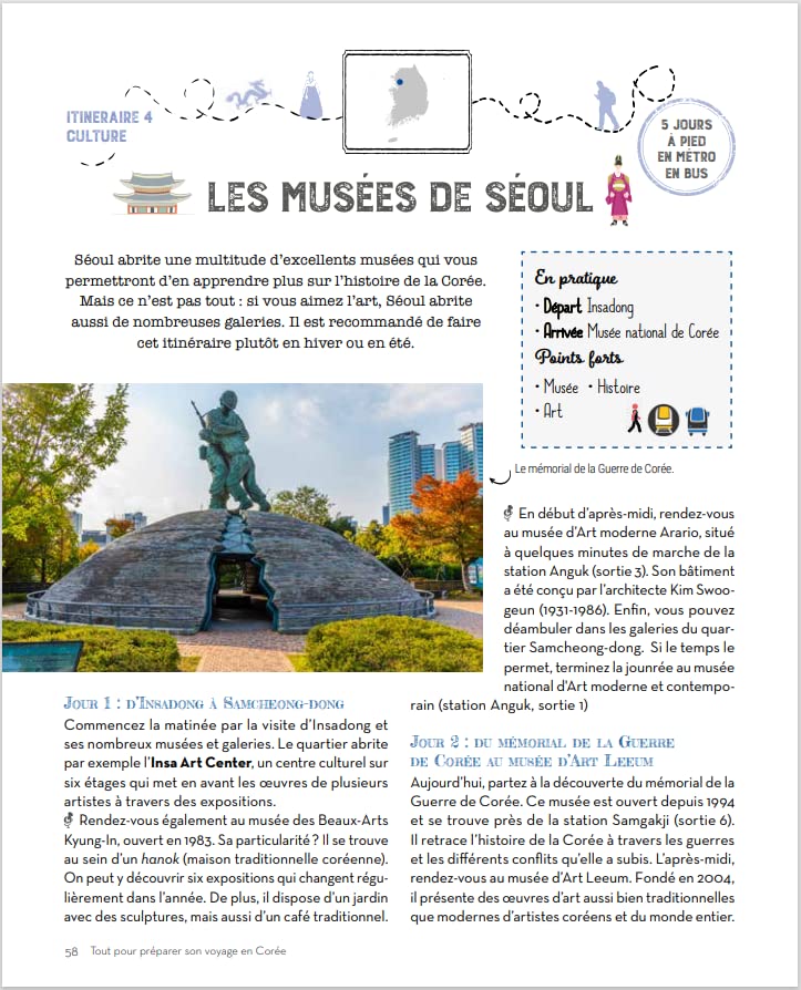 Les principales attractions de la métropole comme le palais Gyeongbokgung, le temple Jogyesa, les pentes de Namsan, l’effervescence de Gangnam ou l’authenticité des maisons de Bukchon, y sont soigneusement répertoriées.