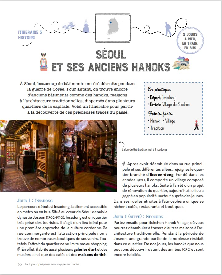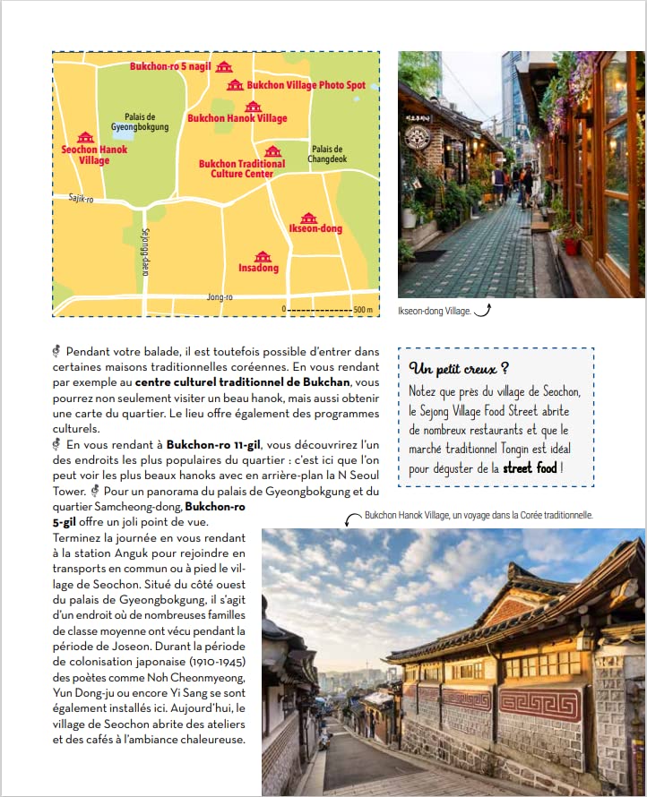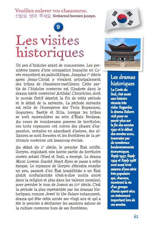 Les auteurs fournissent toutes les informations nécessaires pour planifier votre périple, du choix des lieux historiques à visiter, tels que le palais de Gyeongbokgung ou le village traditionnel de Bukchon Hanok, à la préparation des formalités administratives. Avec un bref historique et des précisions culturelles pour chaque site touristique.