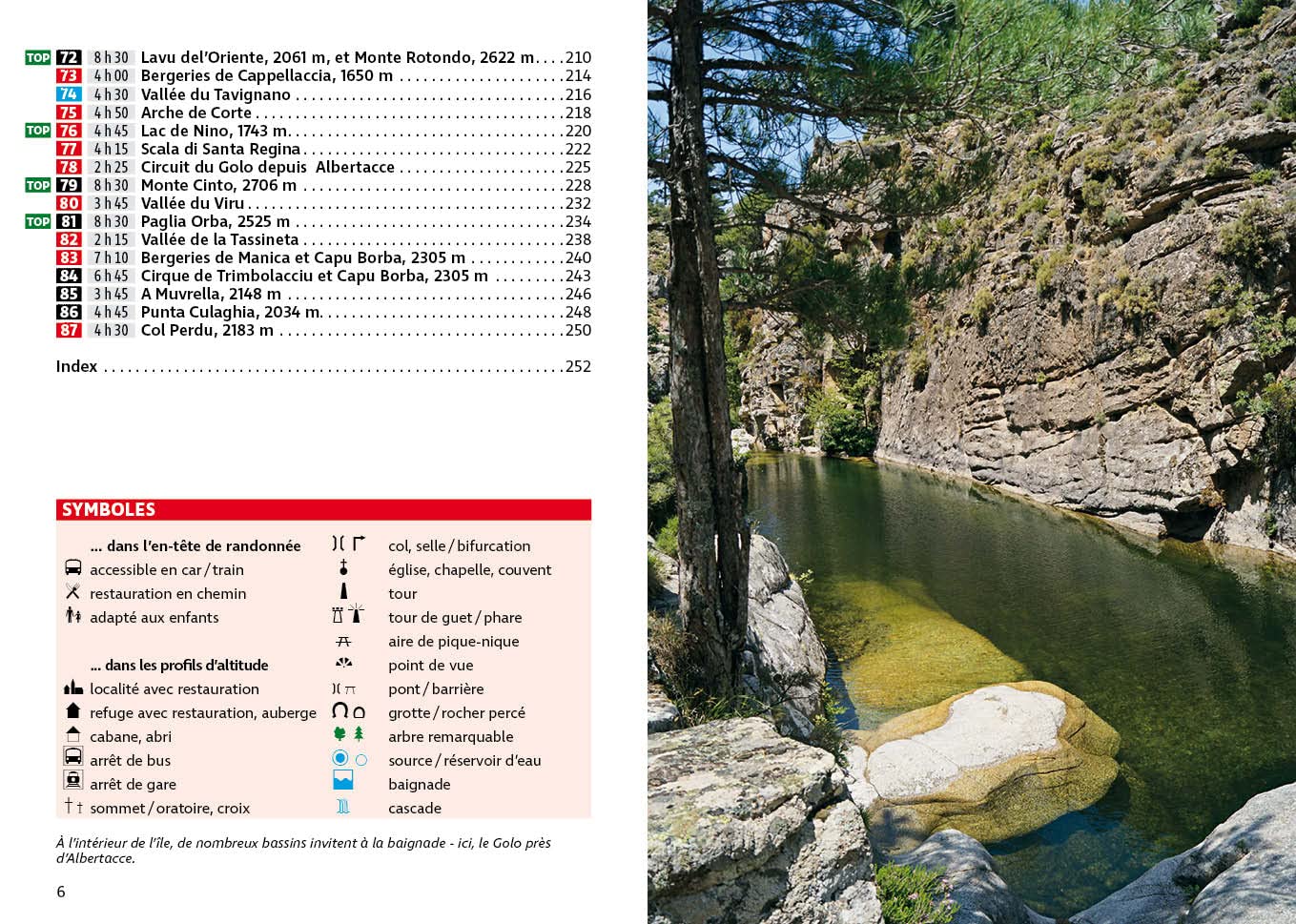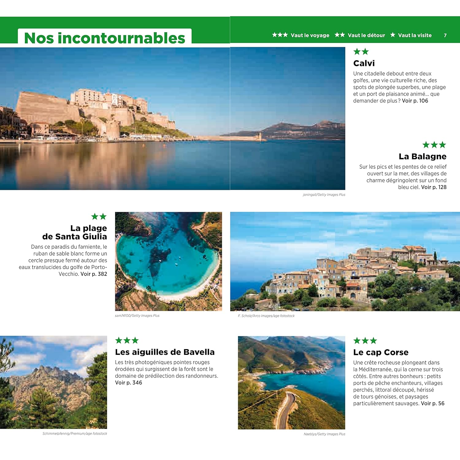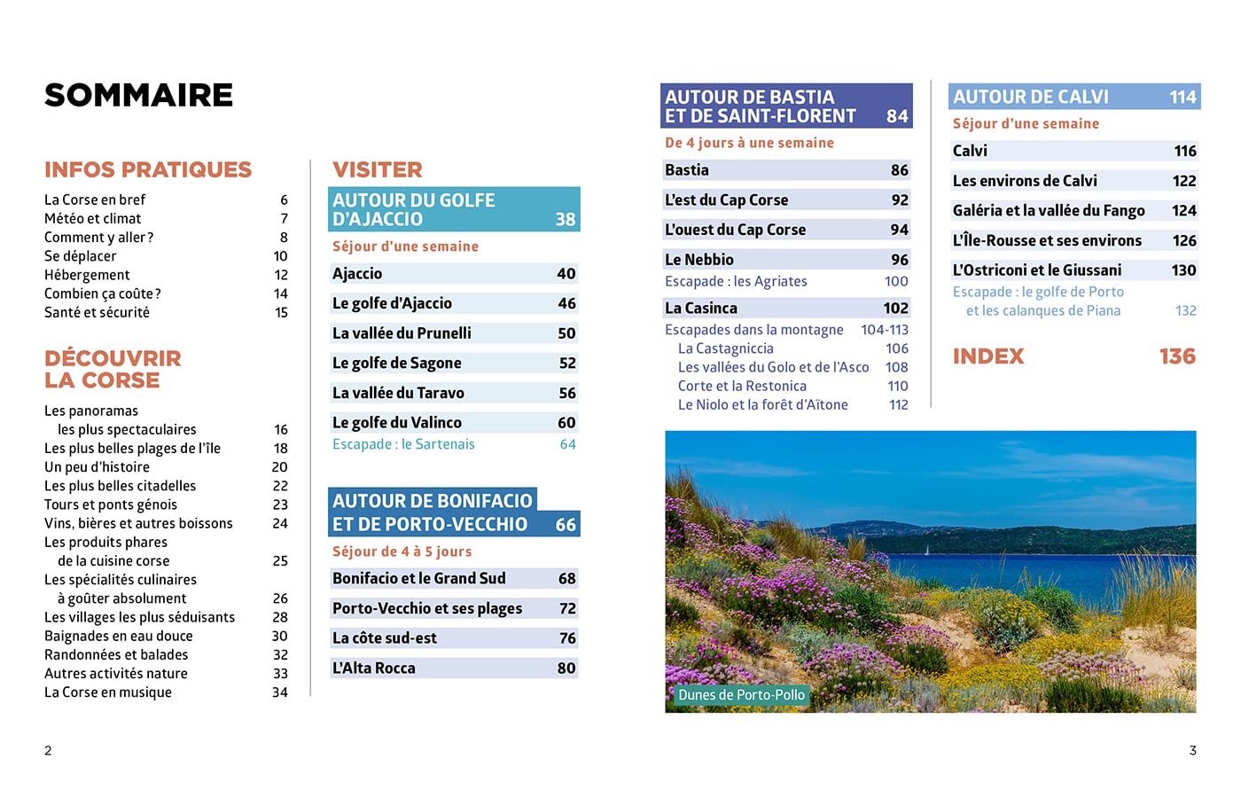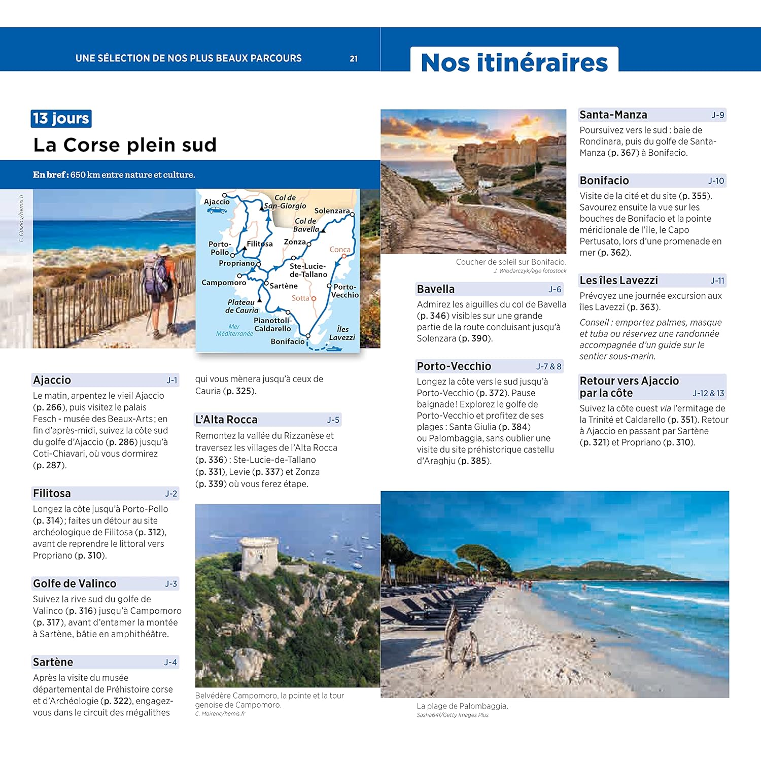 Les sections thématiques décrivent les plus belles plages de l’île, les endroits pour se baigner en eau douce, les randonnées à entreprendre, les remarquables tours et ponts génois, et les incontournables de la gastronomie.