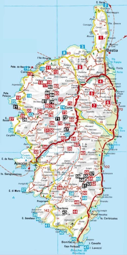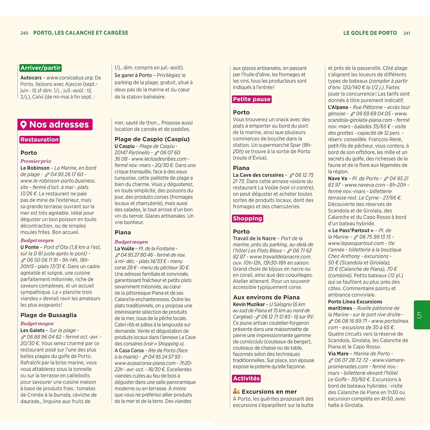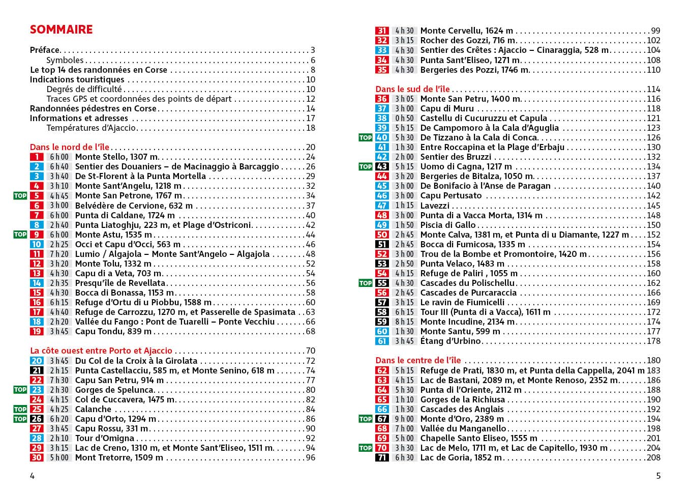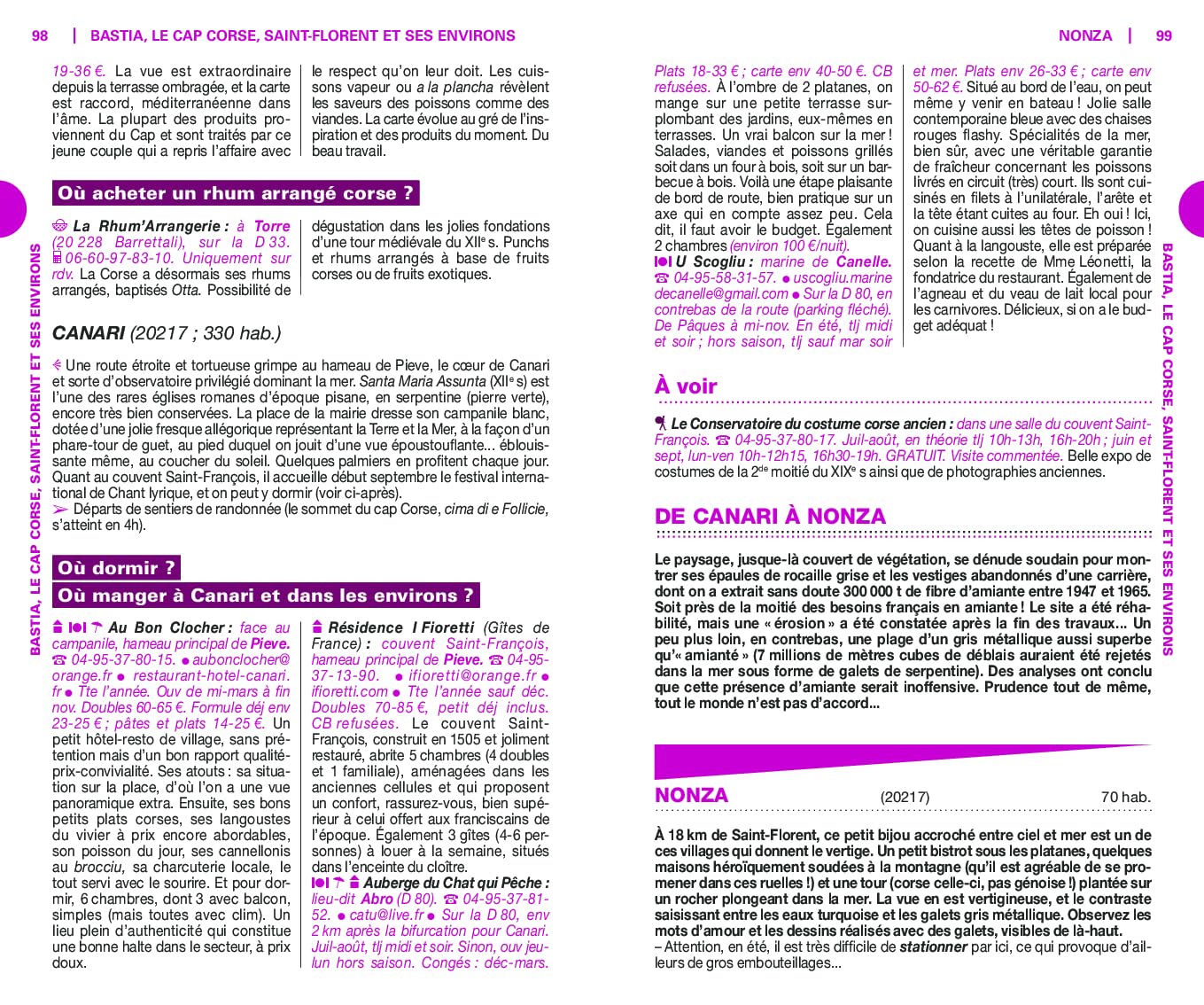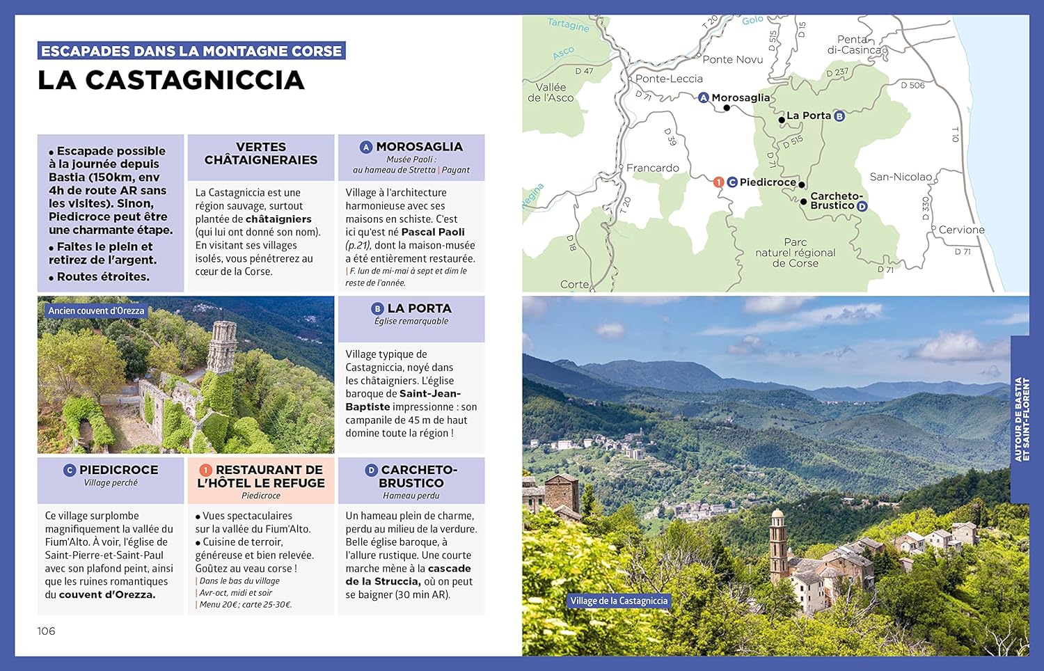 Les sections thématiques décrivent les plus belles plages de l’île, les endroits pour se baigner en eau douce, les randonnées à entreprendre, les remarquables tours et ponts génois, et les incontournables de la gastronomie.