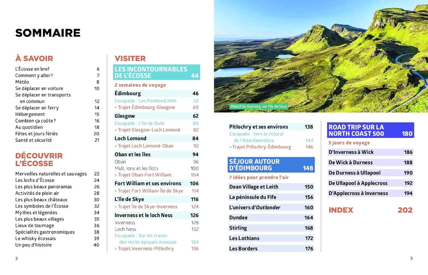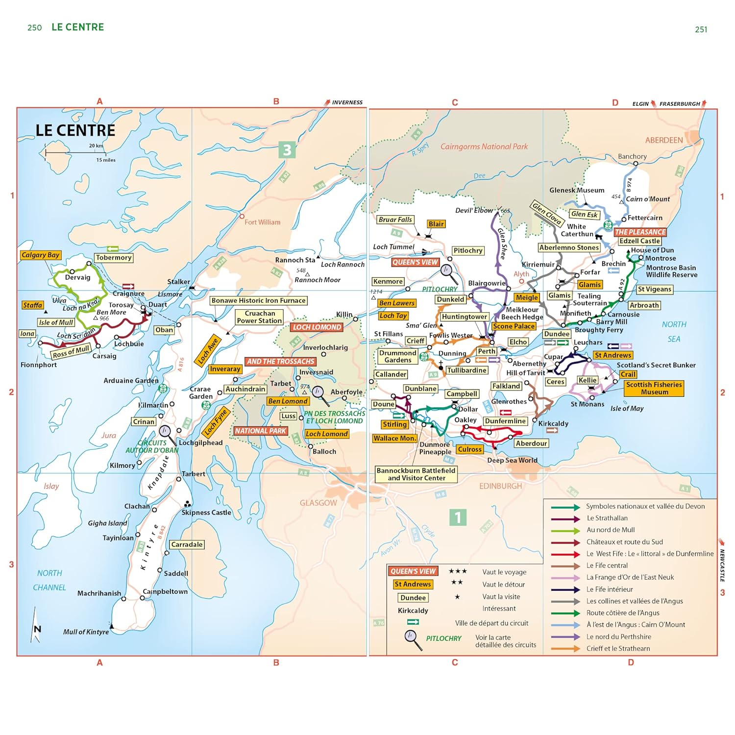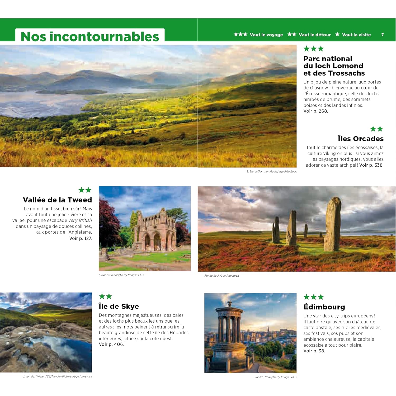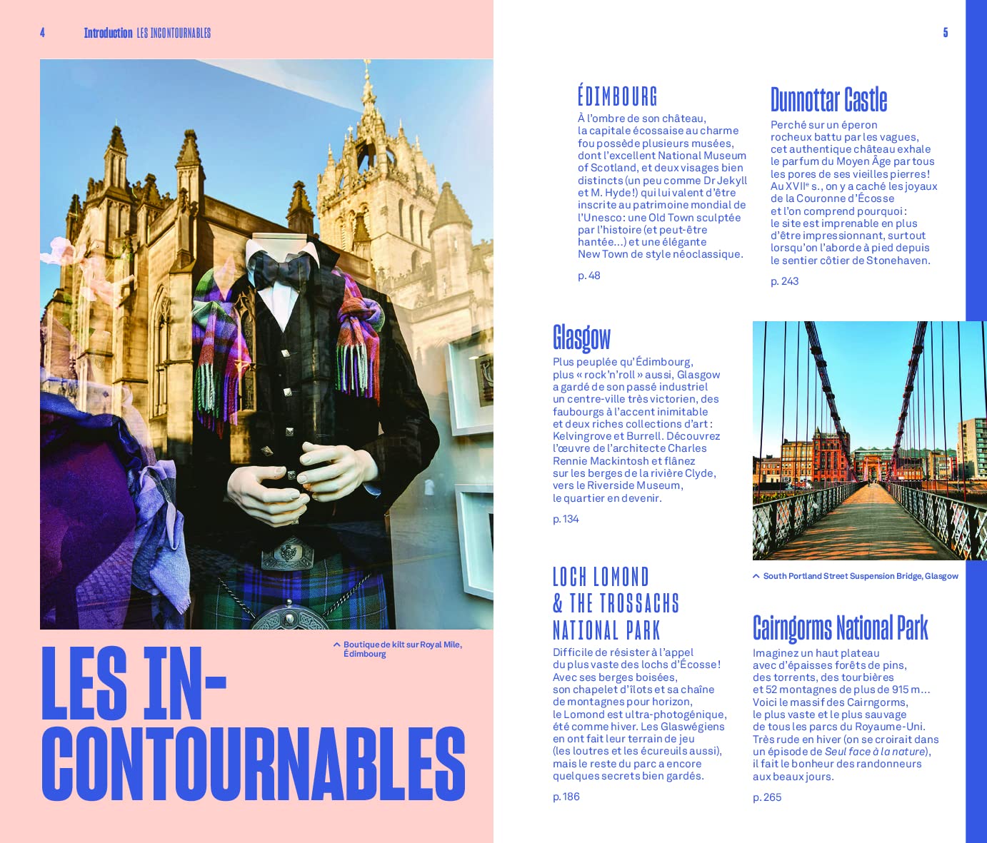 Un guide qui s’articule autour de trois régions principales : le Sud, le Centre et le Nord de l’Écosse. Les sites touristiques comme Édimbourg, Glasgow ou l’île de Skye sont notés selon un barème de 1 à 3 étoiles.