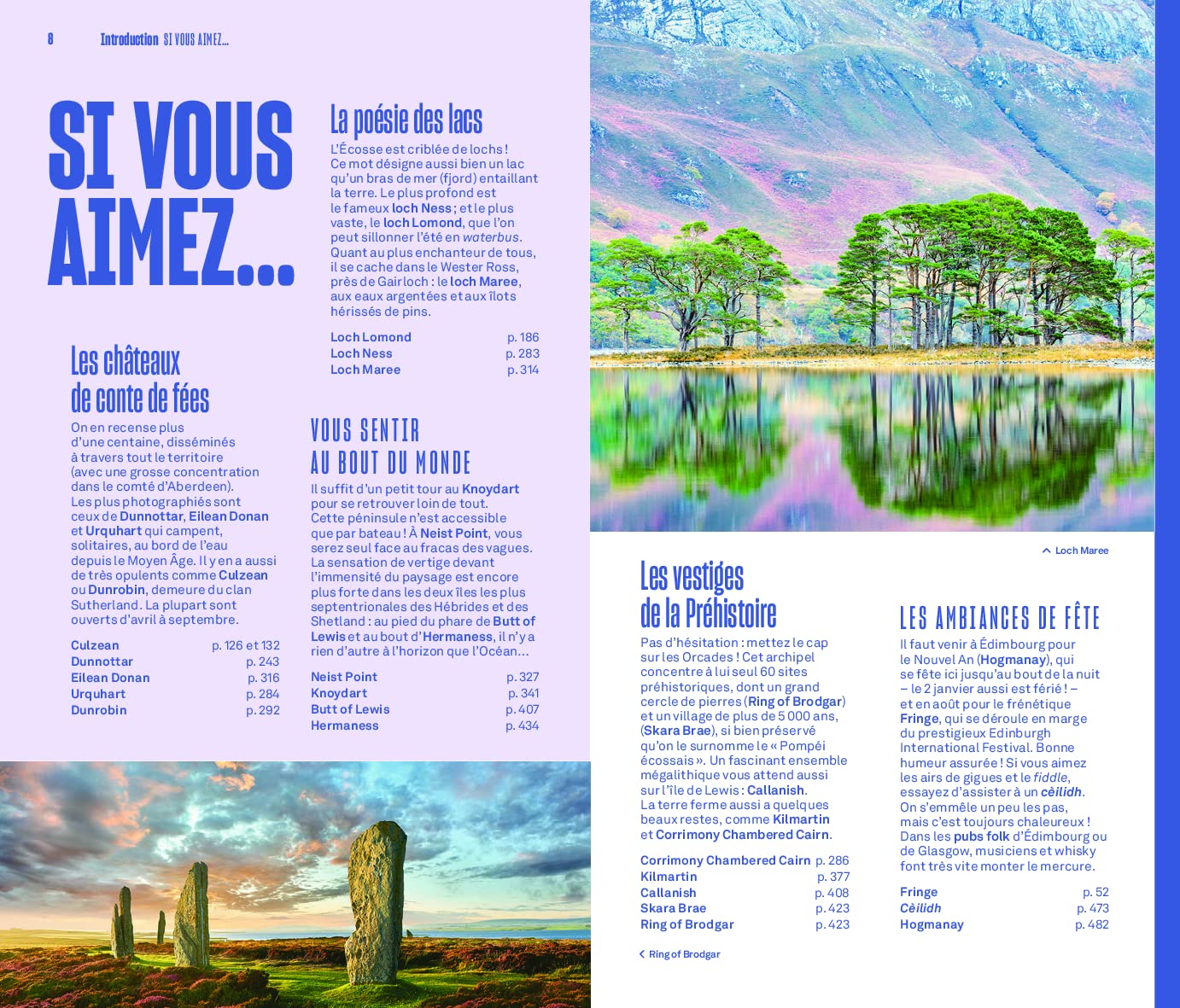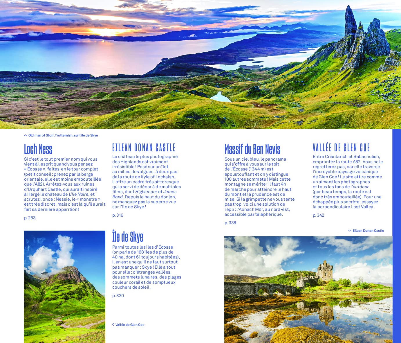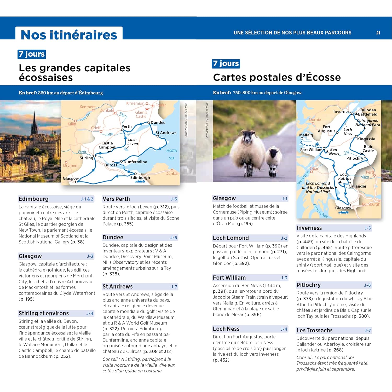 En outre, des chapitres thématiques mettent en exergue les nombreux châteaux ou encore les distilleries de whisky. Le tout illustré par près de 200 photos et 40 cartes et plans.