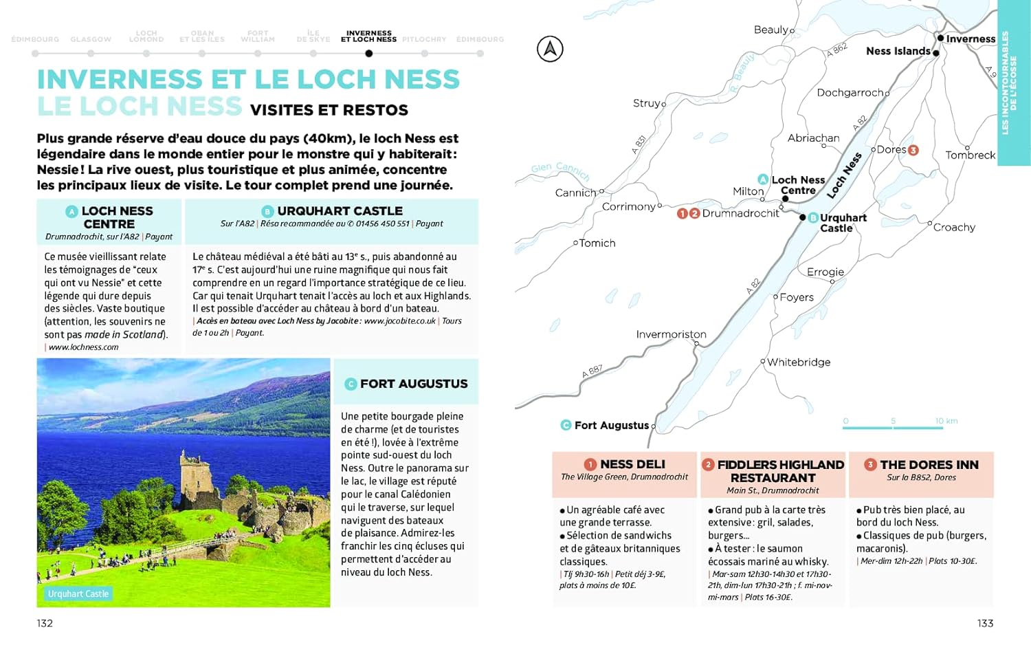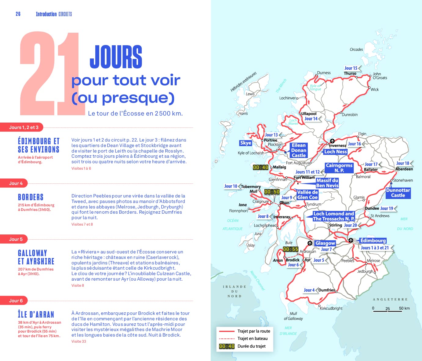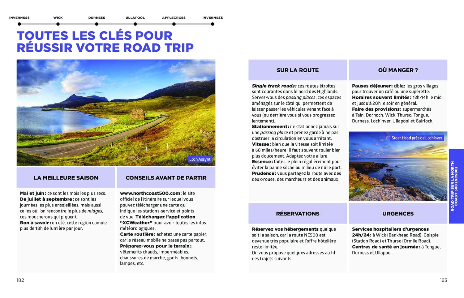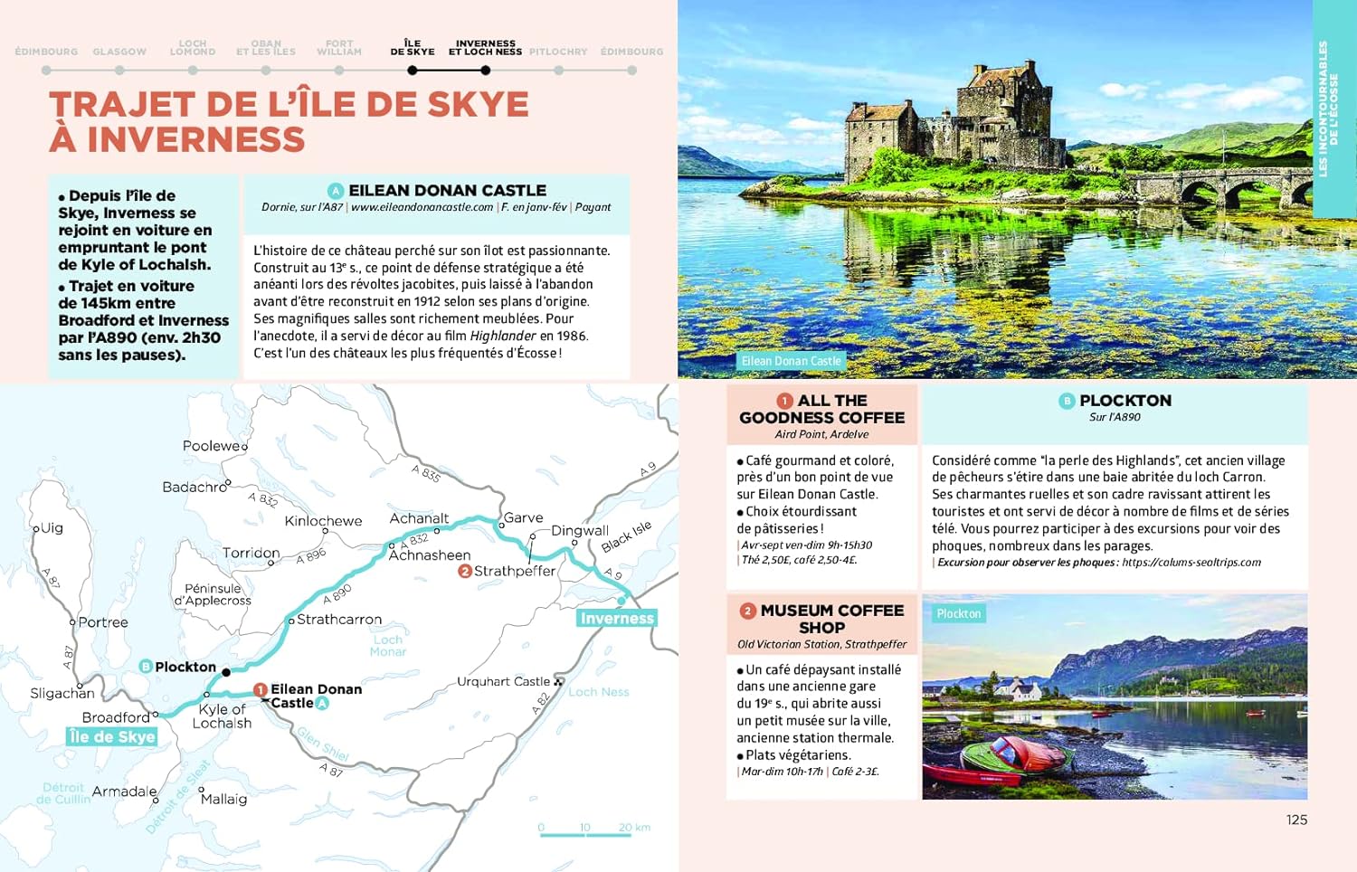 Les auteurs proposent un itinéraire original : une boucle depuis Édimbourg via le loch Ness, l’île de Skye, le loch Lomond, Glasgow et un road-trip au nord d’Inverness sur la route touristique North Coast 500.