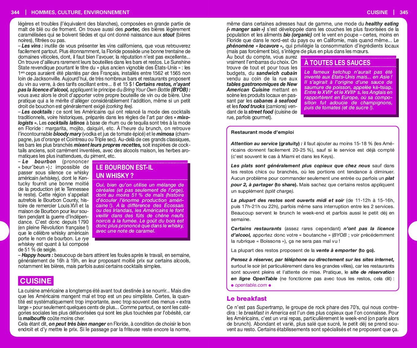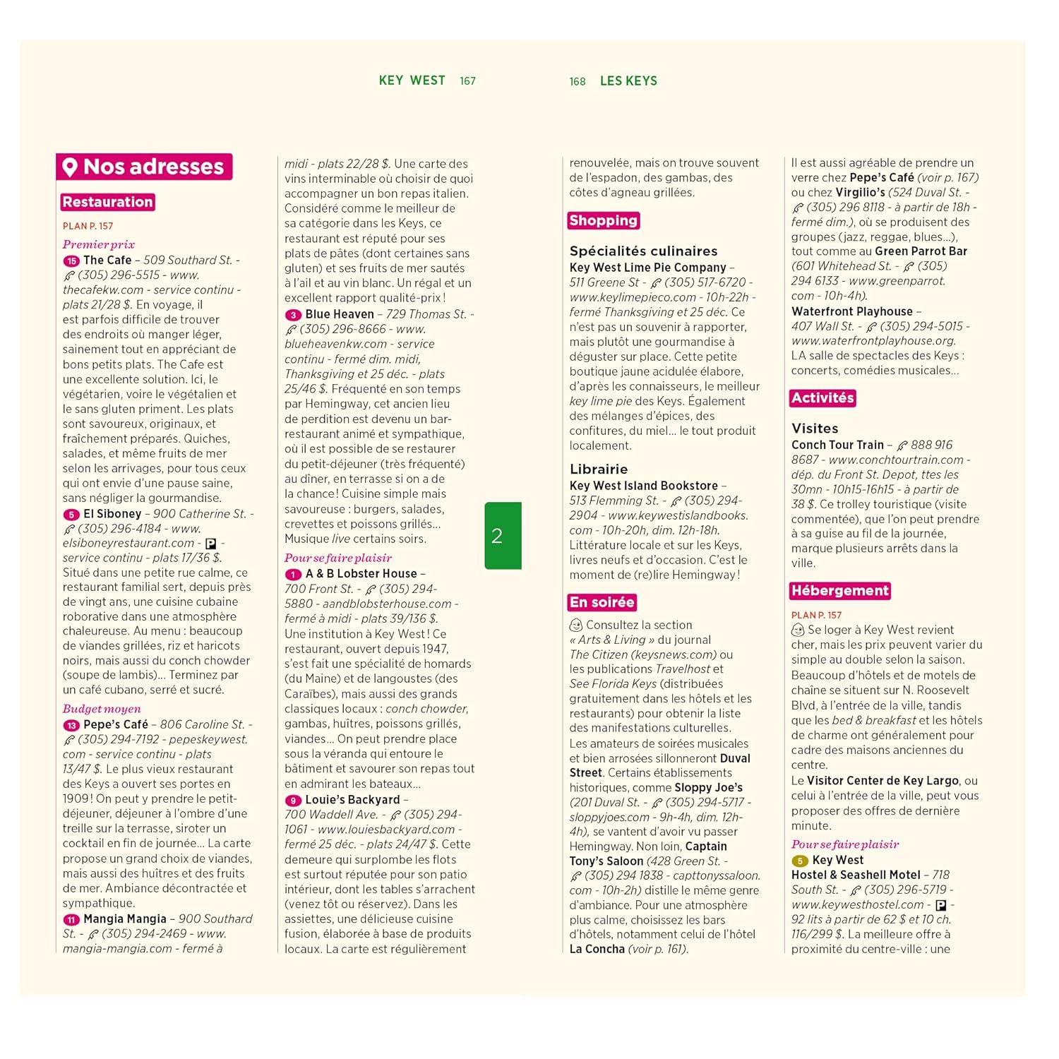 Le guide consacre aussi un chapitre aux parcs d’attraction d’Orlando. Les activités de plein air et la cuisine floridienne ont également droit à leurs propres chapitres.