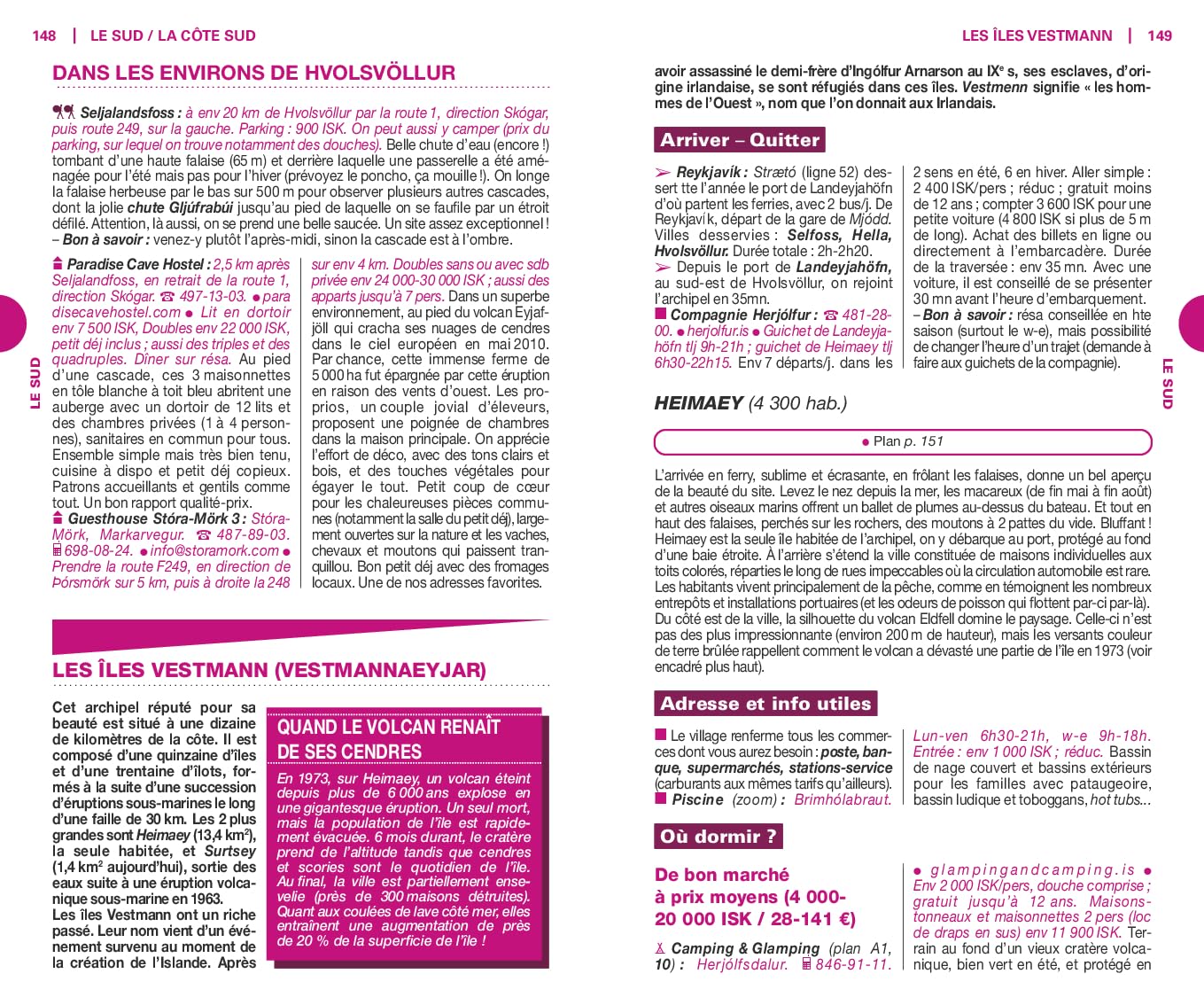 - Les régions islandaises à ne pas manquer (Reykjavík, le Cercle d’Or, la péninsule de Reykjanes, Vestmannaeyjar (îles Vestmann), les fjords de l’Ouest, etc.) traitées sous forme d’activités, de promenades et de visites incontournables ou insolites.