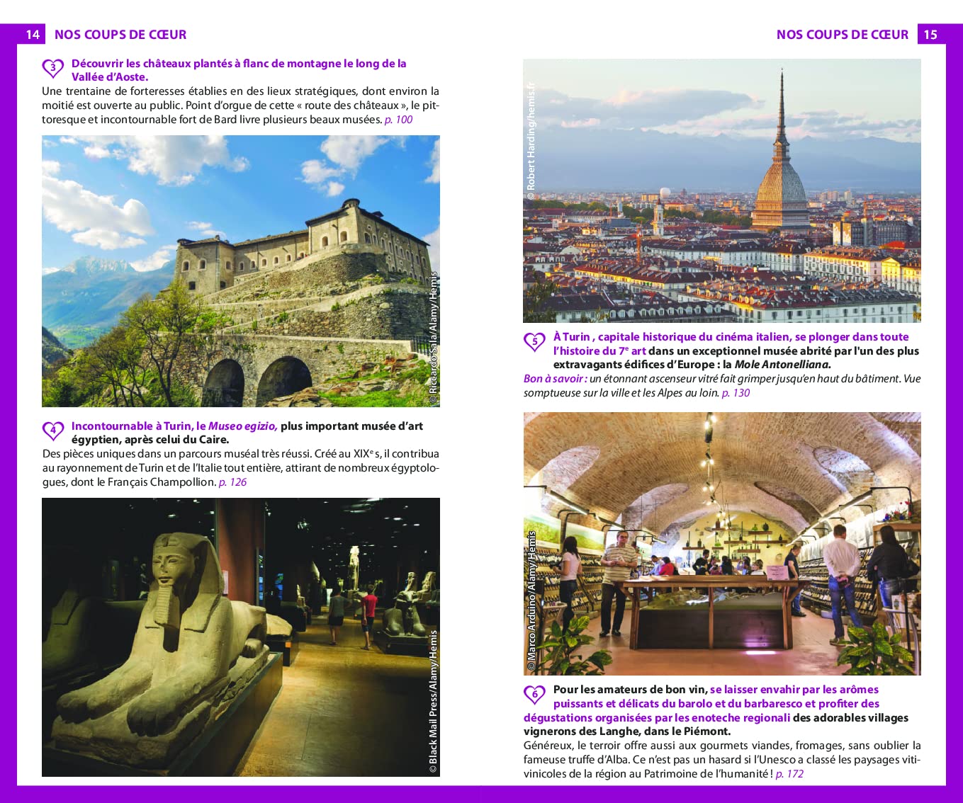 Envie d’activités originales ? Le guide propose des expériences variées allant de la randonnée dans le parc national du Grand-Paradis à la découverte des châteaux nichés dans la Vallée d’Aoste. Sans oublier des suggestions pour apprécier l’art, telles que la visite du Museo Egizio à Turin.