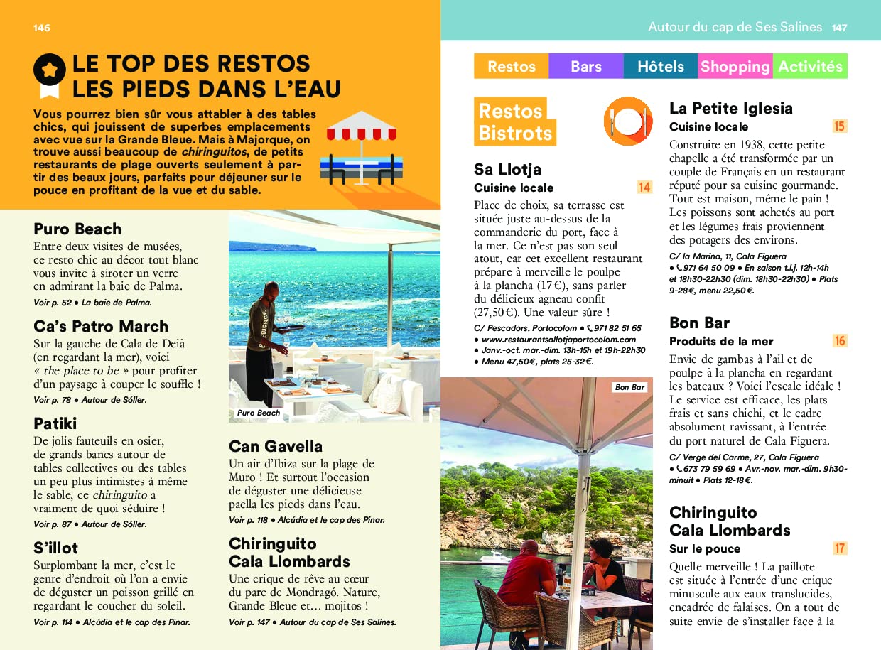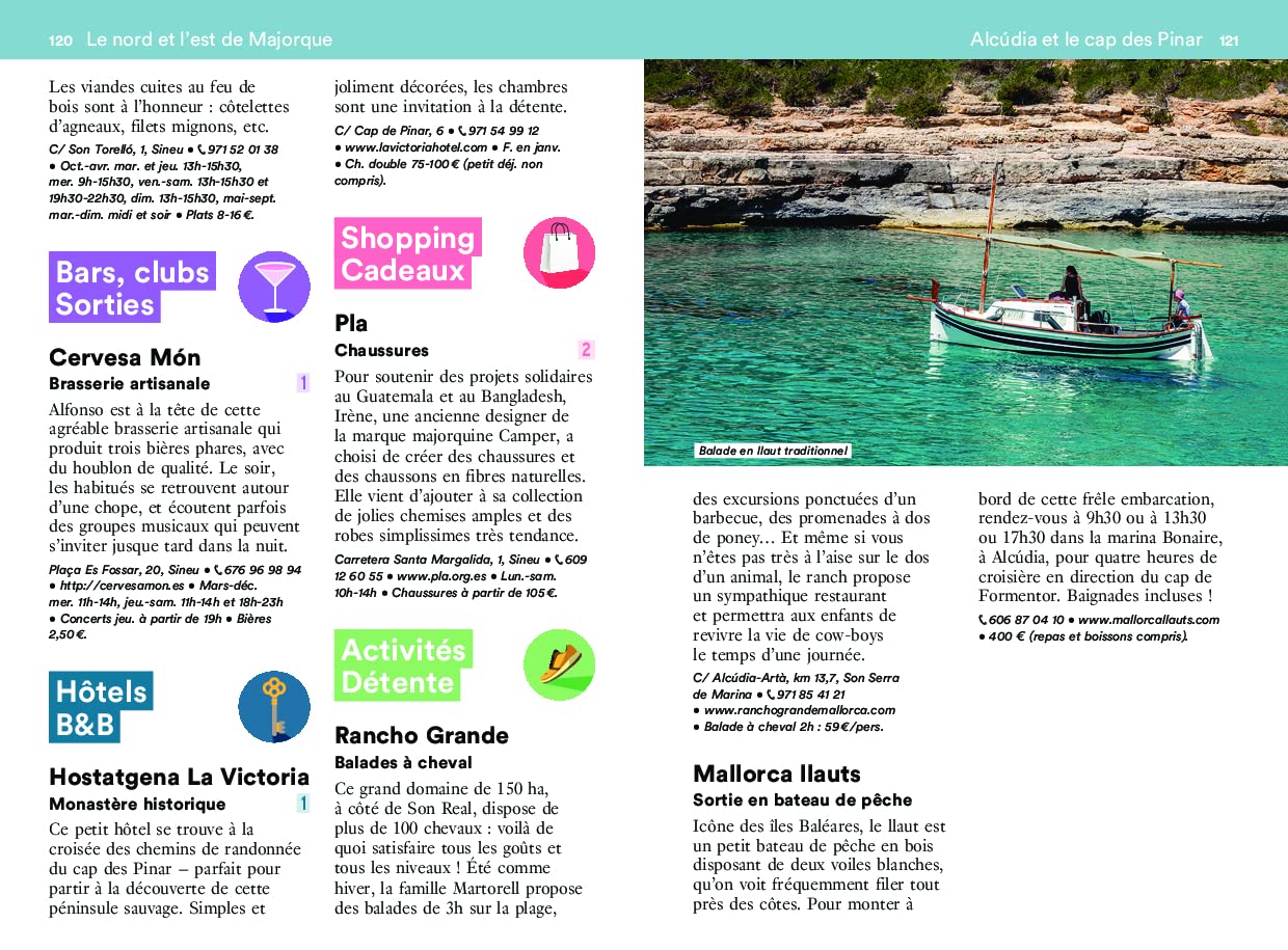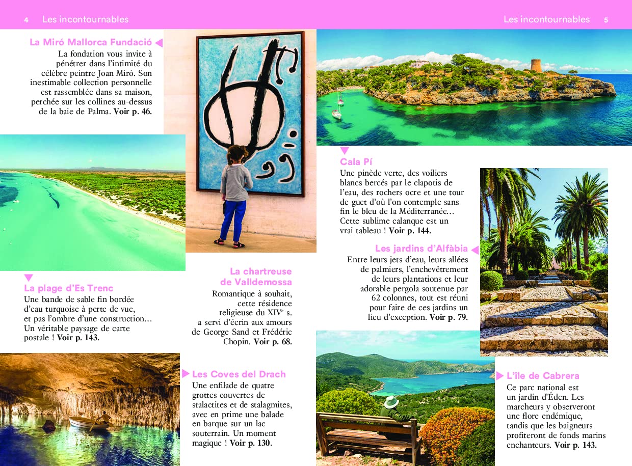 De plus, le guide inclut des suggestions d’activités pour tous les goûts : farniente à Alcúdia, randonnée à pied, à cheval ou à vélo sur le Camí de Cavalls, ou encore un tour des marchés traditionnels majorquins. On y trouve également une sélection de lieux de restauration, de shopping et d’hébergement pour tous les budgets.