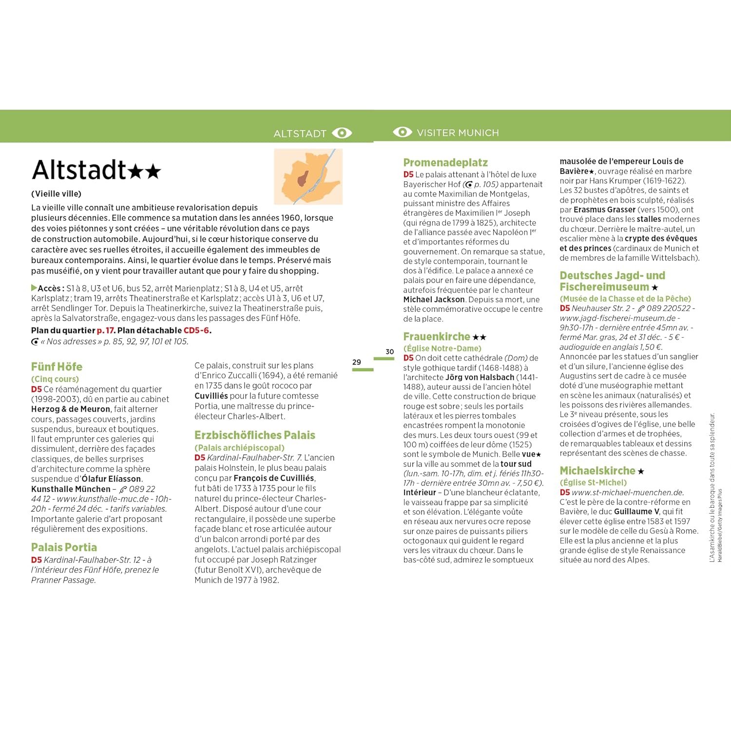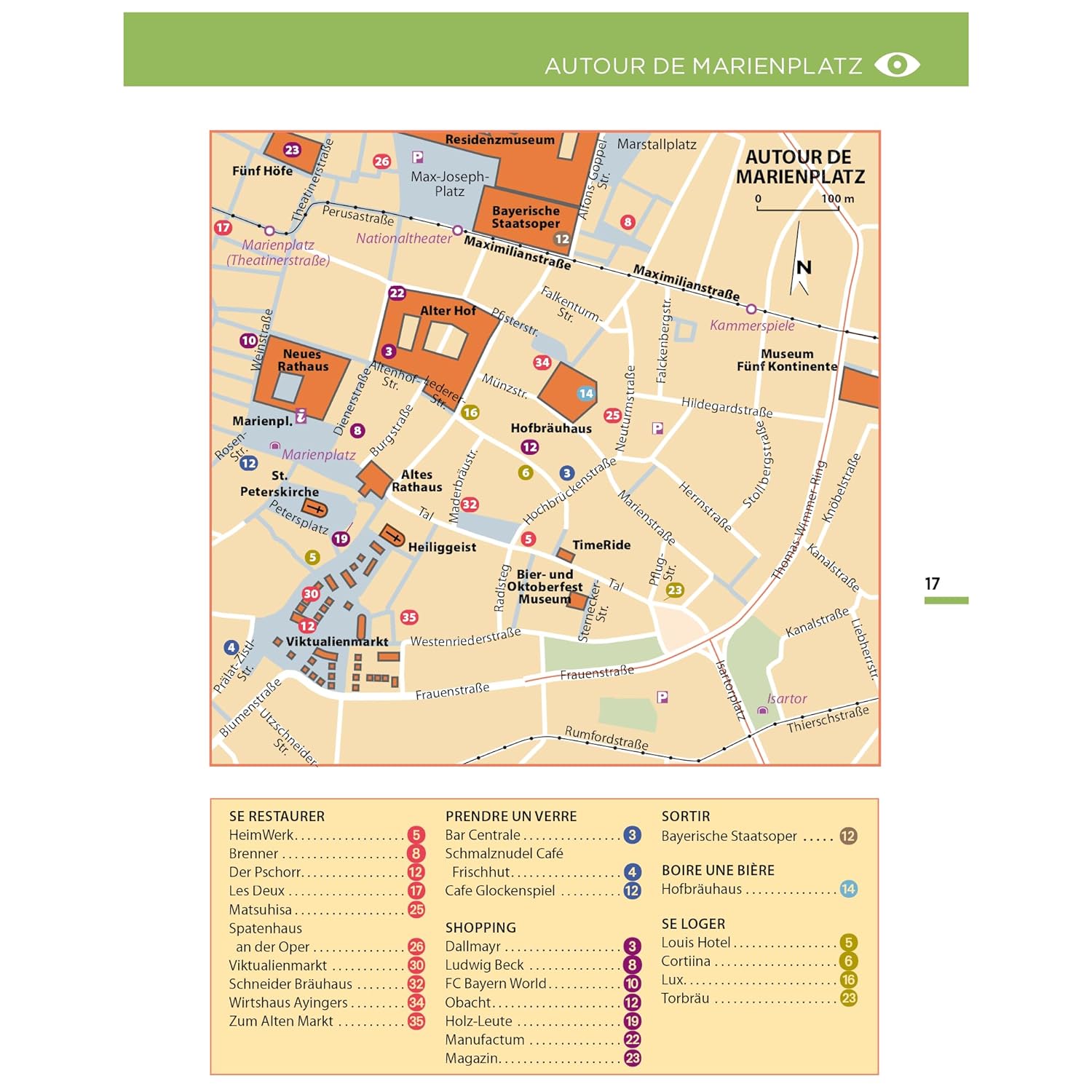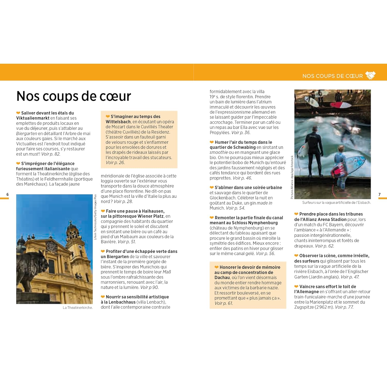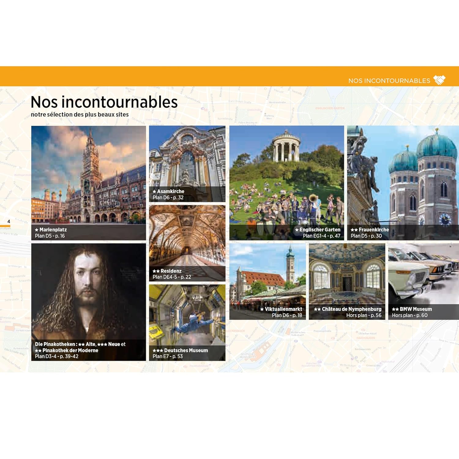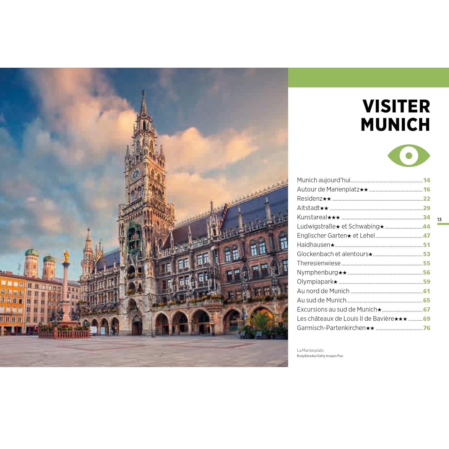 On y découvre les sites emblématiques tels que Marienplatz, Viktualienmarkt, l’Englischer Garten, les églises rococo, les musées d’art moderne, et les quartiers animés de Glockenbach et Schwabing, sans oublier les paisibles berges de l’Isar. Les auteurs y présentent des suggestions de visites, restaurants et sorties, chaque option étant localisée précisément sur les cartes.