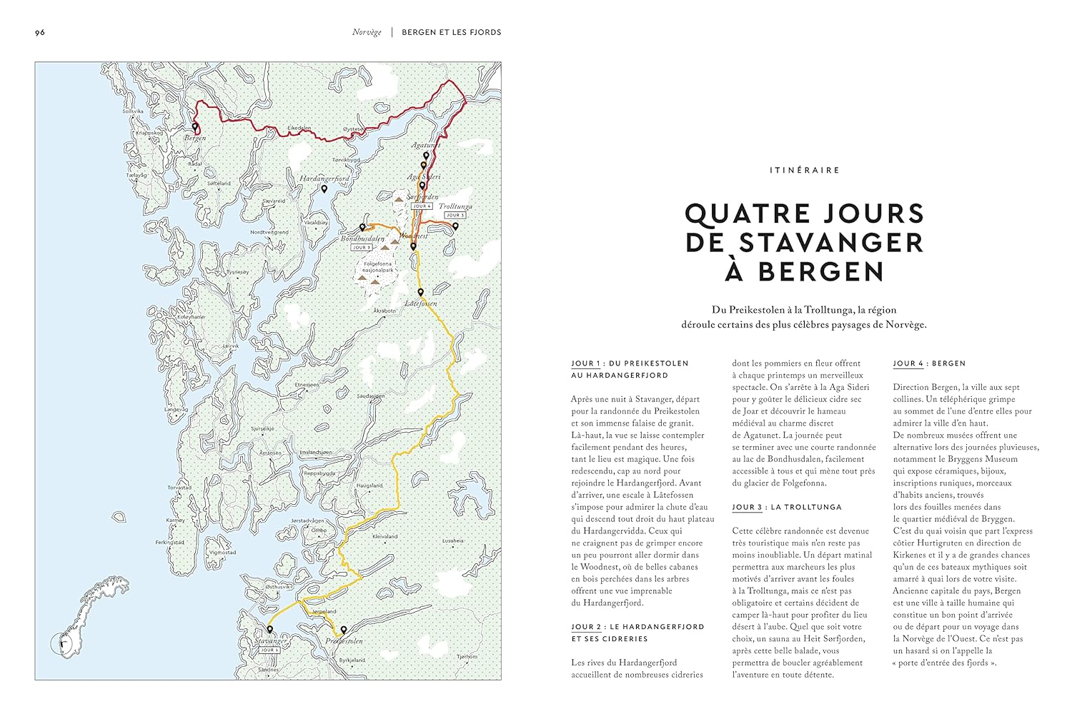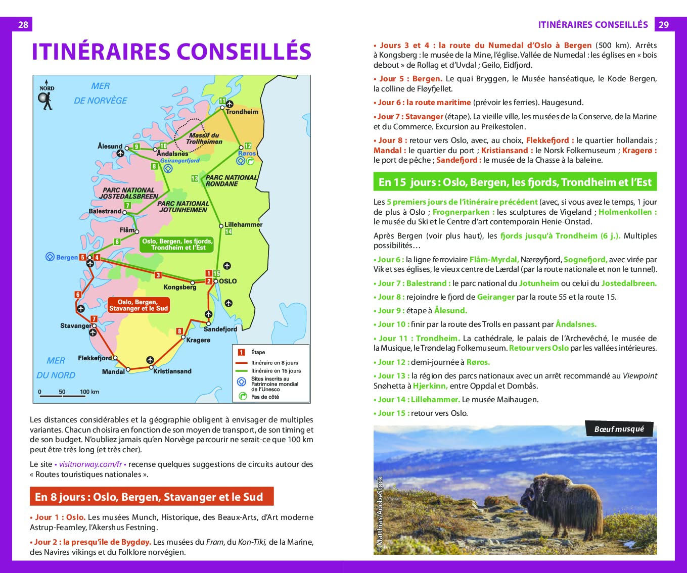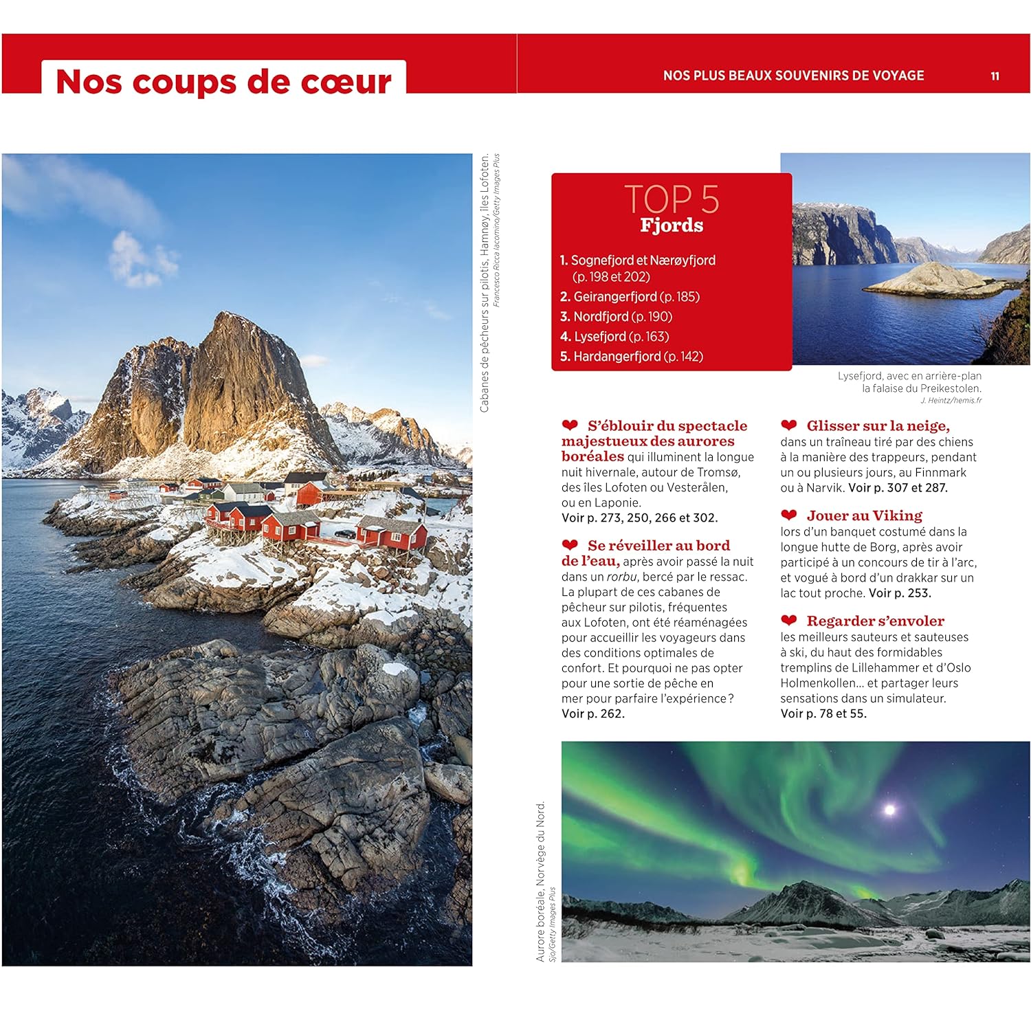 Les auteurs suggèrent des activités originales comme l’observation des aurores boréales, une escapade en traîneau à chiens ou une dégustation de la cuisine norvégienne traditionnelle. Le guide renferme aussi des propositions d’itinéraires pour explorer les multiples facettes de la Norvège, de la boucle sud en 21 jours à un tour des fjords en 11 jours.