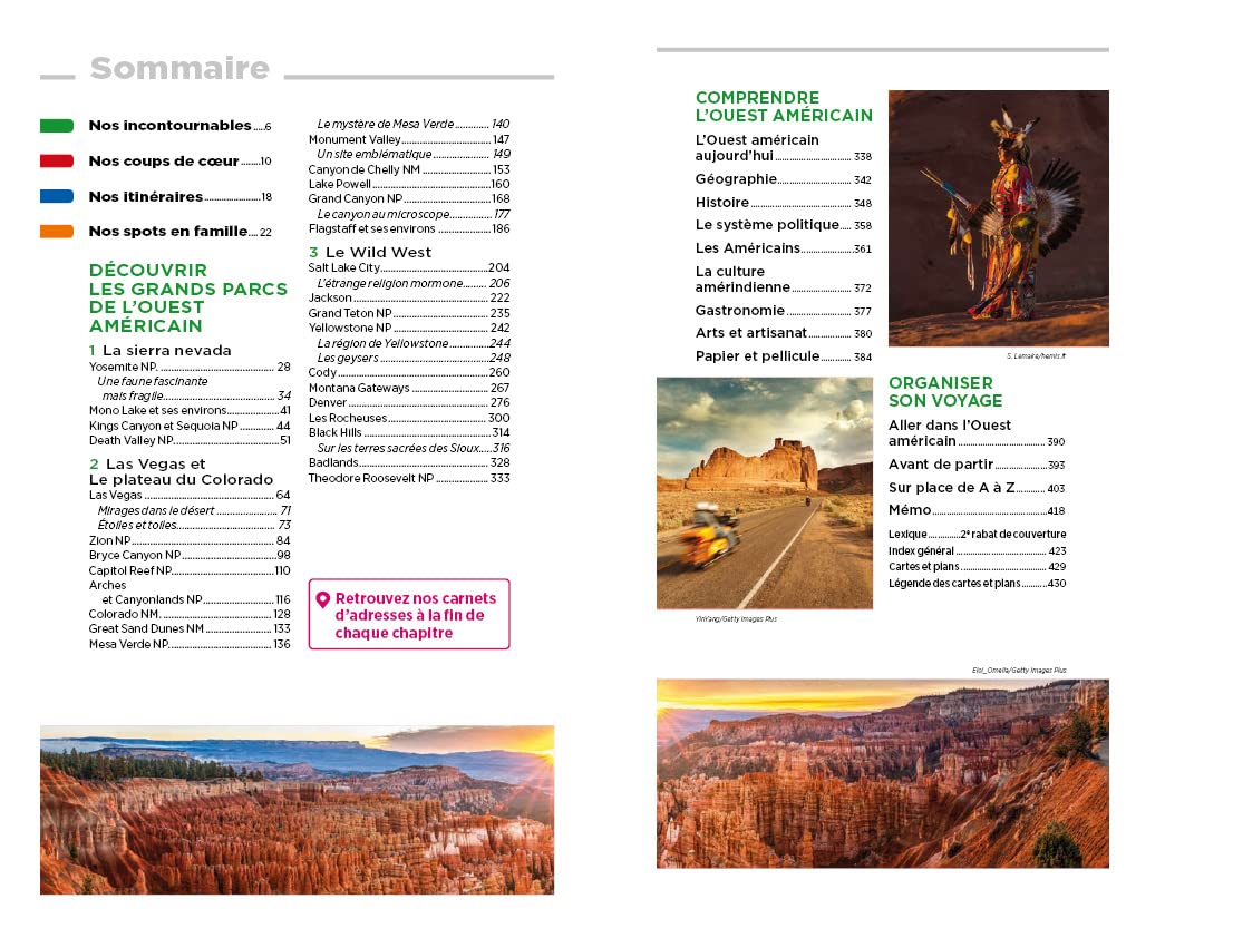 Un guide qui brosse un portrait exhaustif du Far West. Des paysages somptueux du Sequoia National Park aux couleurs captivantes du Bryce Canyon, des contours familiers de la Monument Valley à l’immensité du Grand Canyon, sans oublier les geysers de Yellowstone et les sommets des Rocheuses.