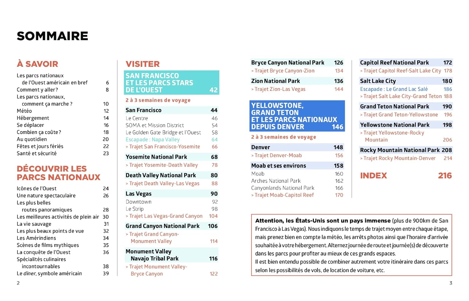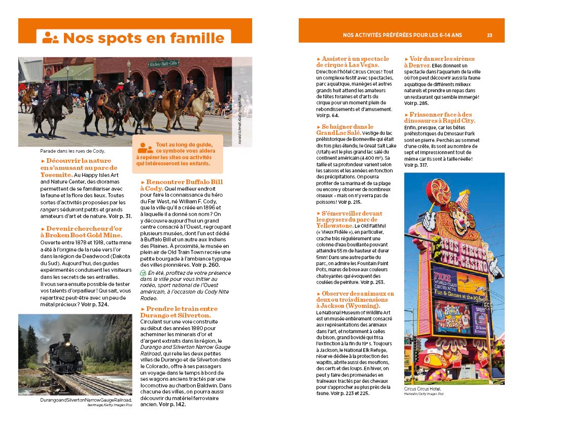 Les auteurs y suggèrent quatre itinéraires originaux pour explorer les parcs de Californie, de l’Utah, du Colorado et des Rocheuses, y compris un grand road-trip. Y sont aussi proposées des activités originales comme la découverte des routes les plus spectaculaires, des villages fantômes et des sites de tournage de films.