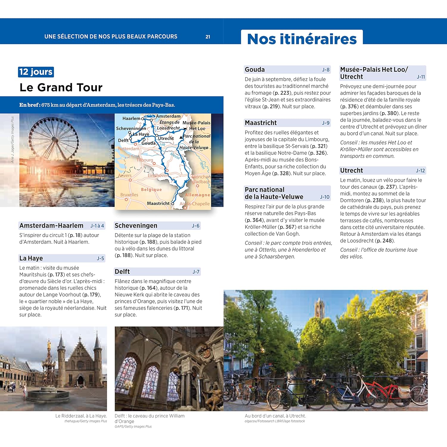 Les principales attractions des villes néerlandaises y sont dévoilées : Amsterdam avec ses canaux, Utrecht et ses trésors médiévaux, Rotterdam et son architecture audacieuse, La Haye sur la mer du Nord. En Belgique, le guide passe en revue les secrets de Bruxelles, Louvain, Bruges, Gand, Anvers, Namur, Liège et le Massif ardennais.