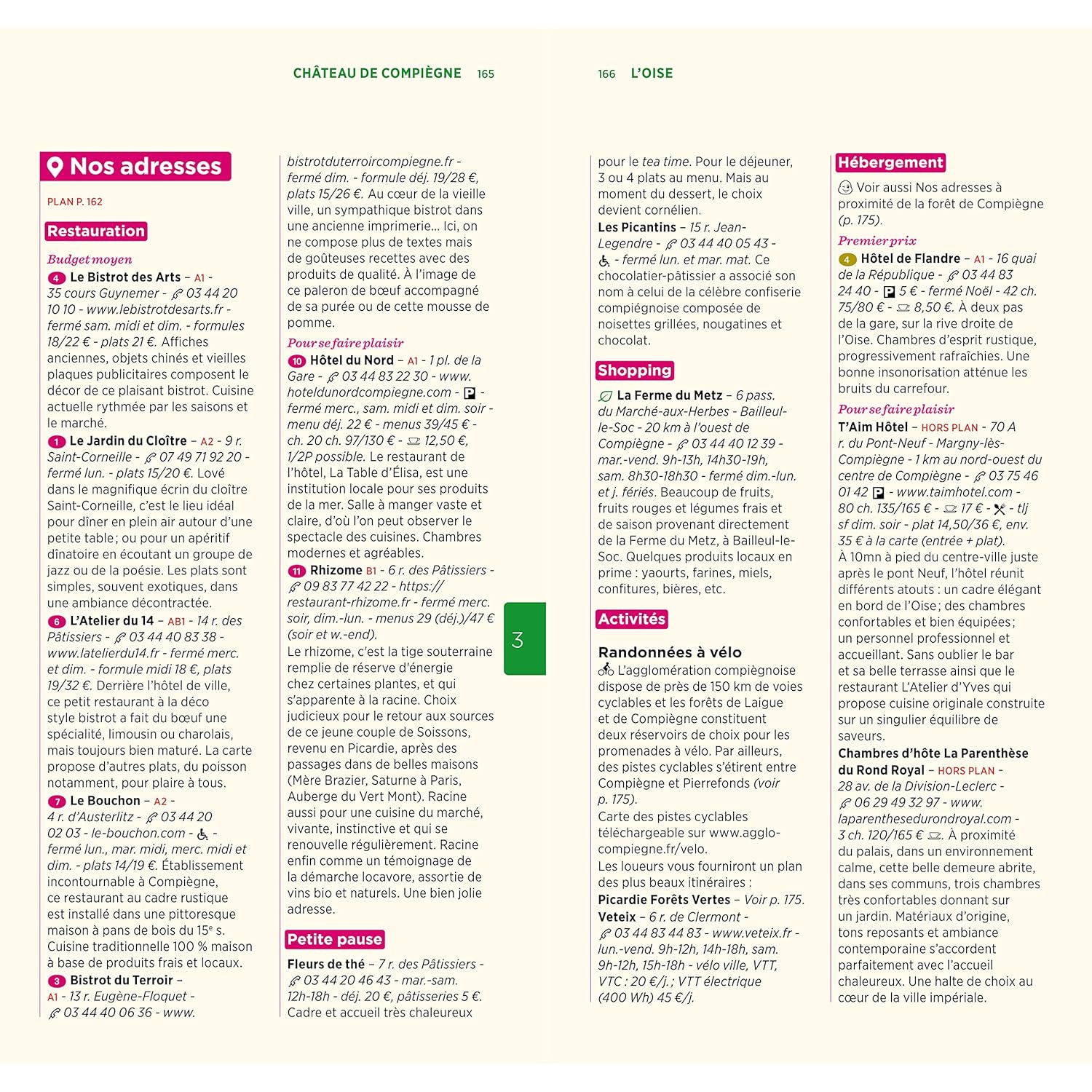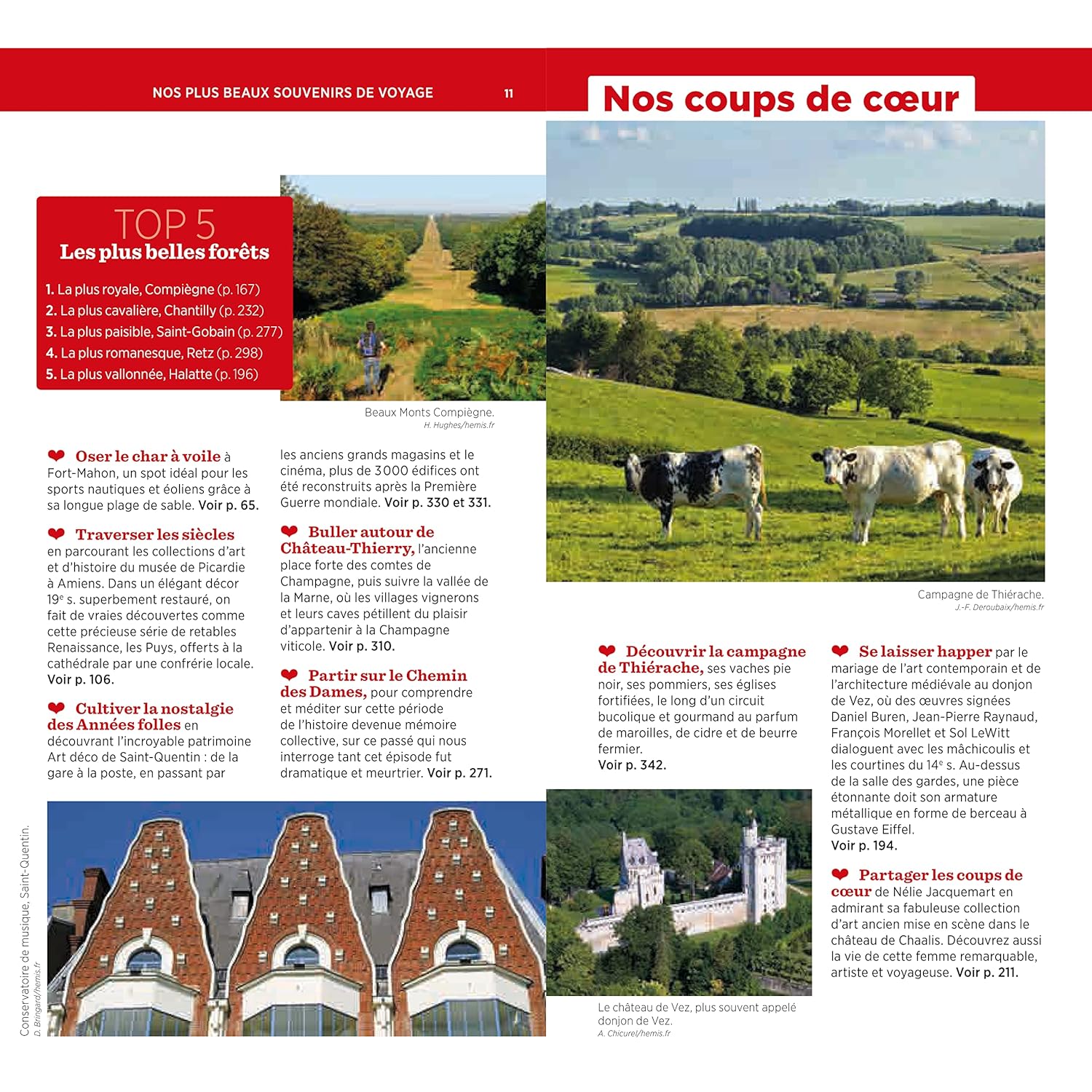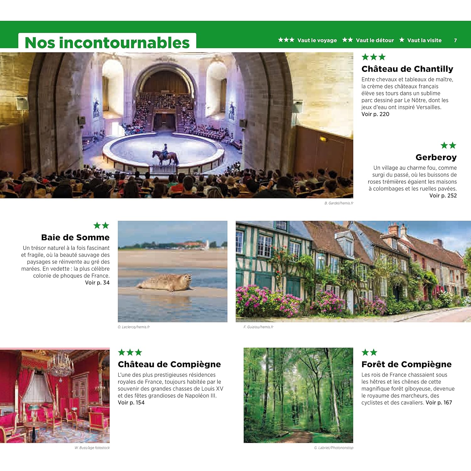 Un guide qui met en lumière la beauté et la diversité de la région. On y découvre les principaux attraits tels que la forêt de Compiègne, le château de Chantilly ou la cathédrale de Beauvais, notés sur une échelle de 1 à 3 étoiles.