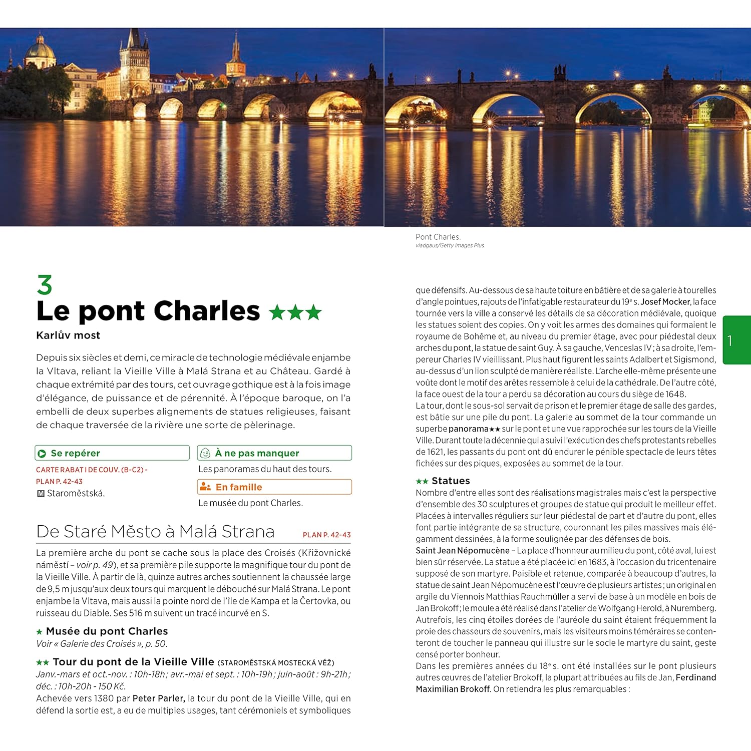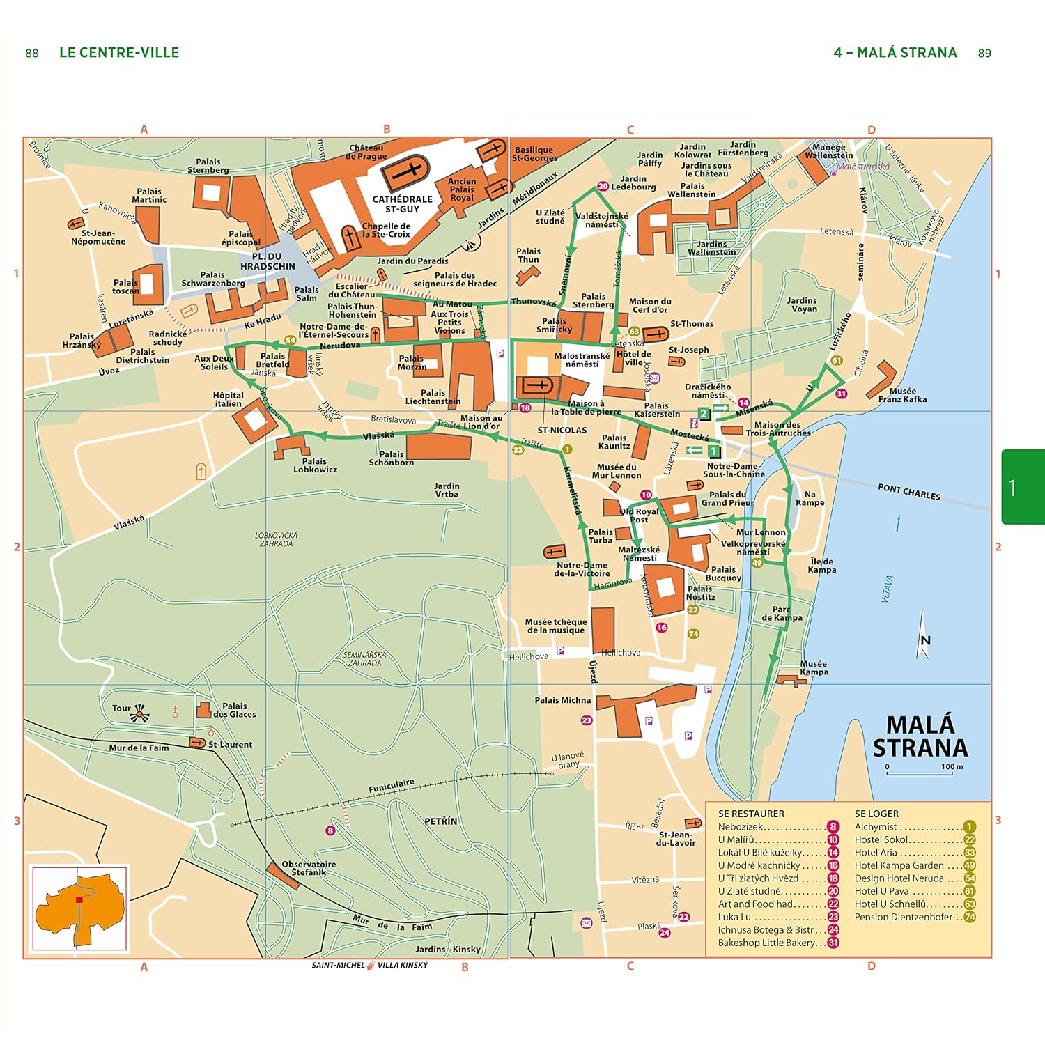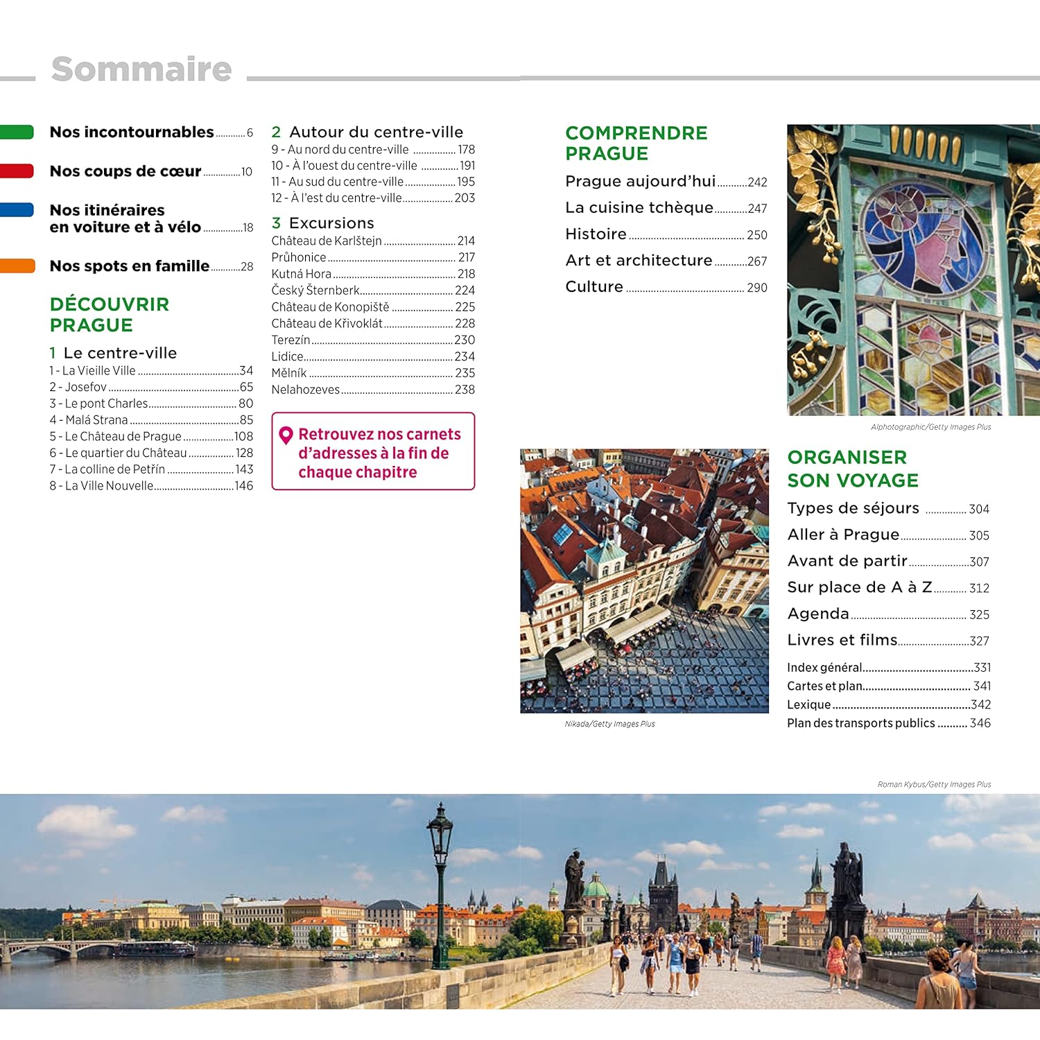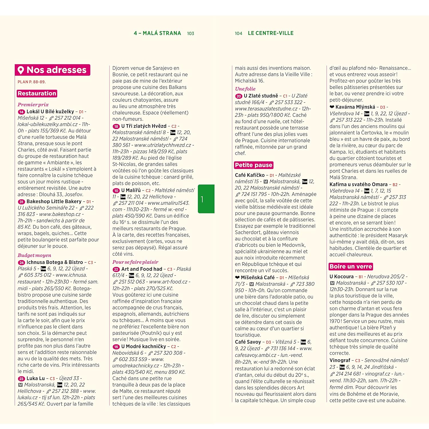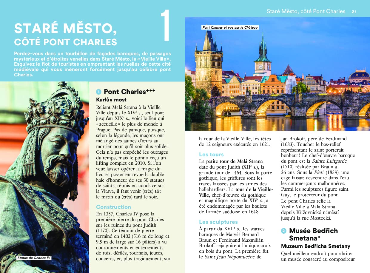 Un guide organisé en trois parties majeures. La première partie vous fait traverser le centre-ville : de la Vieille Ville à la Ville Nouvelle, en passant par Josefov, le pont Charles et le quartier du Château.