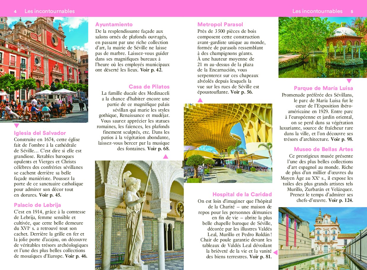 Un guide qui dévoile la beauté de cette ville andalouse. Il présente des photos et des cartes des lieux emblématiques, des édifices somptueux du barrio de Santa Cruz – cathédrale, Giralda et Alcázar – aux nuits endiablées du barrio Triana, sans oublier les processions de la Semaine Sainte et les soirées tapas de l’Alameda de Hércules.