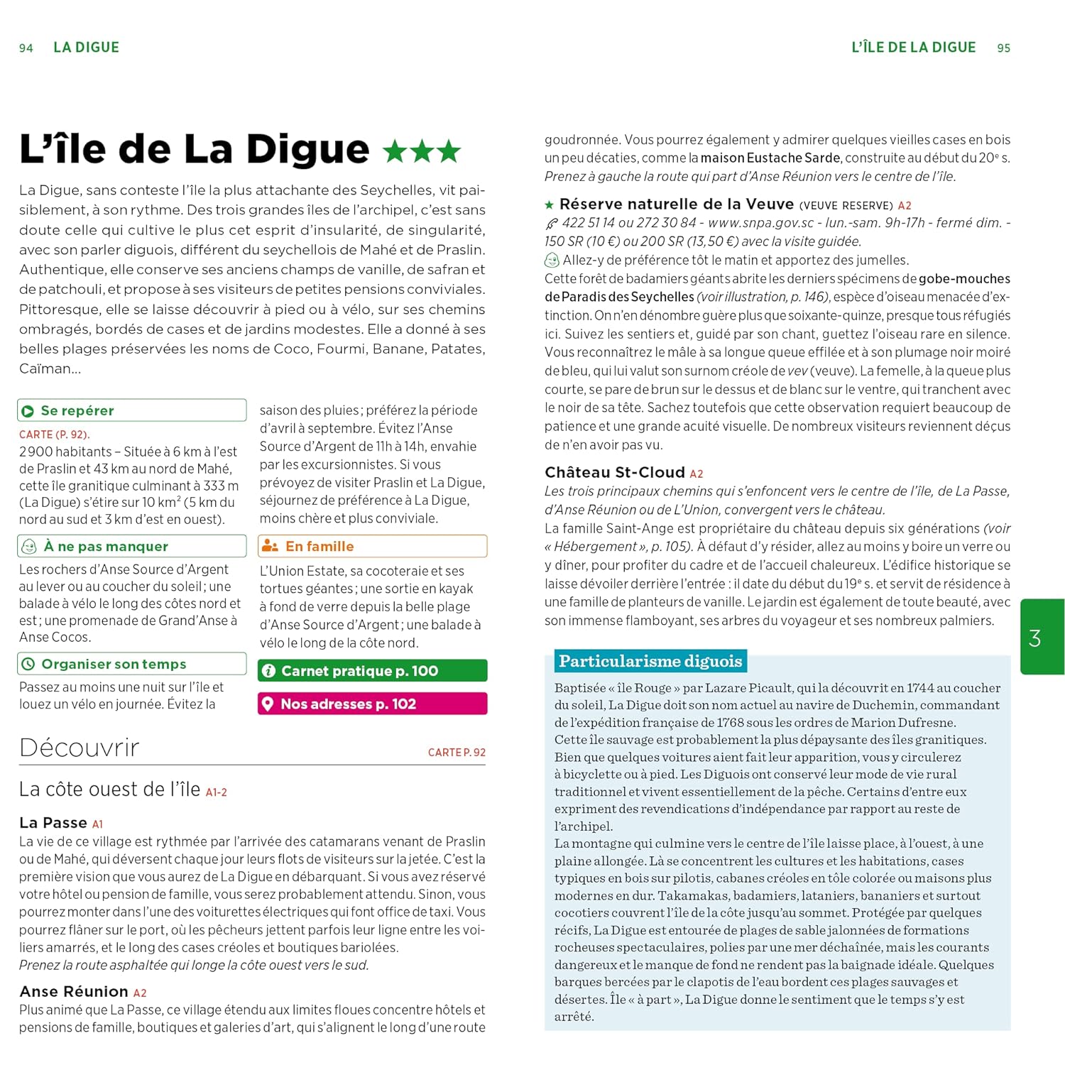 Un guide qui nous embarque pour un tour complet de ces îles paradisiaques. Les sites touristiques comme l’île d’Aldabra, la Vallée de Mai ou l’Anse Intendance, sont présentés avec brio, notés par un système de 1 à 3 étoiles pour indiquer leur importance.