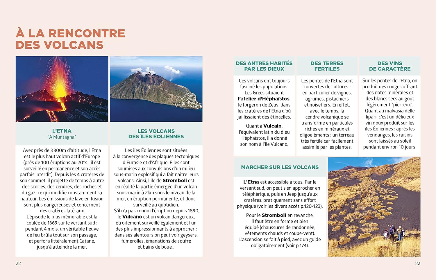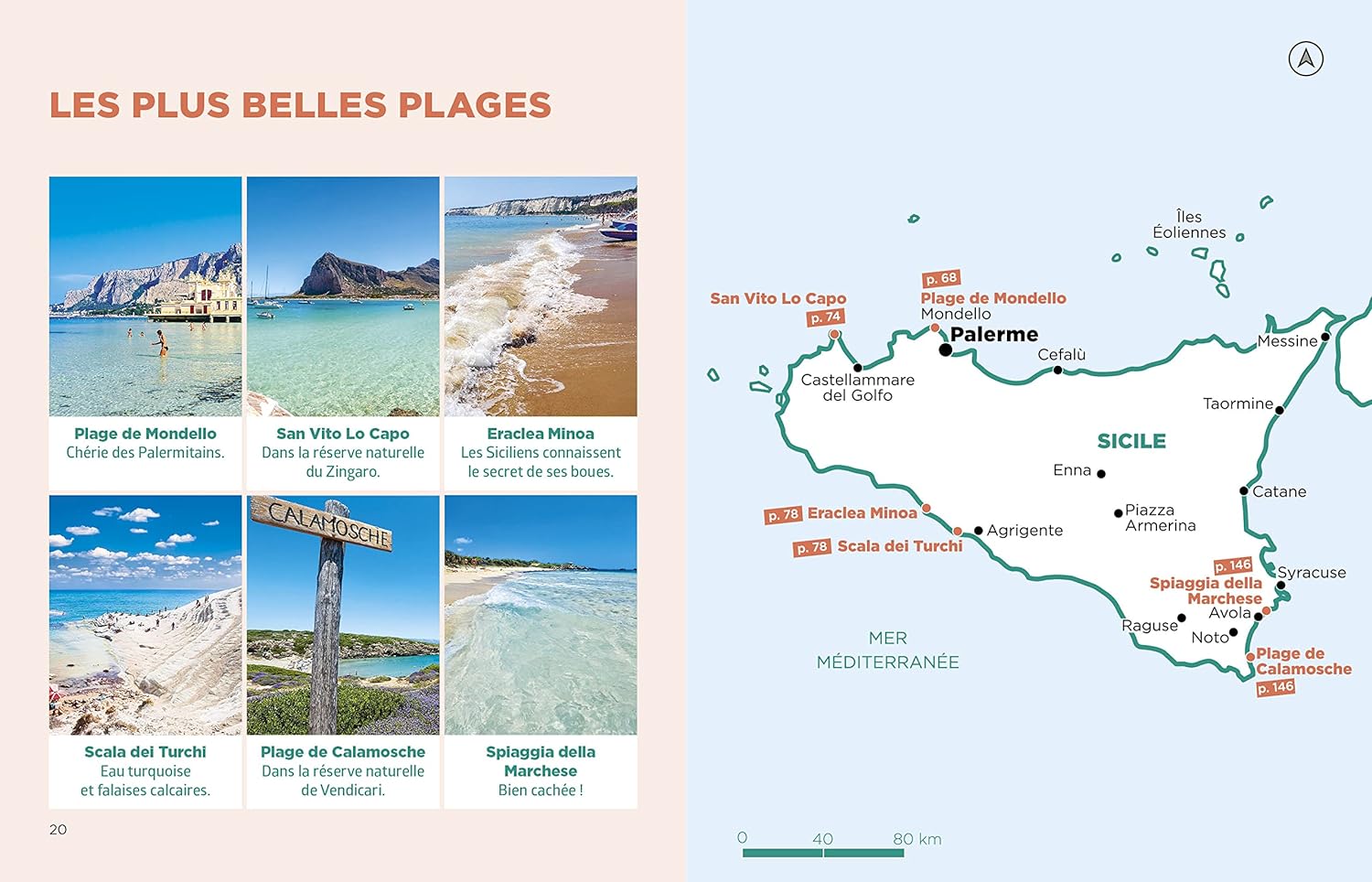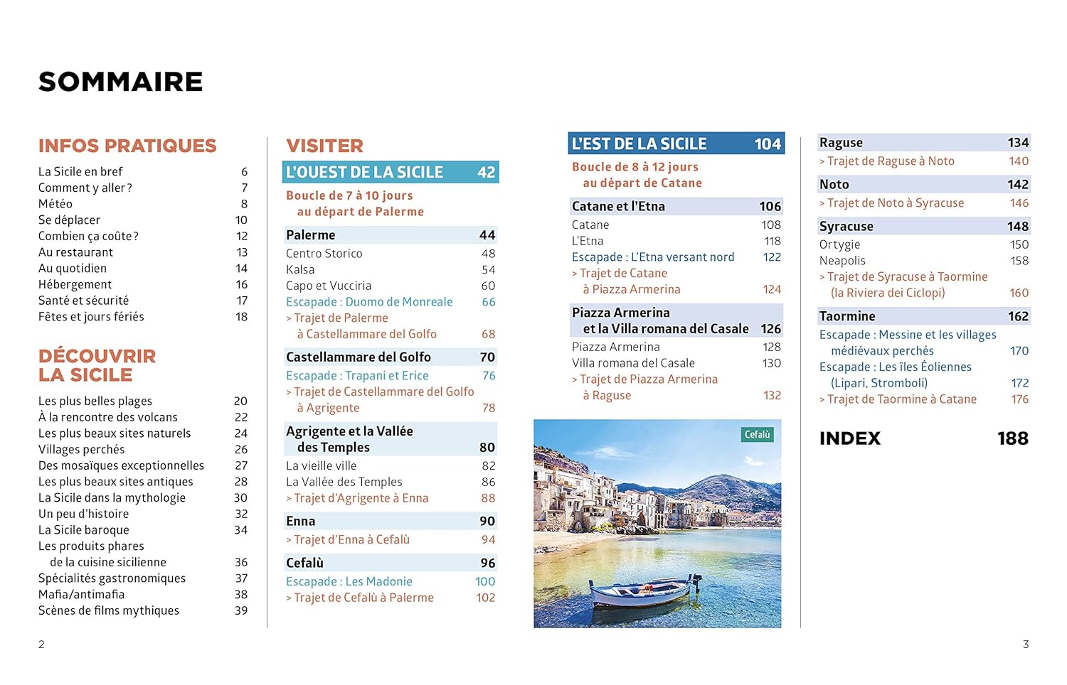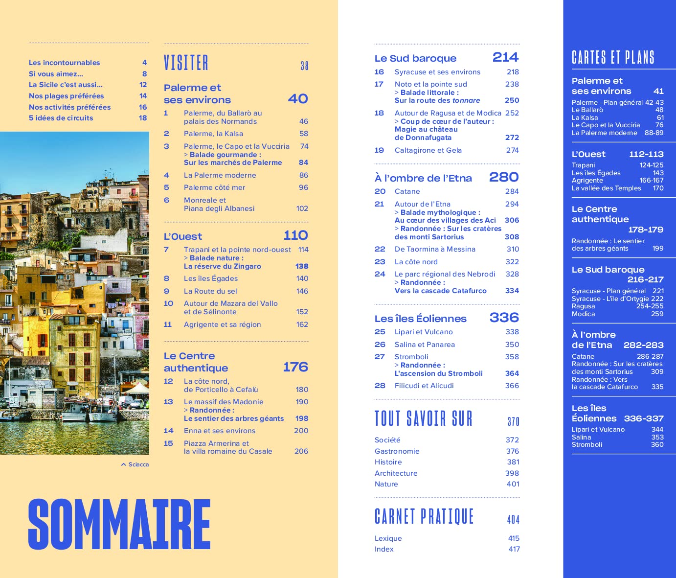 Le guide comporte des pages thématiques qui mettent en valeur les plus belles plages, les sites archéologiques, les volcans, les villages à flanc de colline ou encore les grands espaces naturels de l’île. Sans oublier des recommandations pour apprécier la gastronomie sicilienne, l’artisanat local ou encore les cafés siciliens traditionnels.