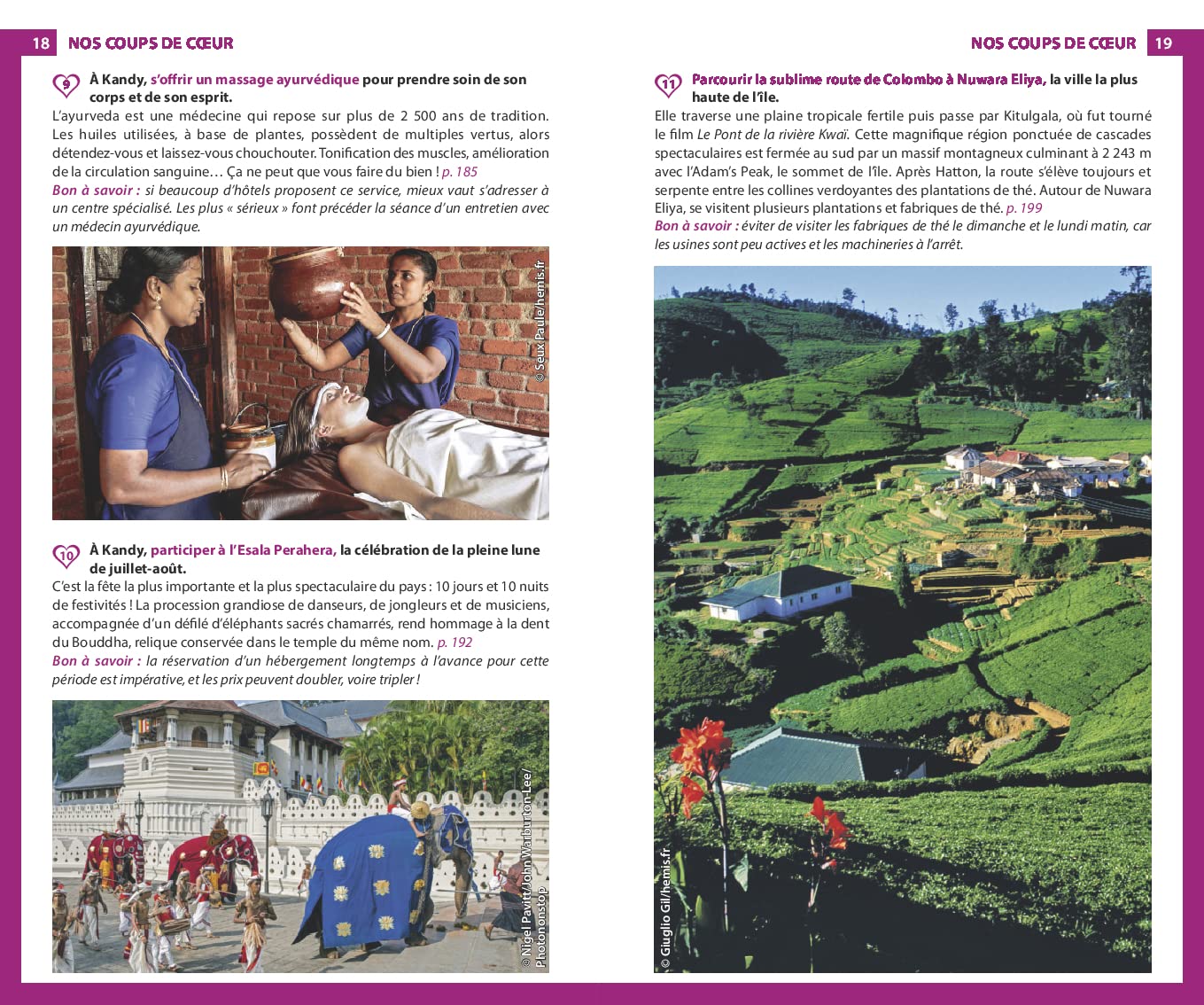 Vous y retrouverez des suggestions de circuits et d’itinéraires pour personnaliser votre séjour, que vous soyez amateur de randonnées, de culture bouddhique, de safari, de médecine ayurvédique, d’architecture ou encore de gastronomie. Le guide renferme par exemple un chapitre dédié à la culture du thé.