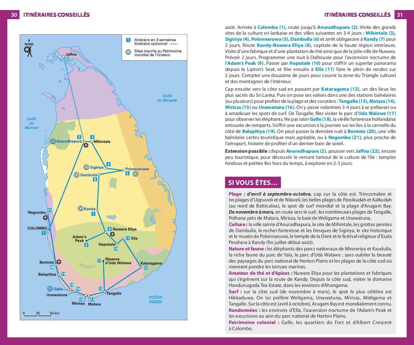 Un guide qui dresse un panorama des lieux incontournables du pays tels que Sigirîya, Anurâdhapura, Polonnâruvâ, la réserve forestière de Sinharâja ou encore le parc national de Yala. Chaque site touristique est coté selon une échelle de 1 à 3 étoiles.