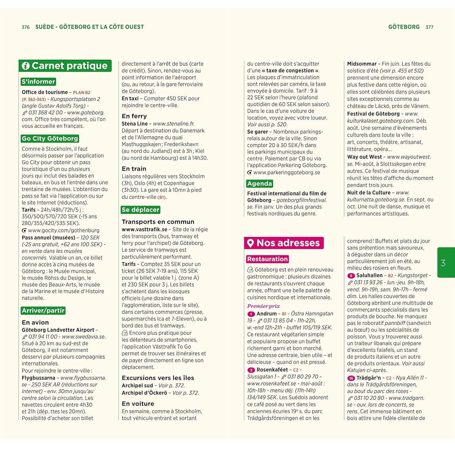 Les auteurs passent au crible la cuisine suédoise, décrivent les spécialités locales, les festivals gastronomiques, etc. Des conseils pour organiser un voyage avec des enfants, ainsi que des activités de plein air pour toute la famille, sont également mentionnés.