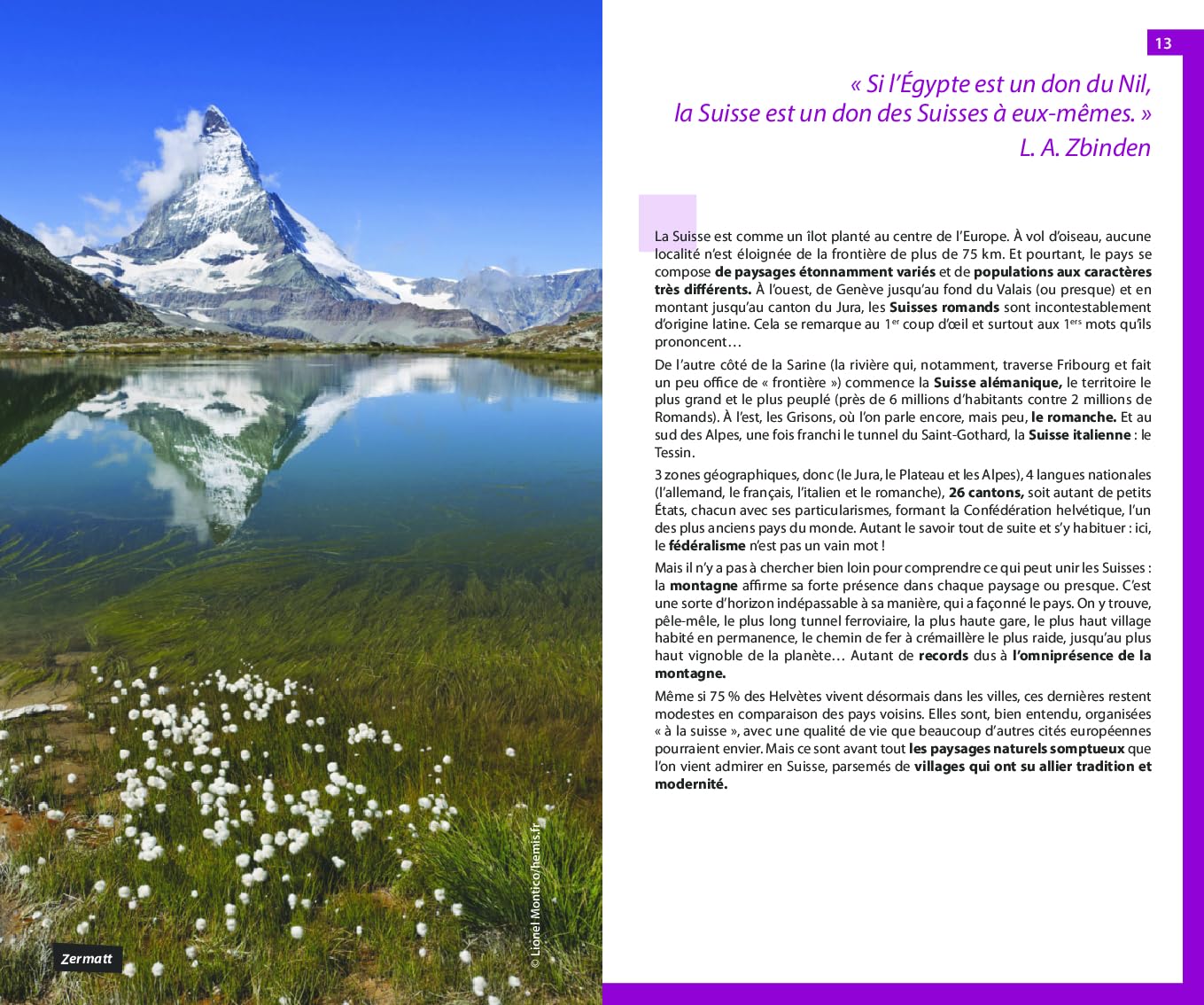 Une véritable immersion dans le pays, avec ses montagnes imposantes, ses lacs scintillants, ses champs luxuriants et ses villes dynamiques. Les amateurs d’art et d’histoire apprécieront les références aux monuments et musées locaux, tandis que les amoureux de la nature trouveront leur bonheur entre balades tranquilles et treks en altitude. Le guide dévoile également la richesse de la vie culturelle suisse, son ambiance conviviale et sa sécurité remarquable.