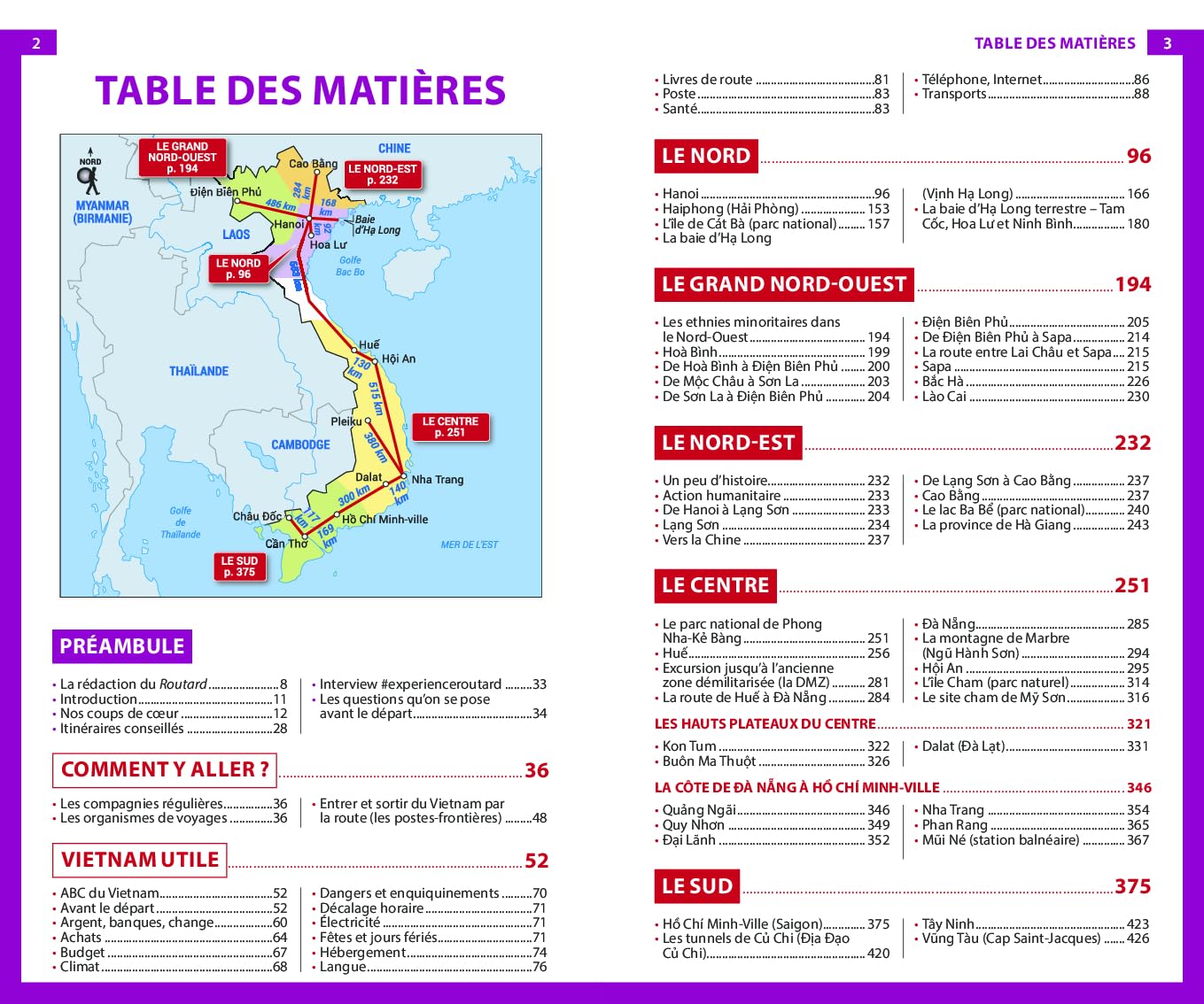 Les auteurs présentent des circuits originaux et astucieux, avec toutes les informations nécessaires pour réussir son périple sans encombre. Des activités originales sont également suggérées, par exemple des randonnées autour de Sapa et Dalat, une visite en barque de la grotte de Phong Nha, un parcours dans les tunnels de Vinh Moc, de la plongée sous-marine autour de l’île de Cham ou encore une croisière en bateau au cœur du delta du Mékong.