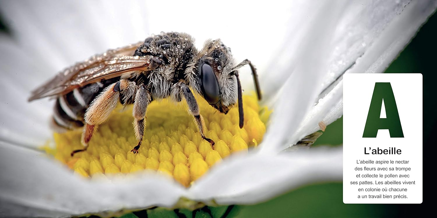 Sur chaque double-page de cet imagier photo tout carton, le petit lecteur trouvera la photo de l’animal, la lettre inscrite en gros caractères et accompagnée du nom de l’animal ainsi que d’une phrase caractéristique de son mode de vie. Chaque photo a été choisie à la fois pour son intérêt graphique, affectif et informatif, tout en privilégiant la diversité des plans et des animaux, où les espèces faciles à identifier côtoient les espèces rares.