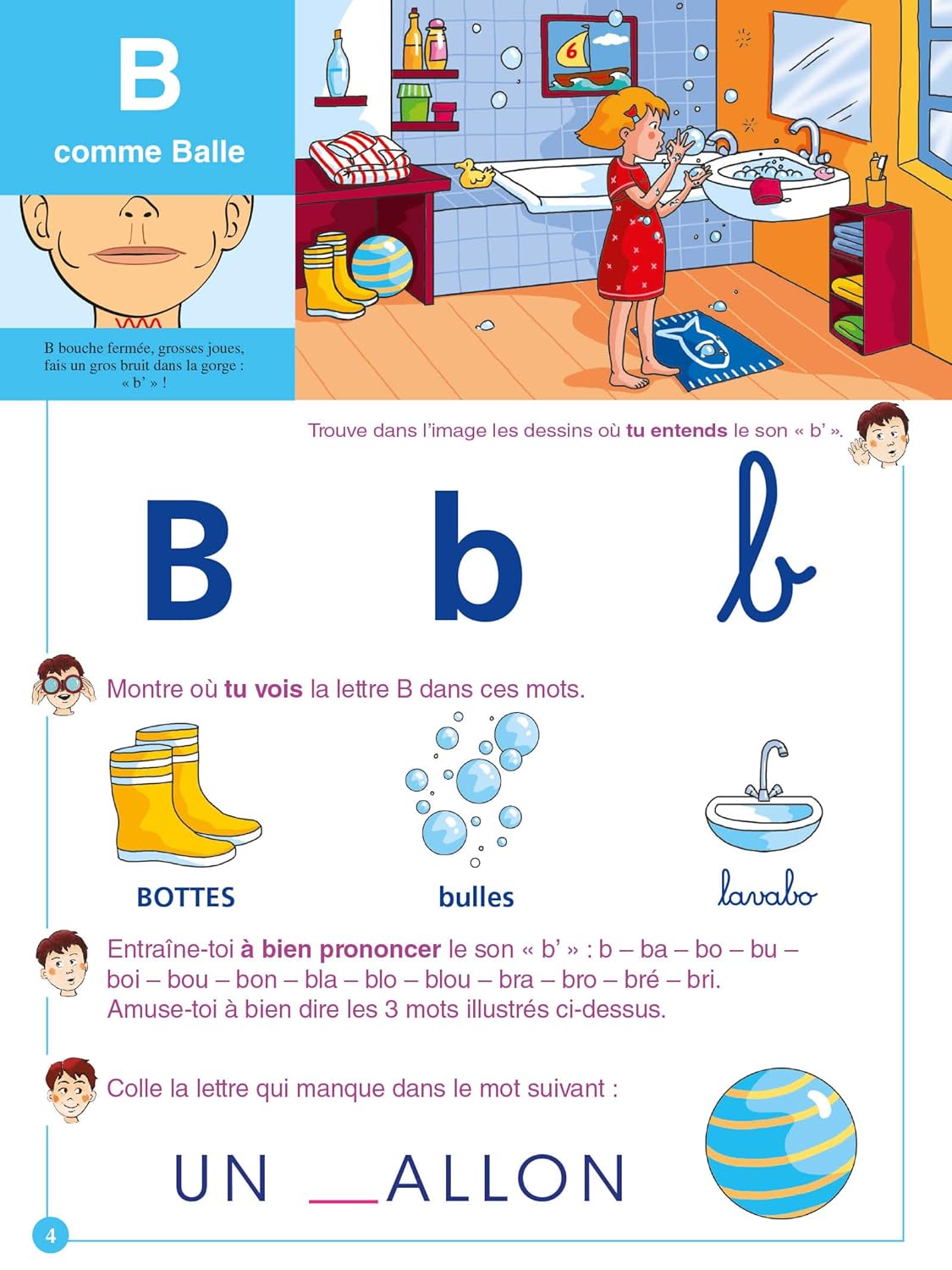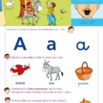 - La lettre, accompagnée d’un mot-clé et d’explications sur le son de la lettre, et d’un dessin illustrant la forme de la bouche pour aider l’enfant à reproduire le son de la lettre ;