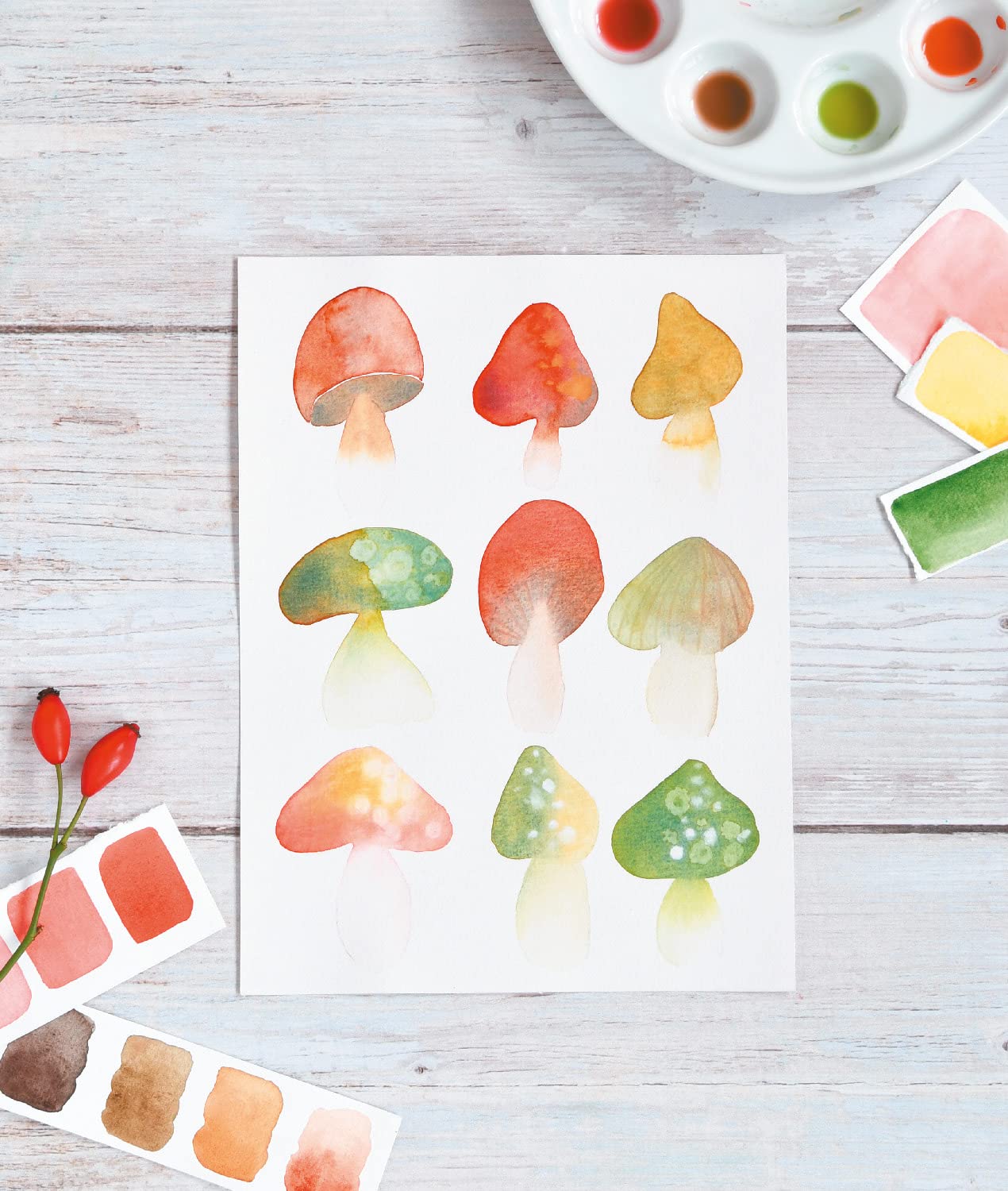 Suivez les conseils et les pas à pas pour saisir en un clin d’œil les subtilités du mélange des couleurs à l’aquarelle. Créez vos propres nuanciers de tons à partir du modèles fourni.
