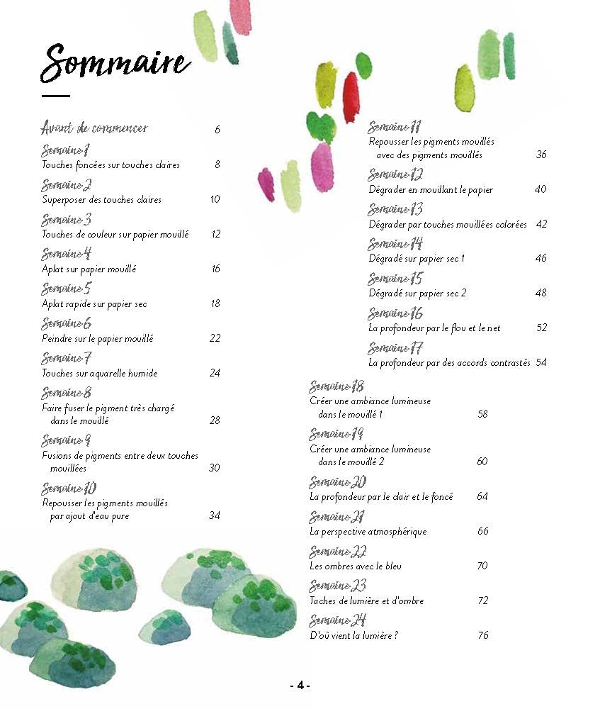 Une véritable initiation artistique aux techniques fondamentales de l’aquarelle. Le débutant y puisera l’essentiel pour partir sur de bonnes bases. La réalisation de 12 projets illustrés et commentés étape par étape (fruits, architecture, chat, paysages divers) lui fera saisir un aspect particulier et concret à chaque fois.