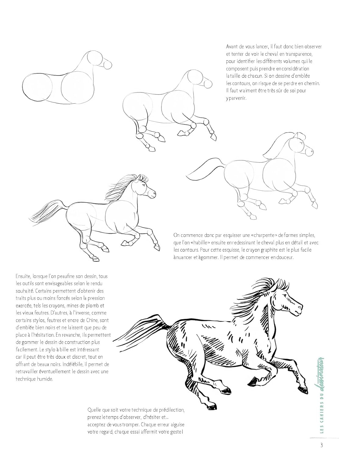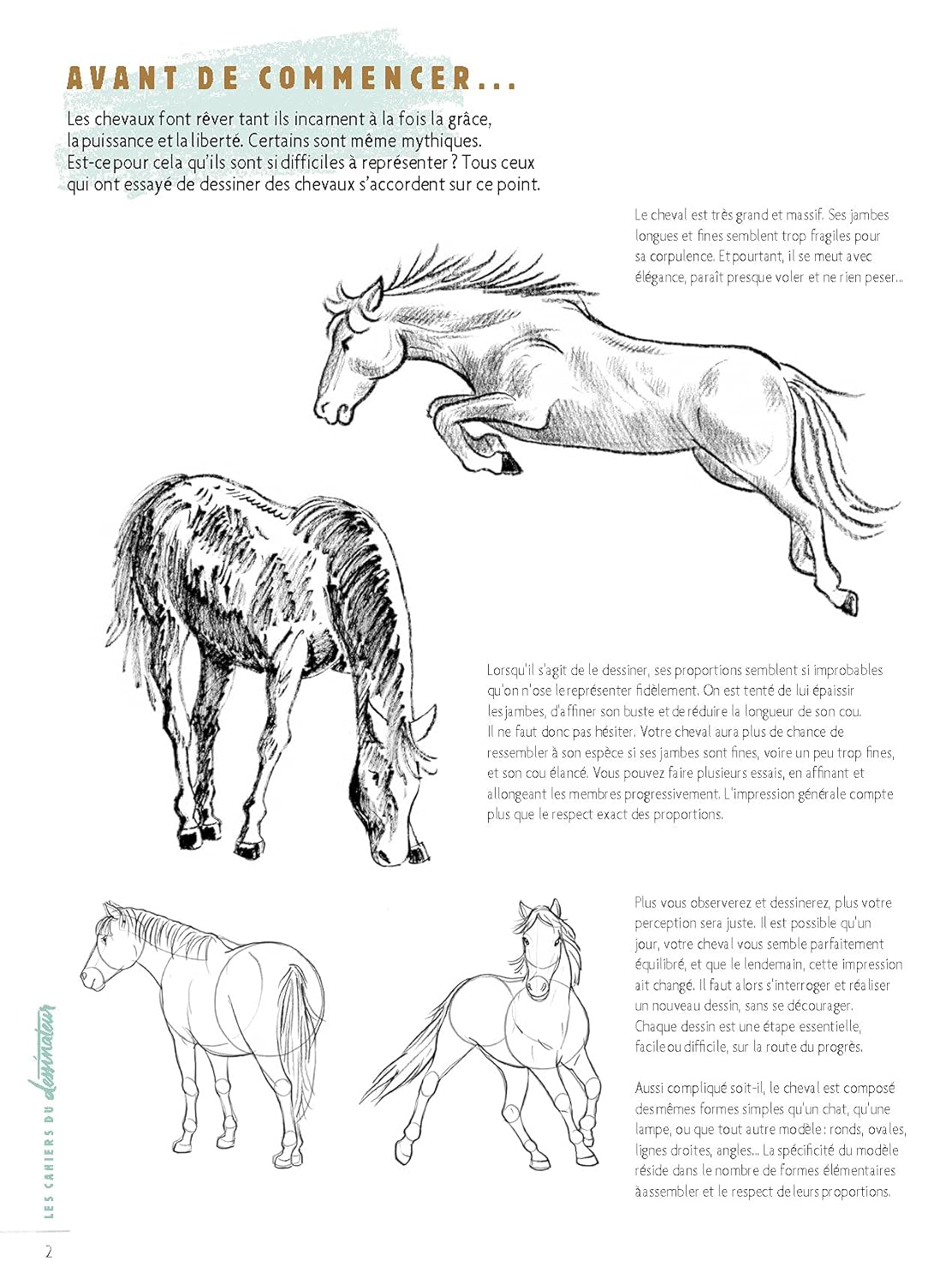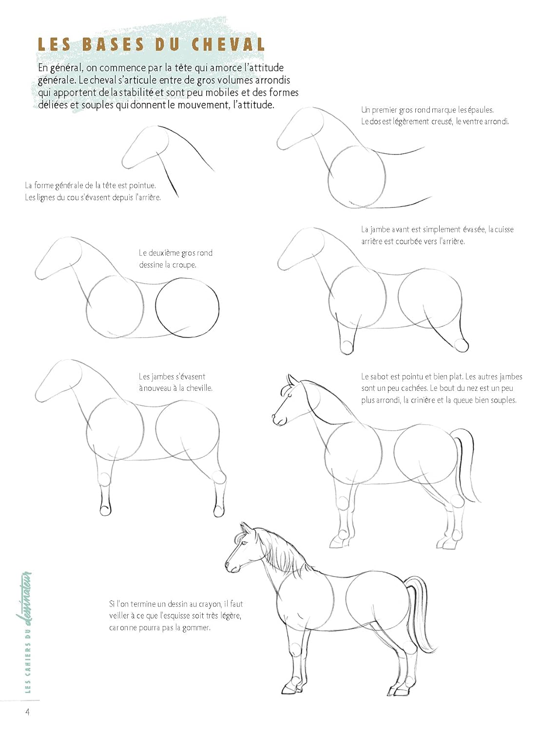 Ce magnifique animal est pourtant composé de quelques formes élémentaires que vous apprendrez bientôt à combiner pour obtenir un dessin réaliste. Représentés dans des attitudes caractéristiques, tous les modèles sont décomposés en 4 à 7 étapes simples.