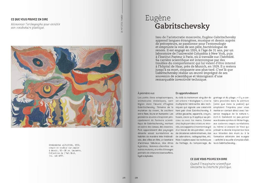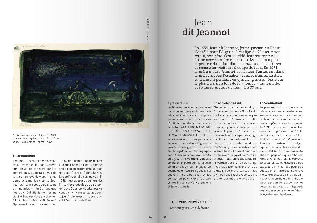 Cet ouvrage se divise en plusieurs catégories qui permettent d’aborder l’art brut dans son ensemble. En effet, la lecture débute par la présentation de 20 artistes phares du mouvement. Accompagné d’illustrations, le livre se découle ensuite sur d’autres notions plus théoriques : L’art brut, c’est quoi ? L’art brut, quel intérêt ? Comment approcher l’art brut ? Aussi, le livre permet de situer l’art brut dans l’Histoire de l’Art, en expliquant au lecteur quelles sont les dates clés, le rapport de l’art brut avec le passé, et beaucoup d’autres choses.