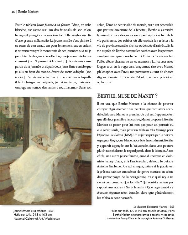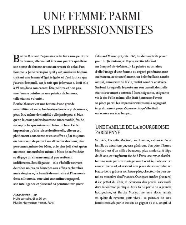 « Berthe Morisot est au cœur – sinon le cœur – de la grande aventure impressionniste. Ni grâce ni muse, mais peintre à part entière dans un univers d’hommes qui admirent son pinceau, sa palette – autant que ses yeux noirs –, elle figure parmi les artistes les plus audacieux de son époque.