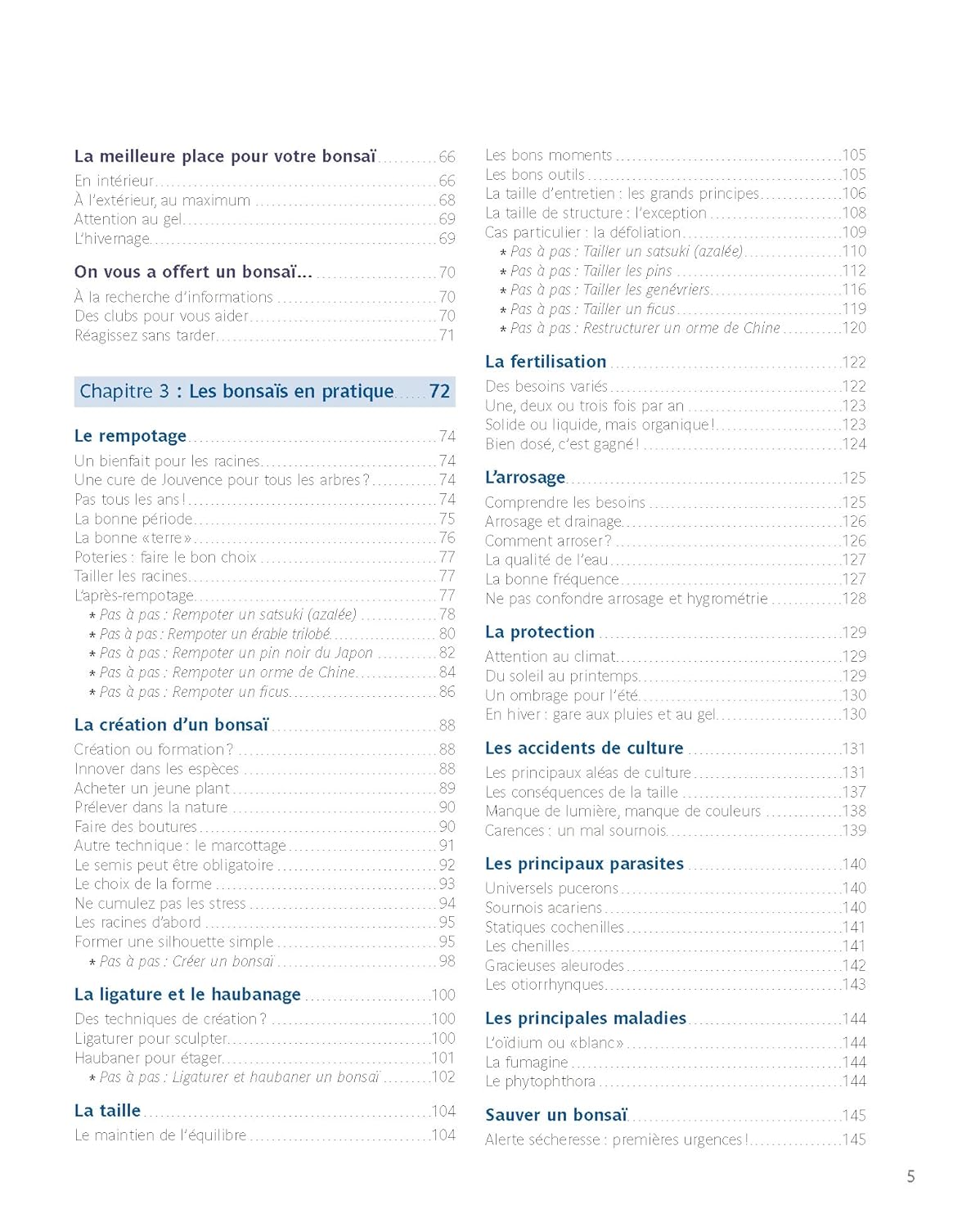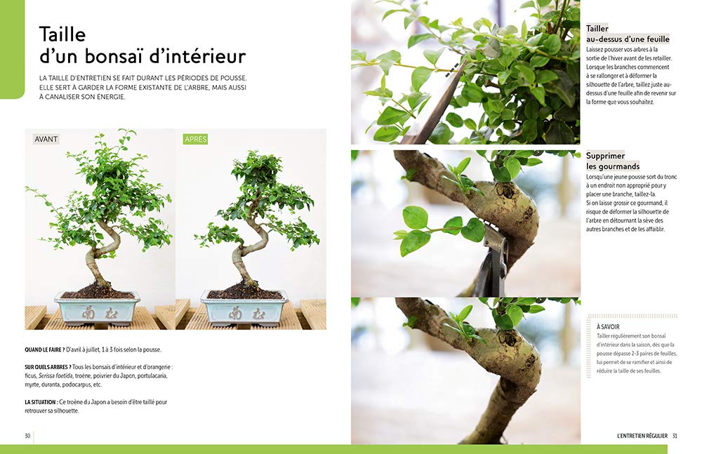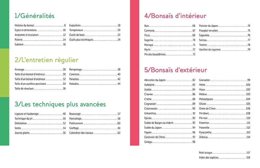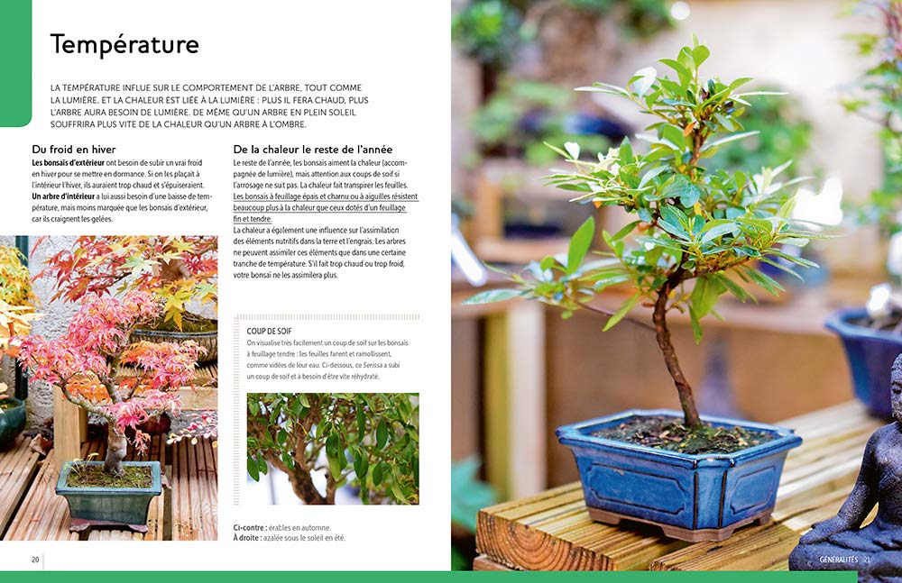 Le chapitre sur les soins explique tout ce qu’il faut savoir pour bien s’occuper de ses arbres (rempotage, fertilisation, installation, multiplication, maladies, etc.), et celui sur le calendrier indique comment veiller sur vos bonsaïs mois après mois.