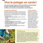 • Des carrés potagers thématiques : Le carré d’aromatiques ; Le carré de melons ; Le carré de tomates ; Le carré de concombre ; Le carré porte-graines ; Le carré de poche ; Un carré pour débutants ; Les demi-carrés adossés.