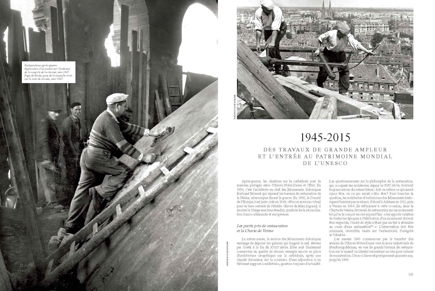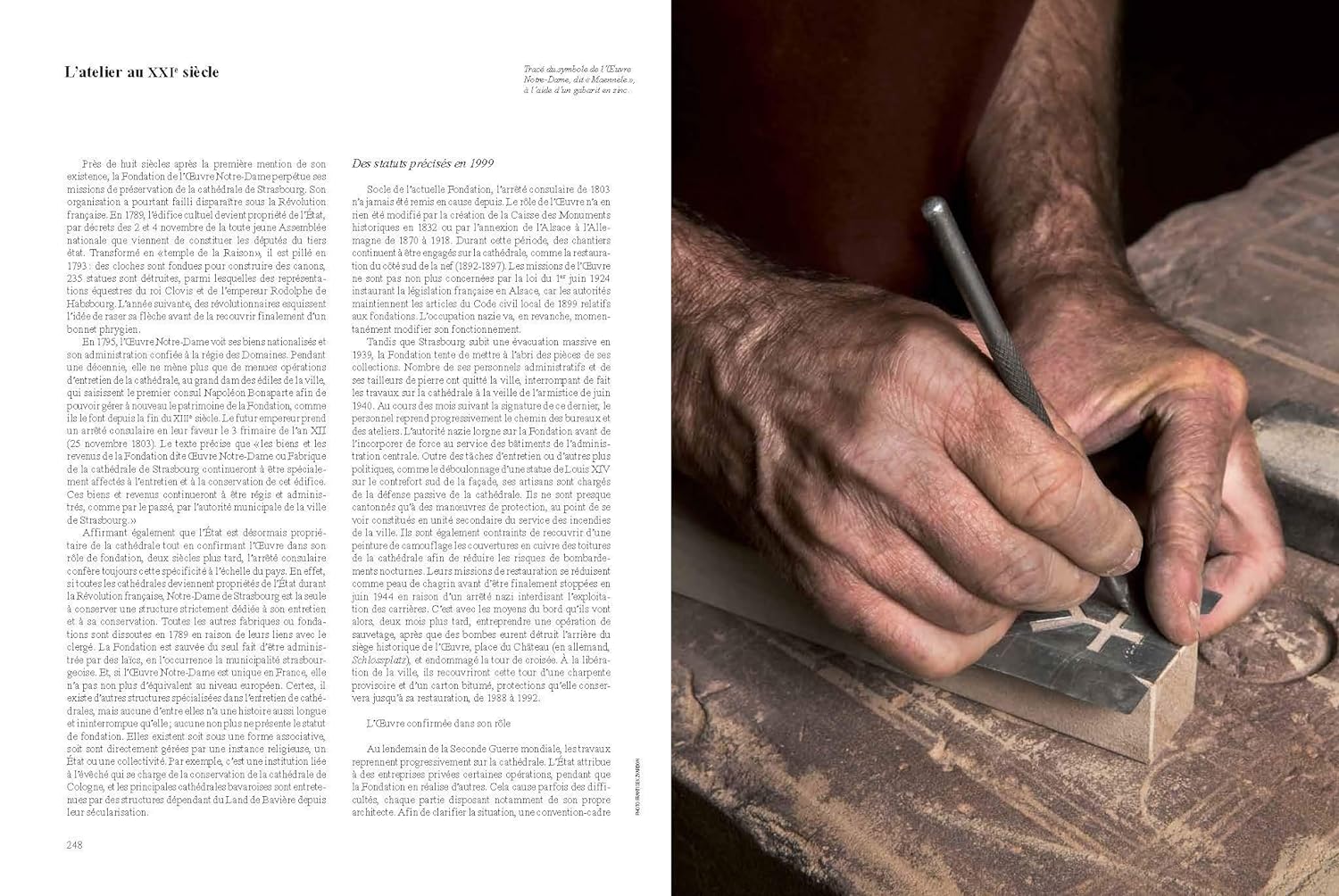 Les bâtisseurs du Moyen Âge à aujourd’hui – Maîtres d’œuvre, tailleurs de pierre, sculpteurs, charpentiers, forgerons, verriers… Qui étaient ces hommes, comment travaillaient-ils, comment vivaient-ils ? Toute l’aventure de la construction de la cathédrale de Strasbourg est racontée : le chantier, les techniques, les matériaux, le financement. De la première cathédrale romane construite par l’évêque Werner à partir de 1015, en passant par le grand chantier, jusqu’à l’achèvement de la plus haute flèche du monde en 1439. S’ensuivent des travaux de restauration, de mise au goût du jour, jusqu’au chantier contemporain mené par la Fondation de l’Œuvre Notre-Dame.