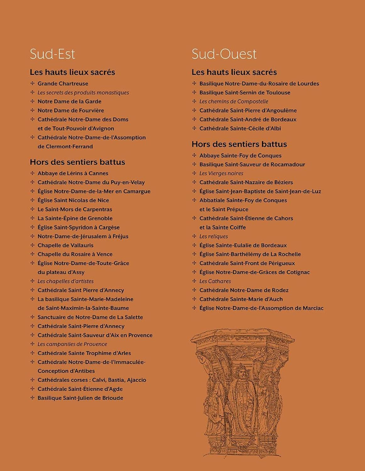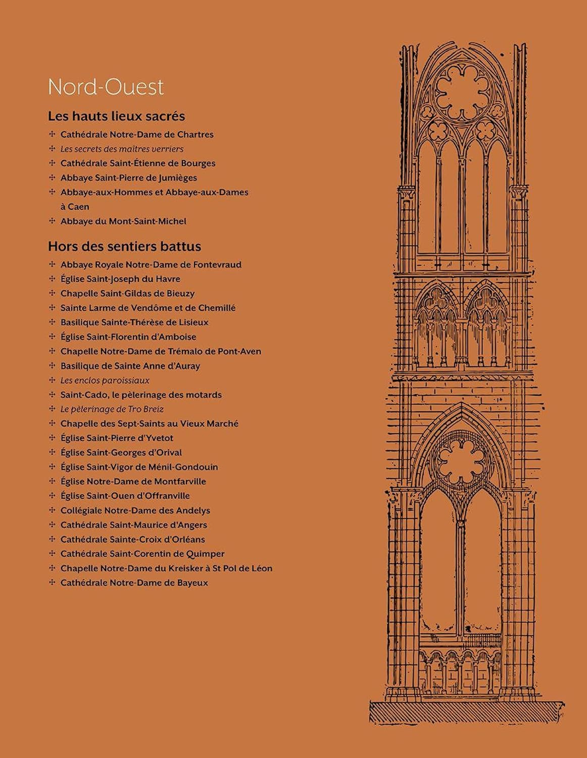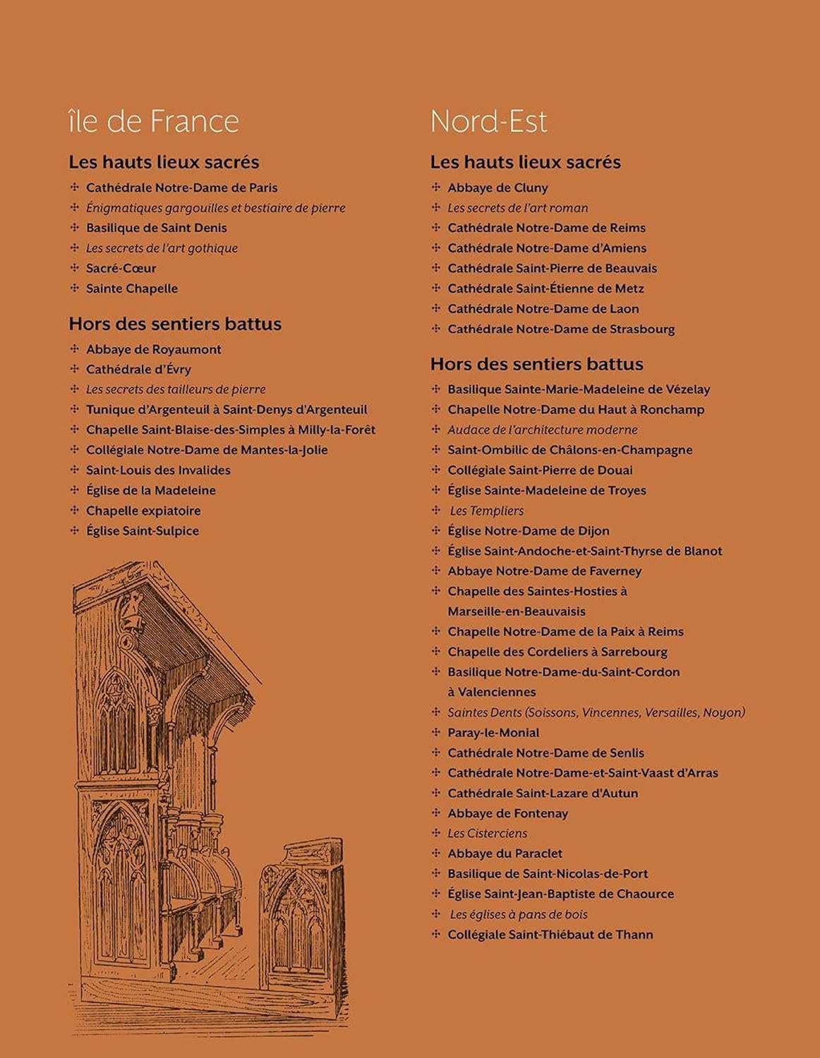 Ce beau livre richement illustré est découpé en 5 parties, dont chacune dévoile les richesses patrimoniales religieuses d’une grande région de France métropolitaine. Chaque région présente des monuments emblématiques (cathédrales, abbayes, basiliques…) et des lieux plus confidentiels, qui se distinguent par une anecdote insolite ou un mystère particulièrement étonnant.