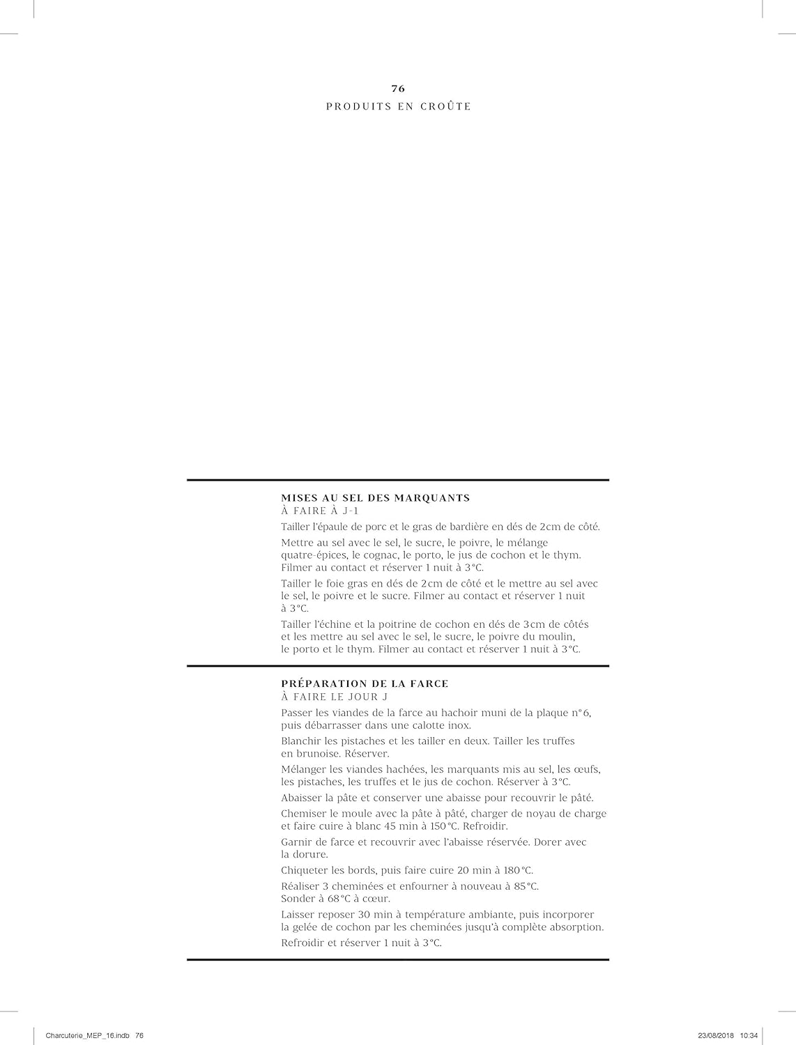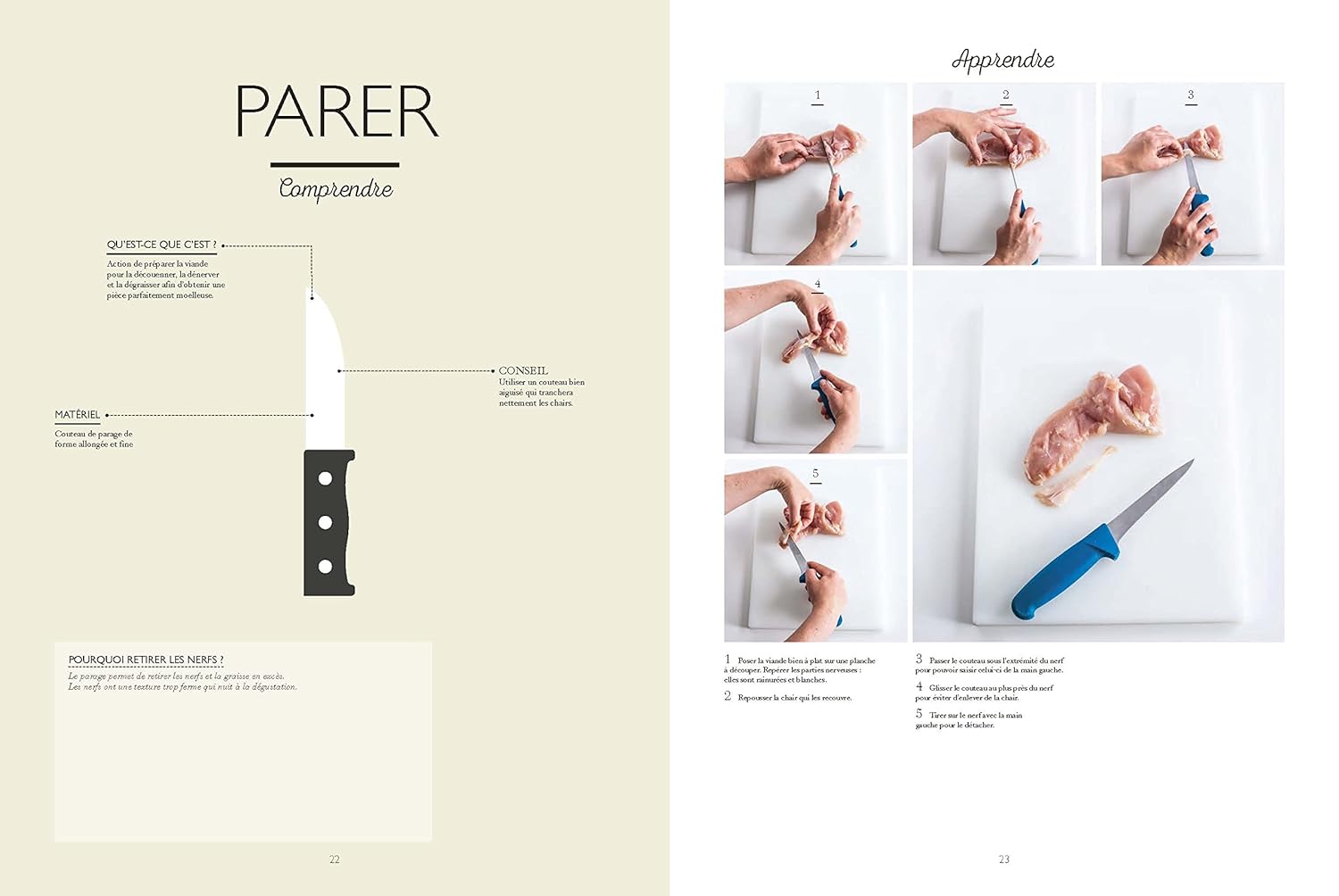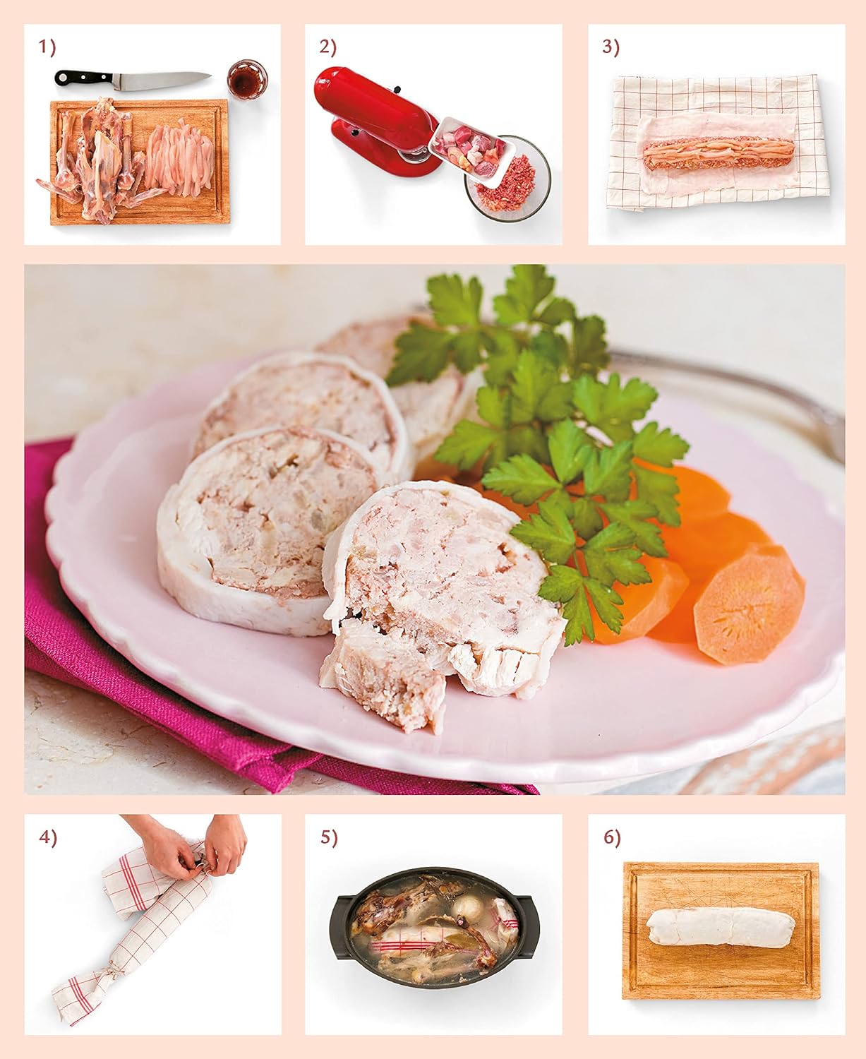 L’ouvrage nous enseigne pas à pas 35 techniques fondamentales. Tailler en lèches (tranches fines), préparer un feuilletage, monter une terrine… Chaque geste est décortiqué. On apprend peu à peu à maîtriser l’art délicat de la charcuterie fine.