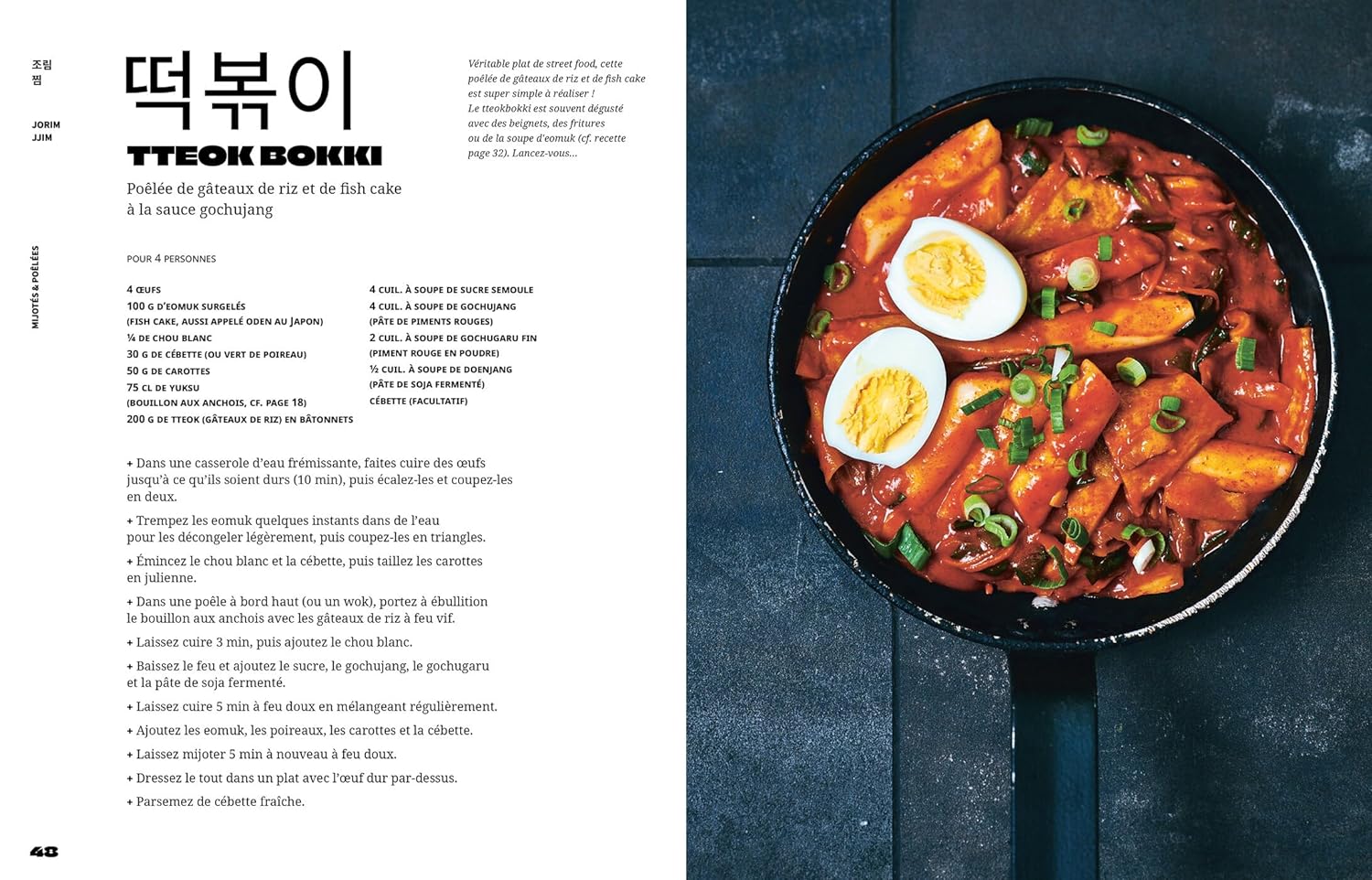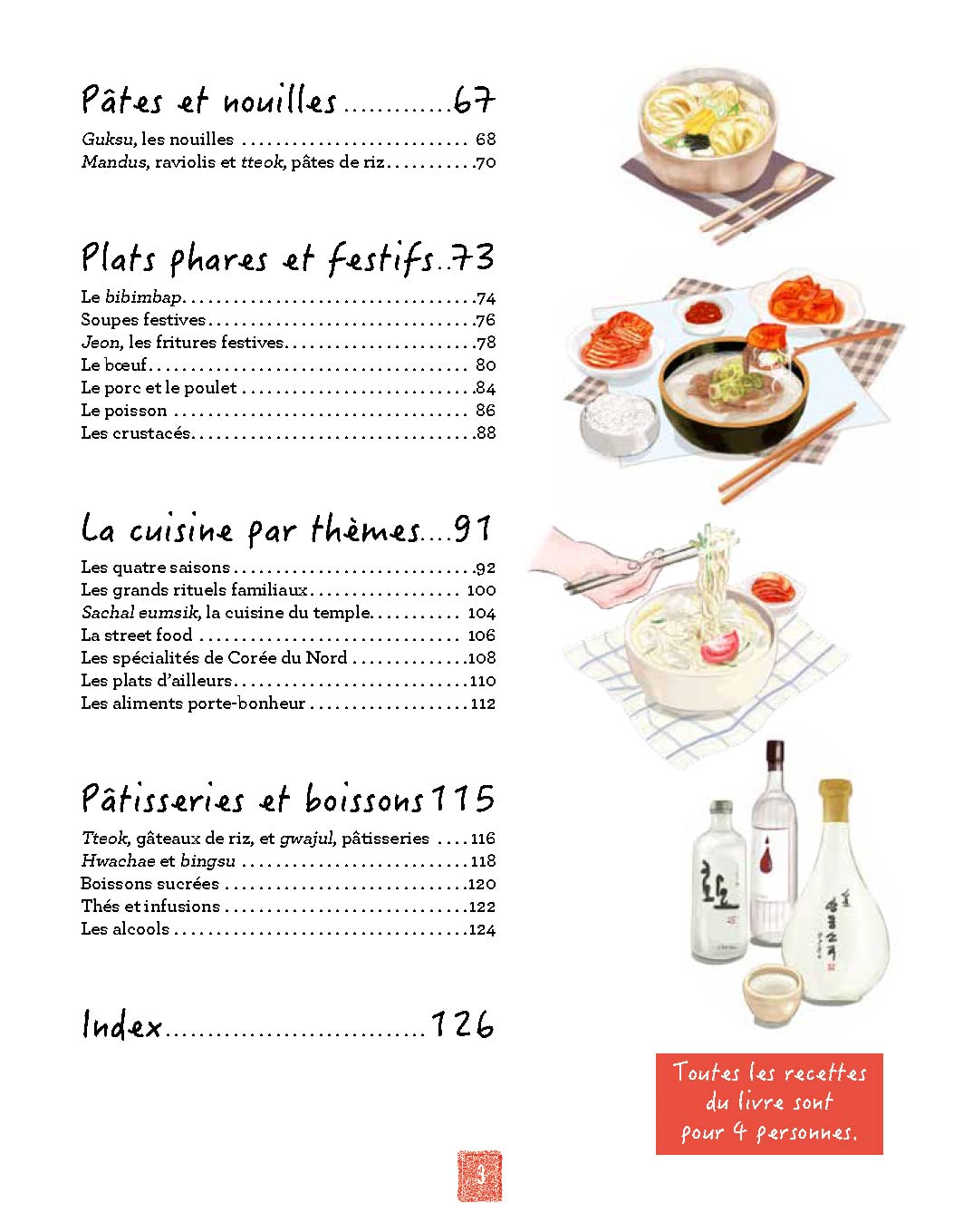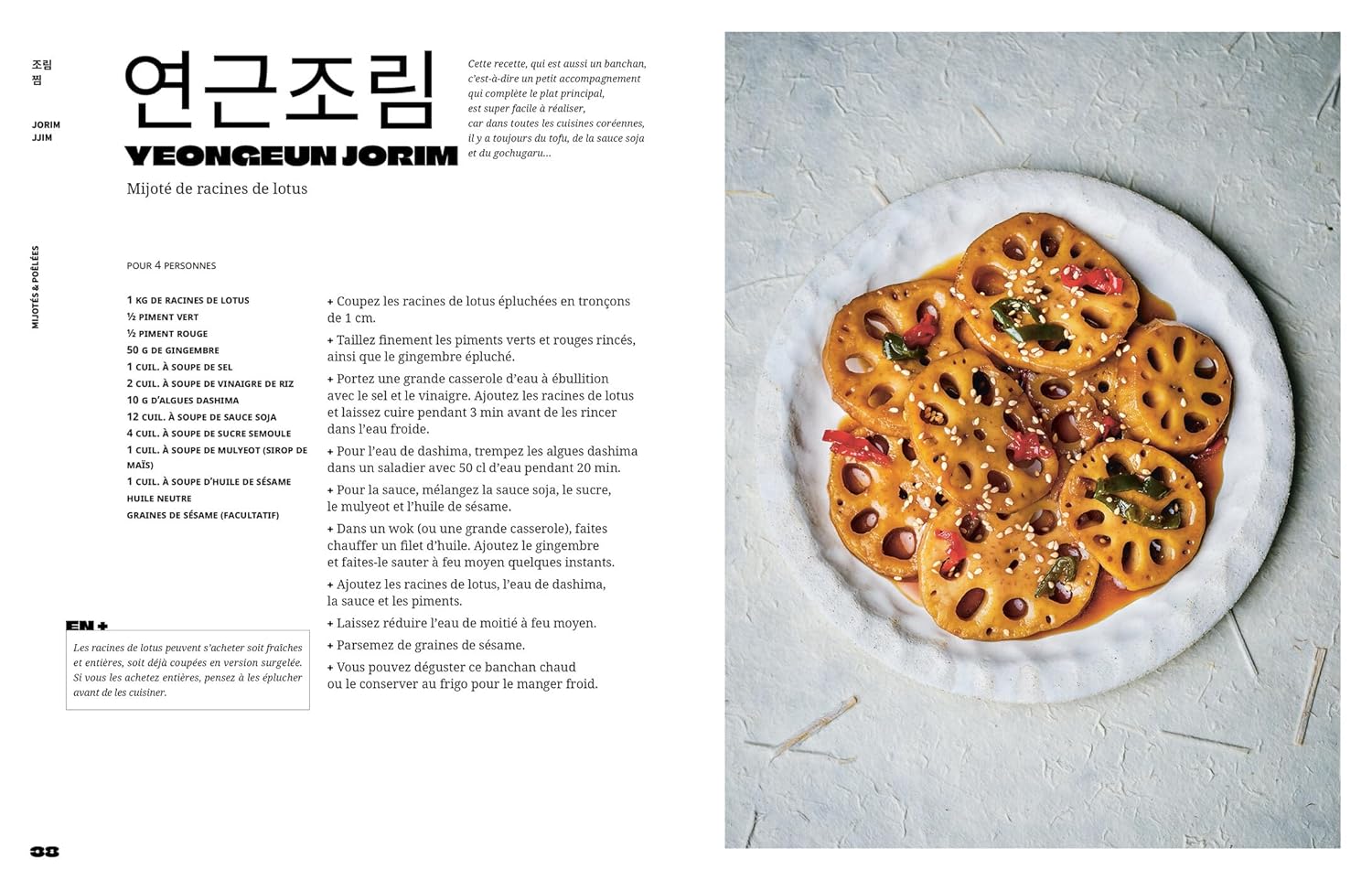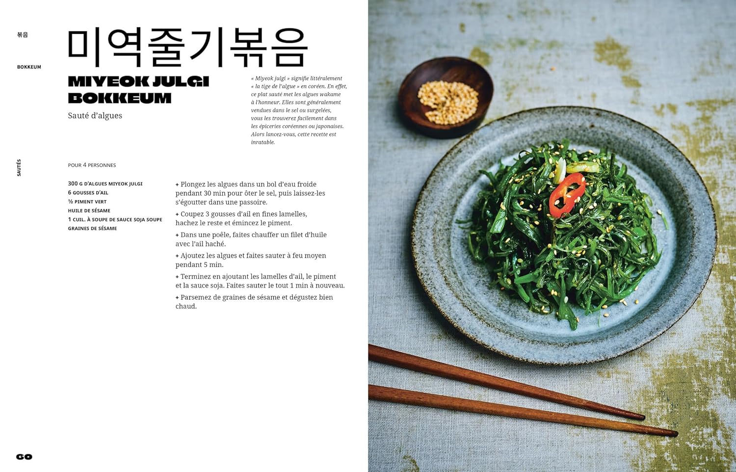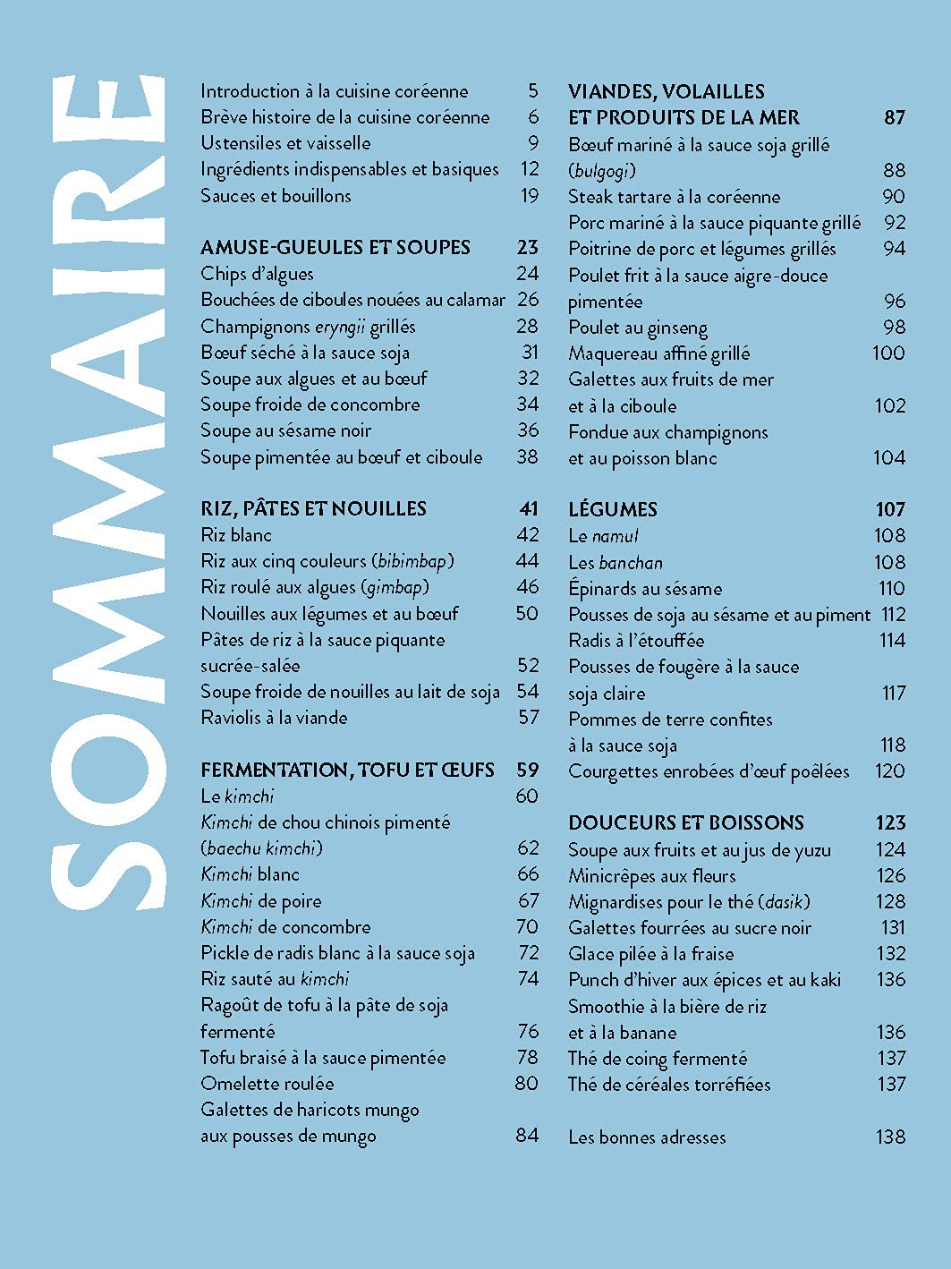 On y découvre bien sûr les classiques (kimchi, bulgogi, bibimbap), mais aussi des plats moins connus. Les recettes sont réparties en sept catégories alléchantes : cuisine de fête, soupes et ragoûts, accompagnements, apéritifs, street food, fusion et desserts.